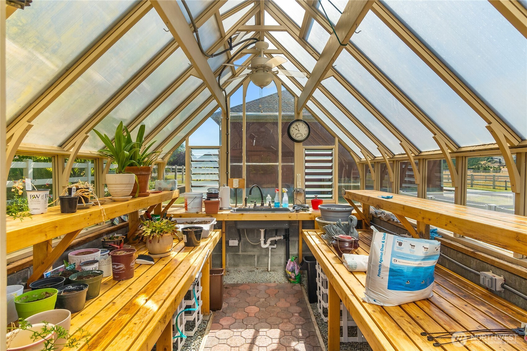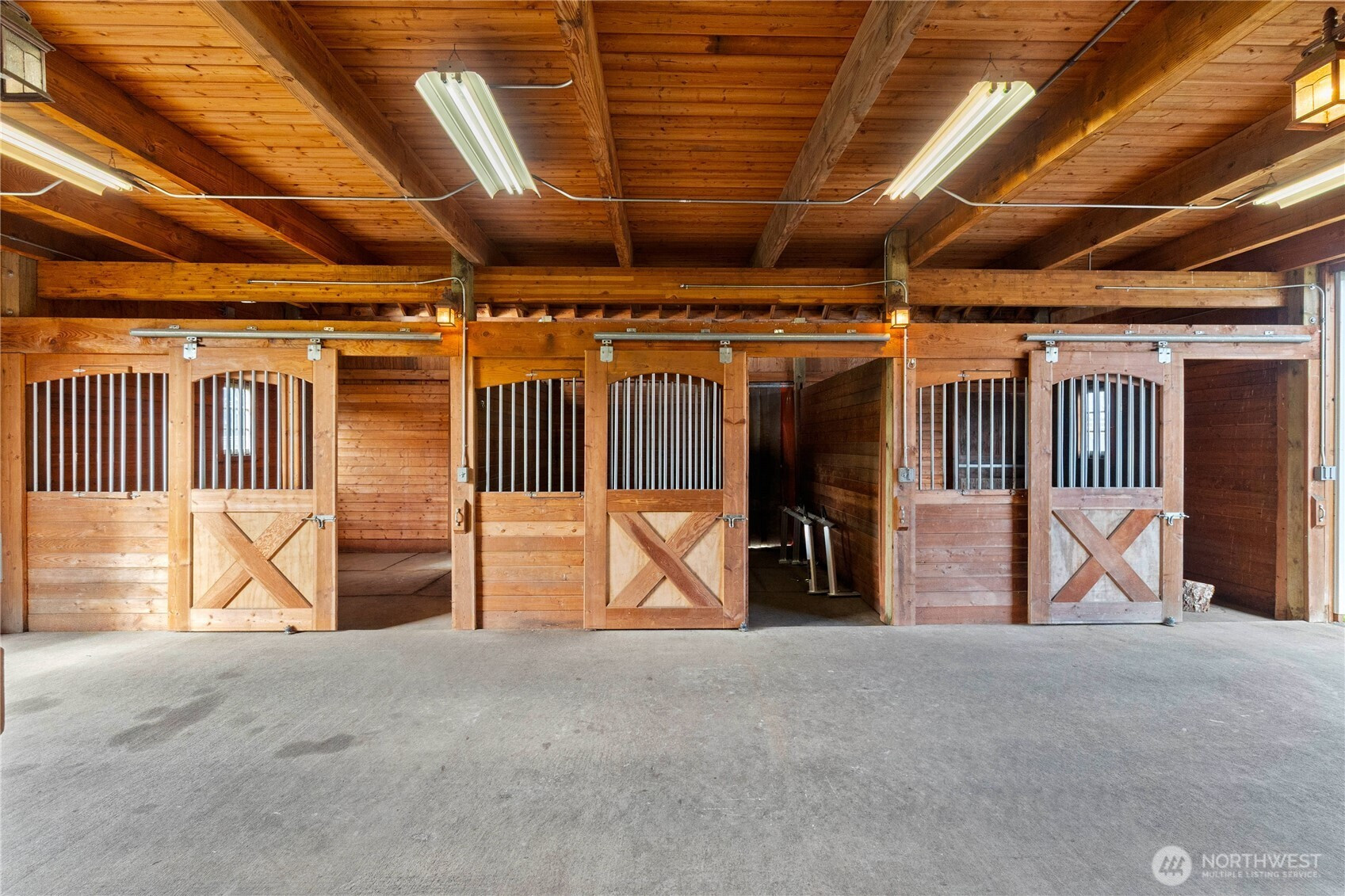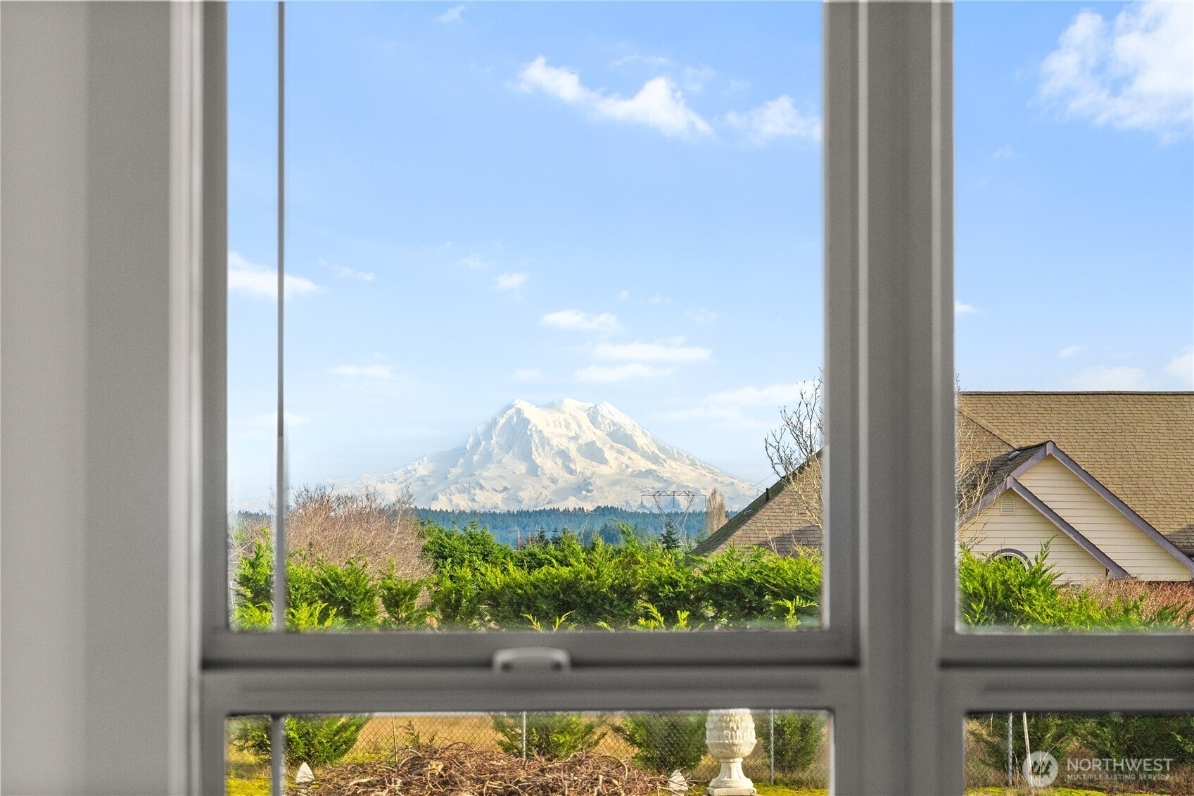 Impeccably maintained brick rambler in an equestrian community on beautifully landscaped acreage with sweeping Mt. Rainier views. Large picture windows frame manicured gardens & fill the home with natural light. A spacious kitchen opens to a gathering room with gas fireplace while an inviting covered patio with skylights offers year-round entertaining. Park an RV or use the detached garage/shop for hobbies or storage. Realize your equestrian dreams in the stunning 4-stall barn with dormer windows, cupolas, loft & drive-through access while you watch your horses graze peacefully in PVC fenced fields. A charming greenhouse, mature trees & stonework add privacy & appeal. NEW roof/interior paint/carpet. Every detail shows quality & care.