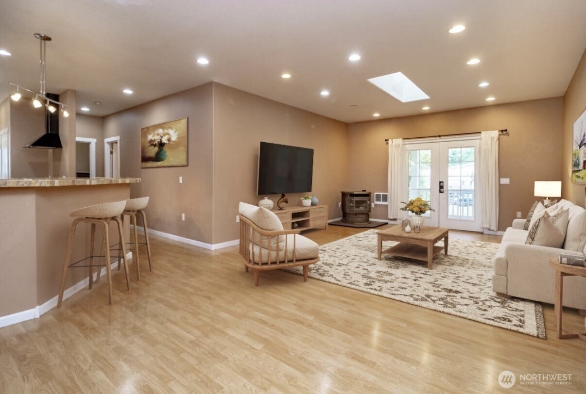 Charming 3 Bedroom 1.75 Bath Rambler located on a private dead-end street. Enjoy the light filled open concept living room with a cozy pellet fireplace, dining room & 9 ft ceilings throughout. The expansive kitchen offers granite counters, pantry & eating space—ideal for gatherings or everyday living. The spacious primary suite is privately separated from the other bedrooms & includes a ¾ bath & walk-in closet. Additional bedrooms also include walk in closets. Step outside to a covered wrap-around Trex deck for year-round enjoyment. A detached 1,088 sq ft SHOP provides space for storage or hobbies. Additional features include a ramp, french doors, gated driveway, fenced backyard & no HOA. Located 5 minutes from I-5 & JBLM. Move in Ready!