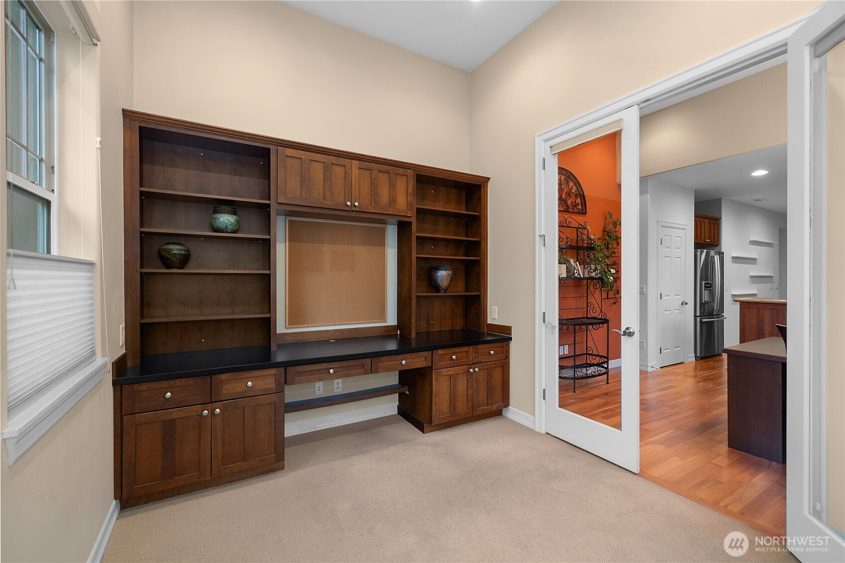 This must-see home along the 12th Fairway offers over $65,000 in upgrades, including a new heat pump & furnace. Relax in a beautifully appointed great room featuring new carpet, an upgraded gas fireplace, & striking golf course views. Enjoy a kitchen with quartz counters, full backsplash, gas oven, upgraded cabinets, pull-out shelves, & a dining space filled with natural light. The den impresses with 12ft ceilings, French doors, & a custom built-in. The primary suite offers wooded privacy, Roman blackout blinds, new carpet with memory foam pad, & a remodeled bath with marble counters & a full tile steam shower. Custom closet systems elevate both closets. Outside, enjoy sweeping fairway views and a serene side yard with secret-garden charm.