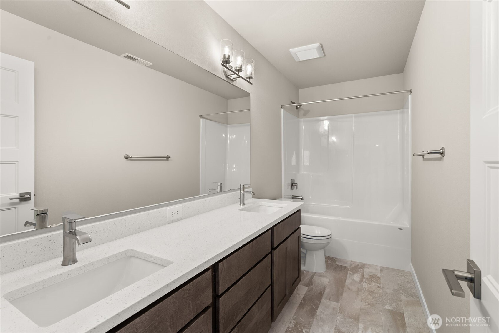 Under construction with an estimated completion of May 2026. The Poplar plan offers generous space for everyone. 2,692 square feet featuring a 3-car garage and a serene, wooded backdrop! Home features include extensive hardwood flooring, white millwork, wood wrapped windows on the main level, maple cabinetry, and solid surface quartz countertops. The kitchen showcases shaker-style, charcoal-stained maple cabinets paired with stainless steel appliances, and a convenient main-level den or office. Upstairs you'll find five roomy bedrooms, including a gorgeous primary suite with a double-sink vanity topped with quartz, a soaking tub, tile floors, and a walk-in closet. Quartz surfaces are found throughout, and the upstairs laundry room adds extra convenience. The fully landscaped & fenced yard offers views of a serene natural backdrop. Energy-efficient touches include an electric hybrid water heater, a heat pump with heating and cooling, and solar panels. Built by a local builder with over 35 years of experience. Ideally located minutes from I-5 and the Hawk’s Prairie shopping area and just a short commute to JBLM (Joint Base Fort Lewis McChord). Photos virtually staged or from a similar finished home.