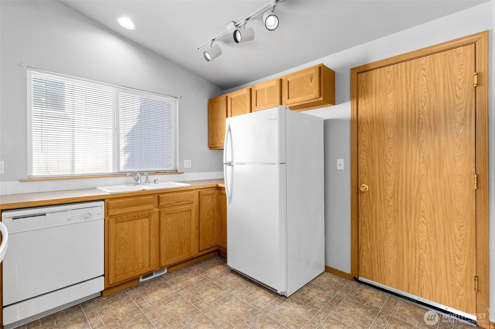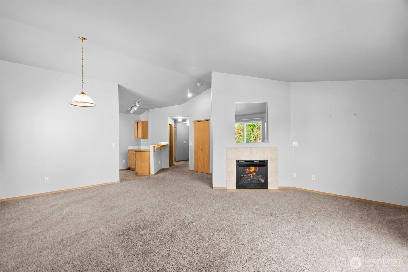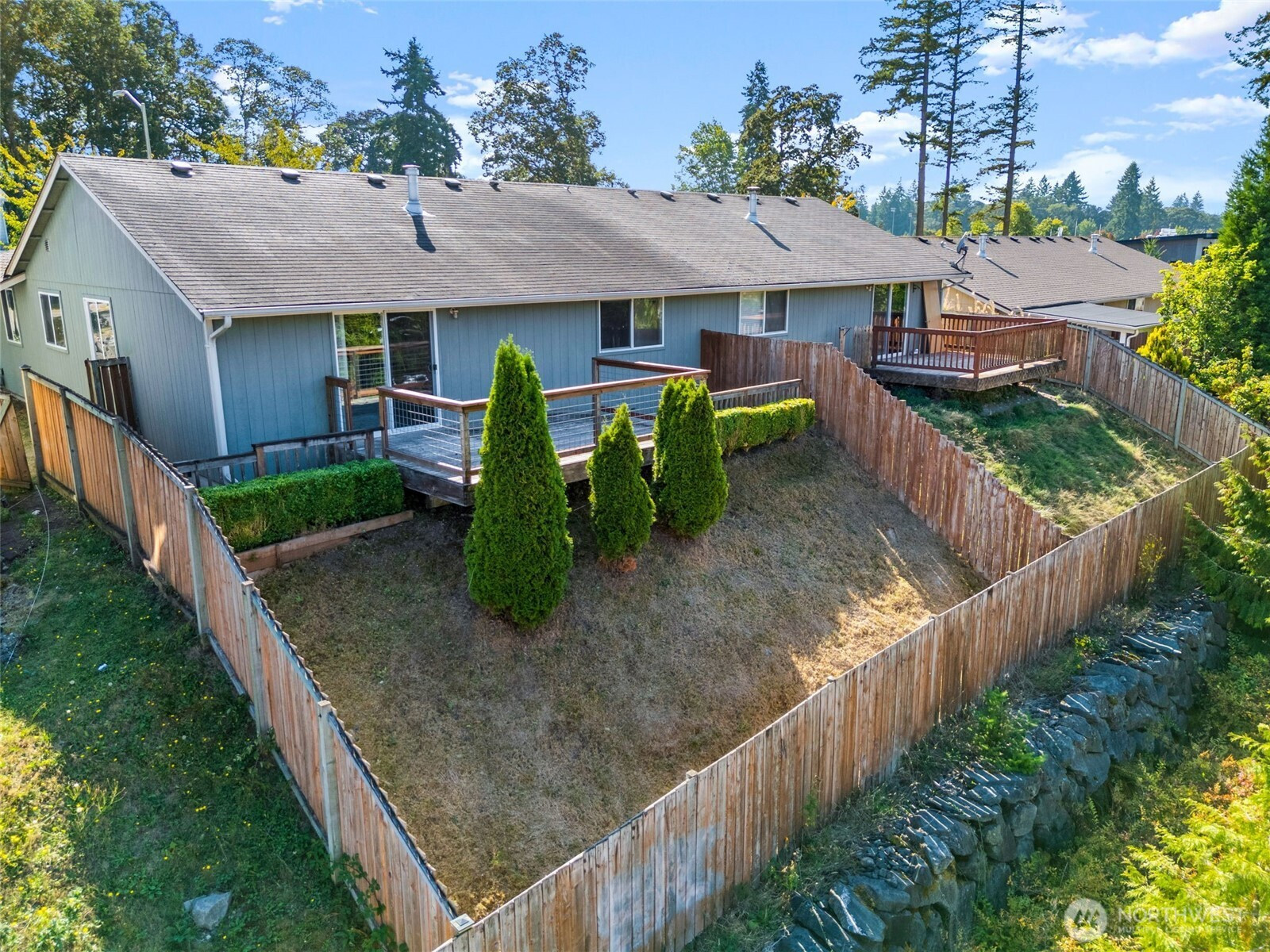 Move-in ready rambler with a welcoming tile entry opens to a spacious vaulted living and dining area featuring a cozy gas fireplace, and sliding doors to rear deck. The kitchen boasts abundant counter space, low-maintenance laminate surfaces, warm honey oak cabinetry, a oven, and generous storage. The primary suite includes a full bath and walk-in closet, with two additional bedrooms, a full guest bath, and laundry room complete the interior. Outside, enjoy a fully fenced backyard with an entertainer’s deck, patio, and lawn area below the slope. Attached 2-car garage plus driveway parking. It is conveniently located just minutes from I-5, JBLM, shopping, parks, trails, and the Regional Athletic Complex!