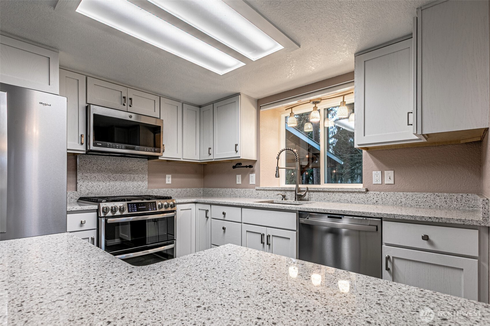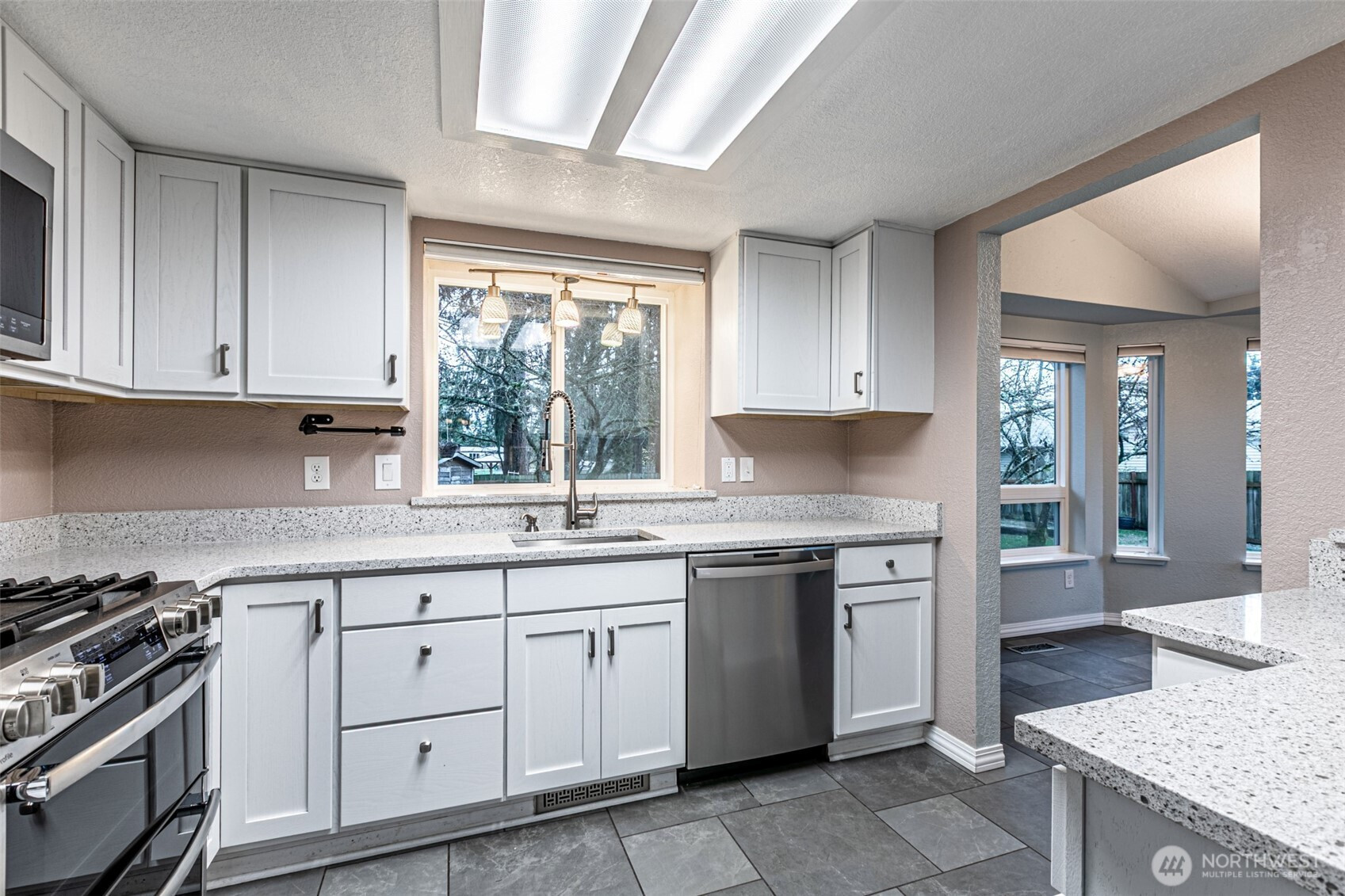 Updated tri-level on a spacious, fenced lot in Meridian Acres! Light-filled living spaces with vaulted ceilings, refreshed kitchen with white cabinetry and quartz counters, and remodeled baths including a tiled shower. Newer heated tile flooring in the living room, kitchen and dining room, fixtures, and finishes throughout. Enjoy the covered patio, mature trees, storage shed, and room for RV parking. Quiet cul-de-sac, close-in location and quick commute to JBLM.