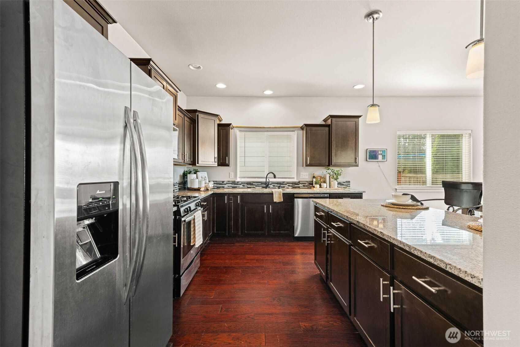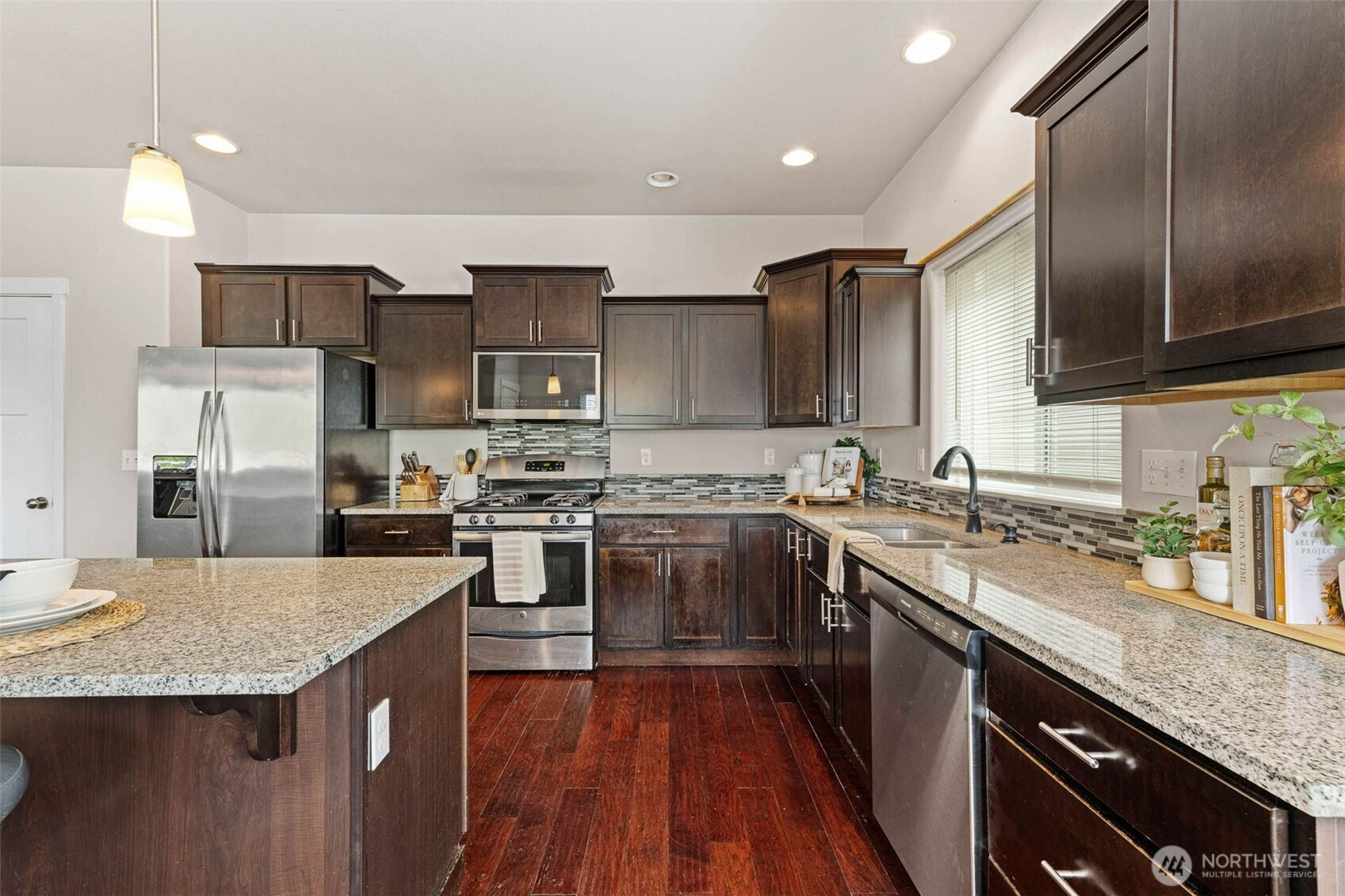 Welcome home to an inviting retreat perfect for both comfort (AC!) and entertaining! The open floor plan features a spacious island with eating bar, walk-in pantry, and SS appliances with a natural gas range for the home chef. A main-floor office/4th bedroom adds flexibility, while the upstairs primary suite offers dual closets, a spa-like 5-piece bath, and sweeping views. Enjoy privacy with no back neighbors! The fenced backyard with partially covered patio and the charming front porch make outdoor living easy. With a community park across the street and quick access to JBLM, Yelm, and Olympia, this home checks every box!