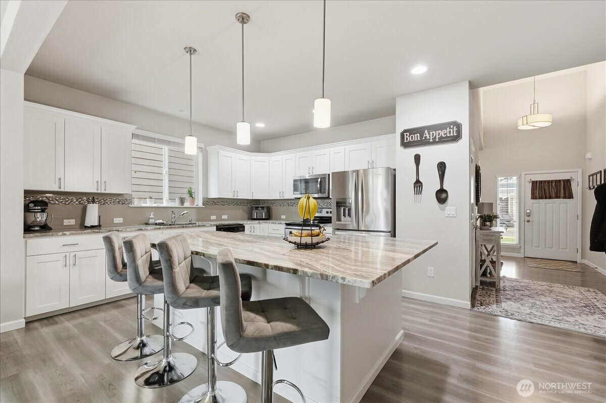 2470 SF 4 bedroom 3 bath with Primary Bedroom Suite on main floor. Great Room main floor plus Bonus Room 2nd floor.Vaulted ceilings expansive laminate wood floors and covered back patio with gourmet kitchen featuring white shaker style cabinets and crown molding. SS appliances, quartz kitchen counter tops. Best price for 4/3 2470 SF in the area!!