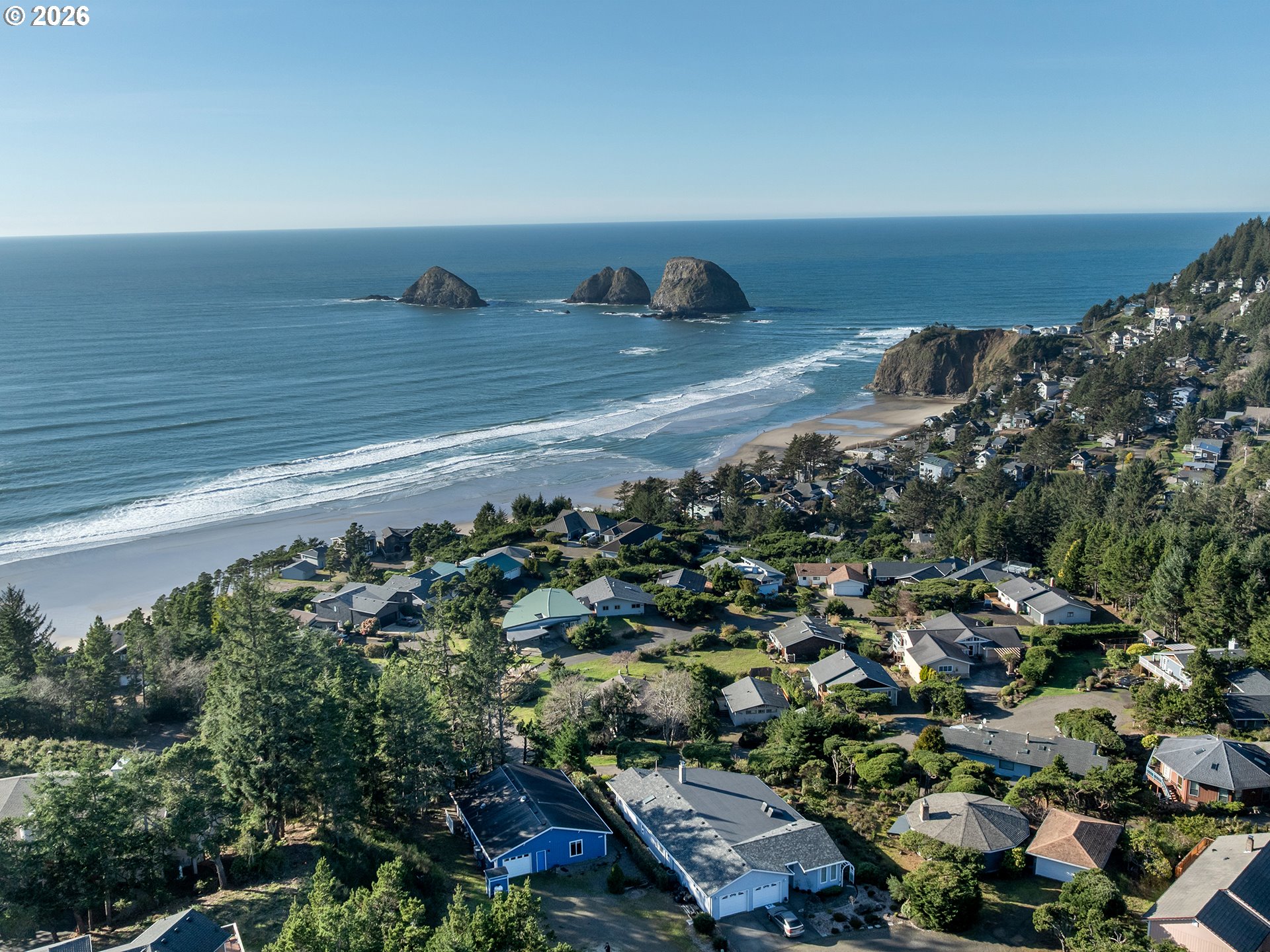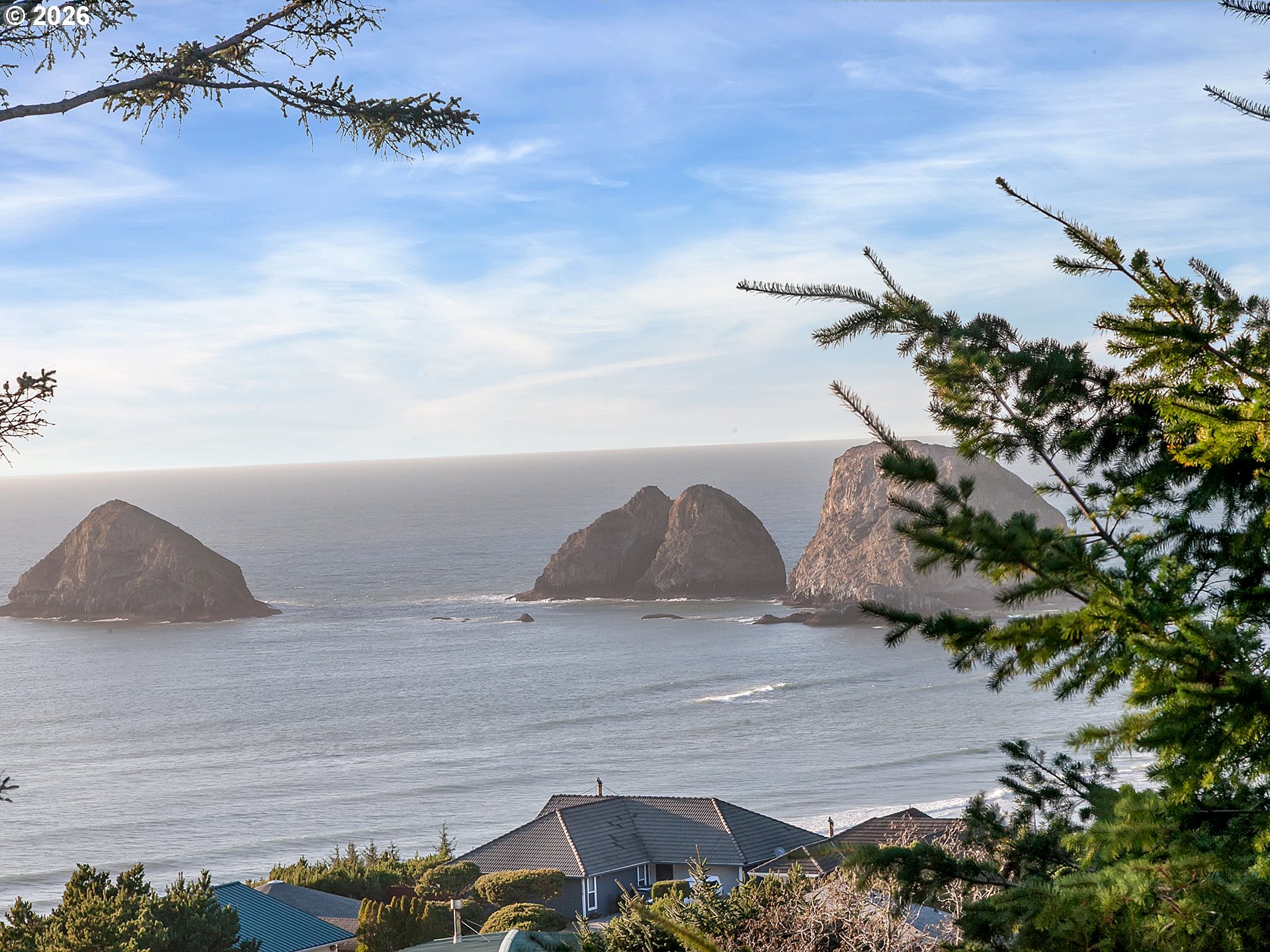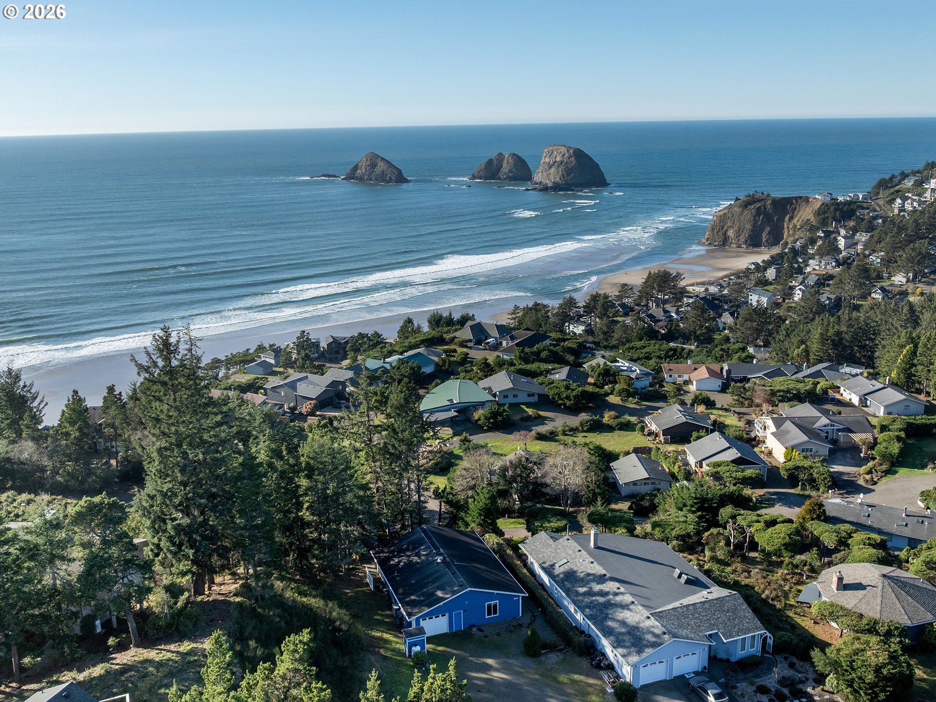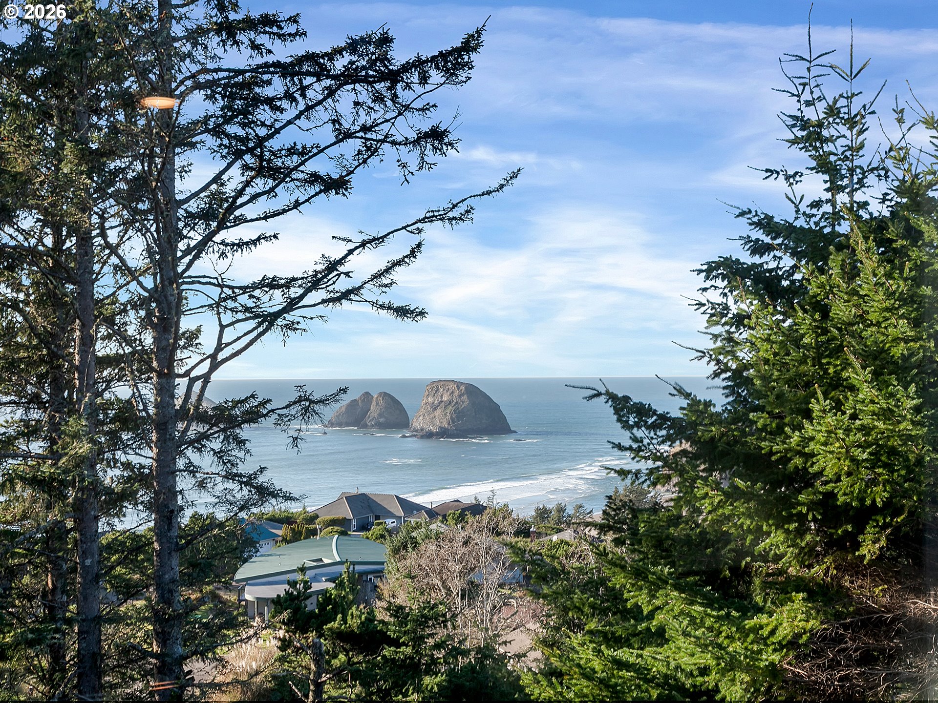 PANORAMIC OCEAN VIEW includes Three Arch Rocks nature preserve & Maxell Mountain cape. One level cottage tucked away at end of private drive with breathtaking view protected by cc&rs. Beautifully updated with cherry cabinets, granite counters, modern flush fireplace, LVP floor, stainless appliances. Tankless water heater. Forced air furnace added (baseboards still work if desired) plus heat pump for economy and cooling. Garage is double size but single overhead door. Beach trail down the street. Cc&rs limit bldg heights and vegetation. No Homeowner Assoc, no dues.