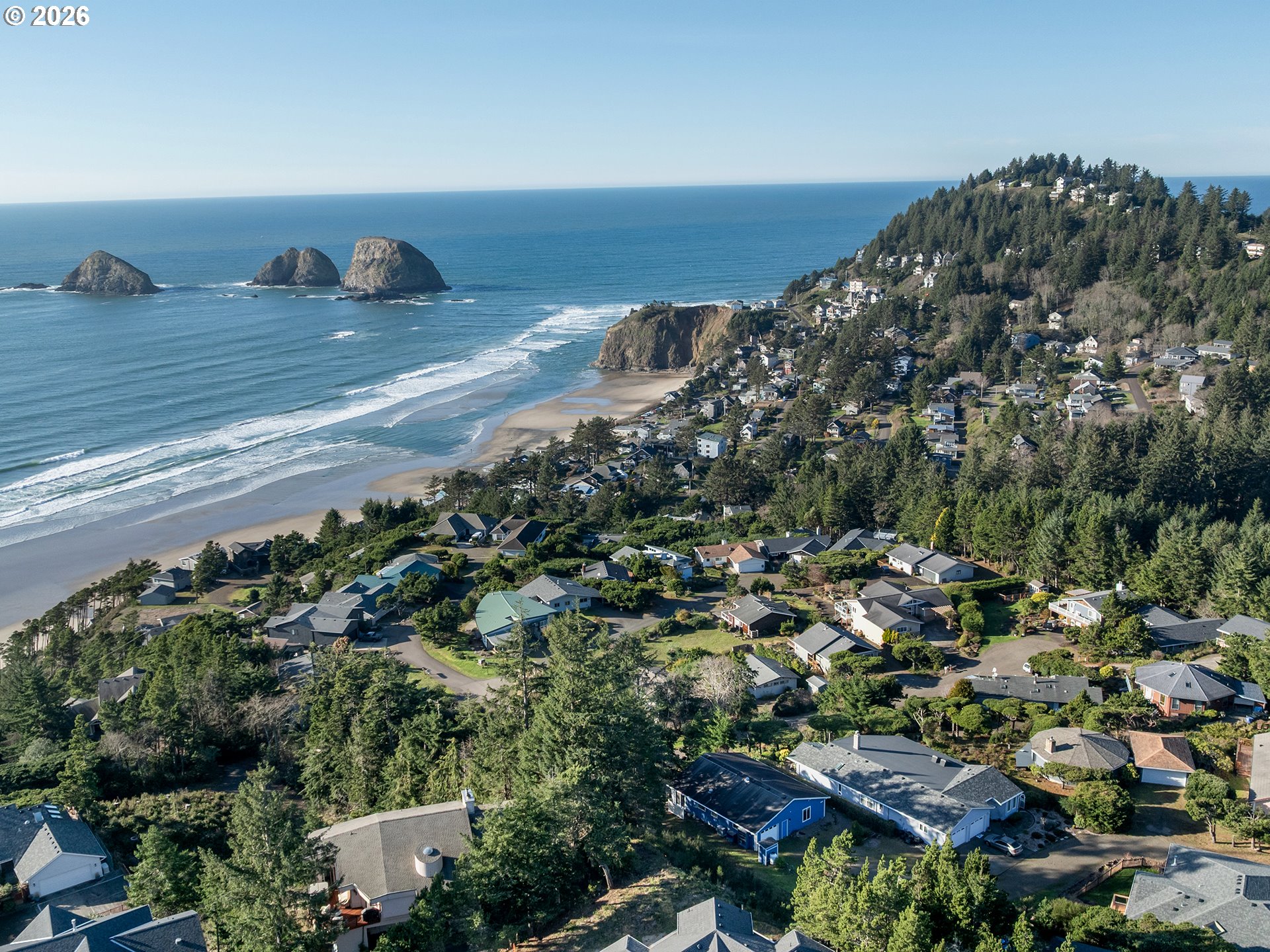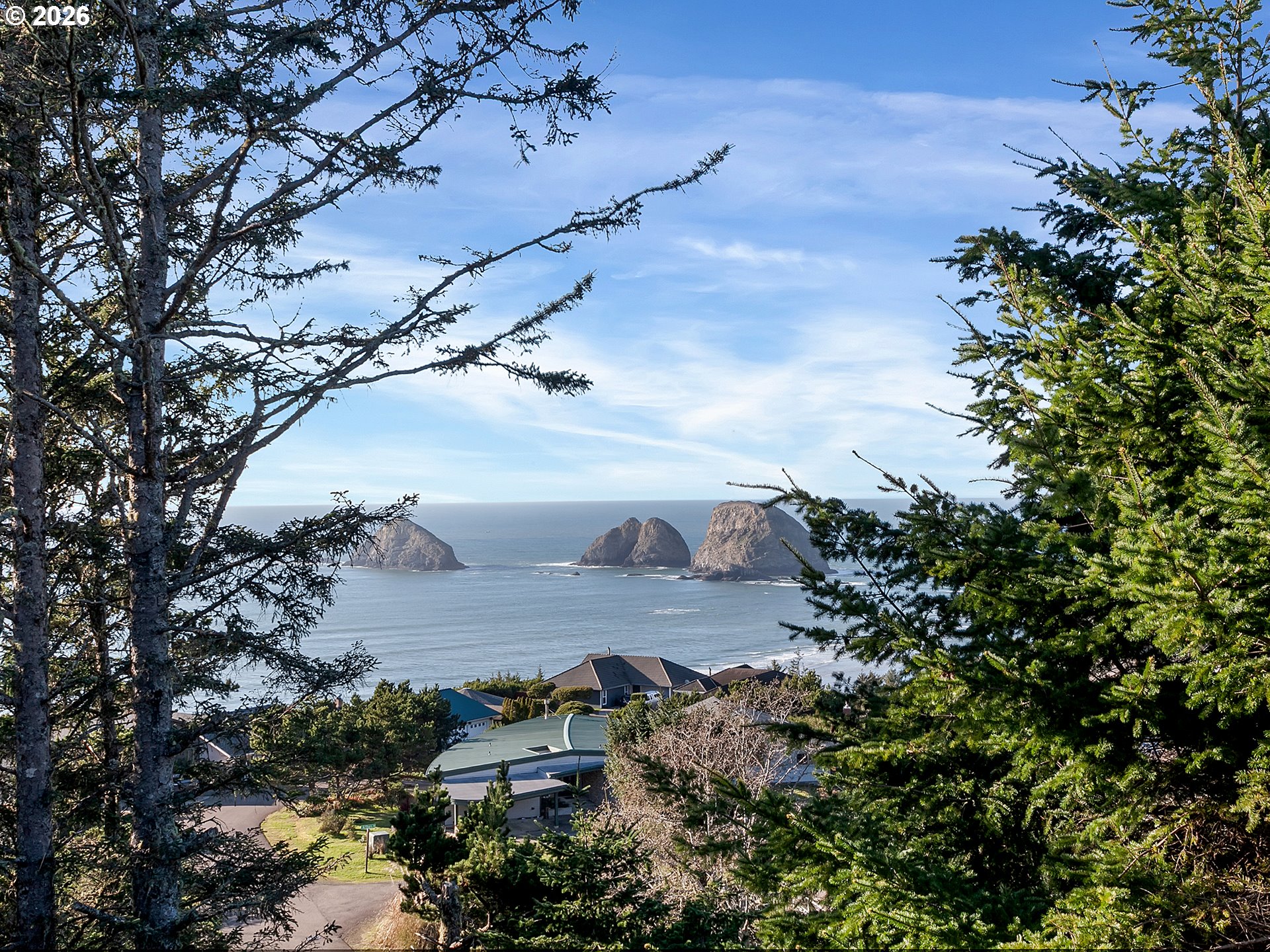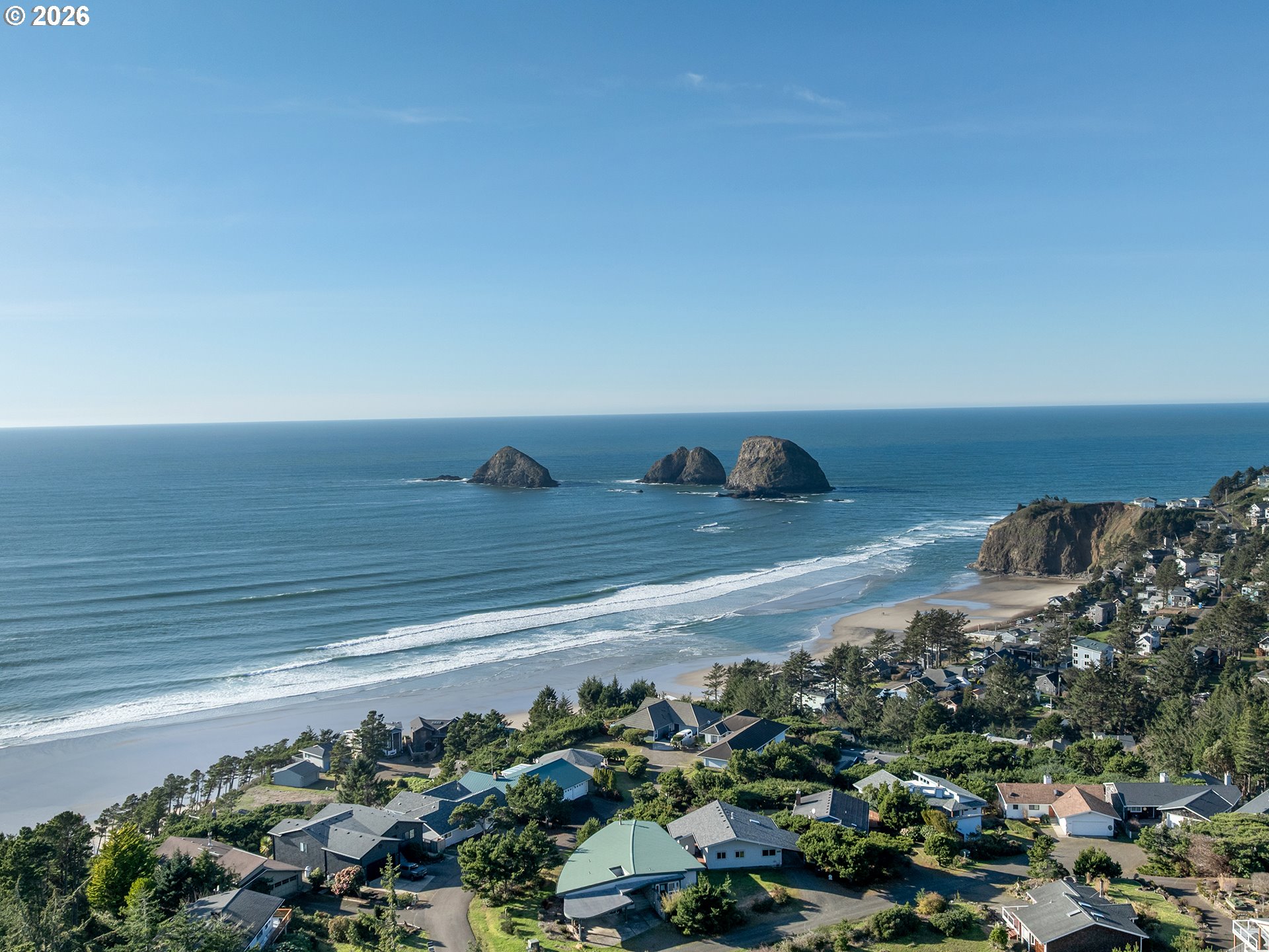 PANORAMIC OCEAN VIEW includes Three Arch Rocks nature preserve & Maxell Mountain cape. One level cottage tucked away at end of private drive with breathtaking view protected by cc&rs. Beautifully updated with cherry cabinets, granite counters, modern flush fireplace, LVP floor, stainless appliances. Tankless water heater. Forced air furnace added (baseboards still work if desired) plus heat pump for economy and cooling. Garage is double size but single overhead door. Beach trail down the street. Cc&rs limit bldg heights and vegetation. No Homeowner Assoc, no dues.