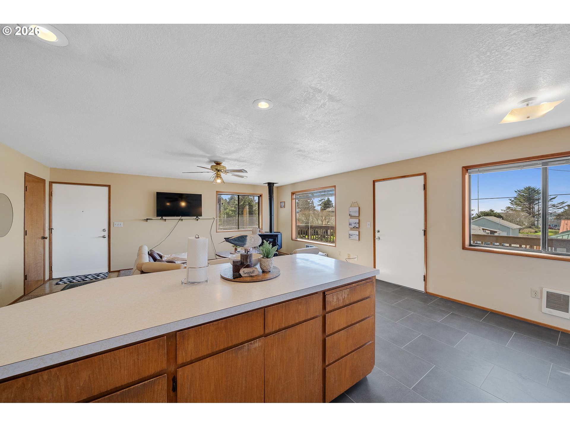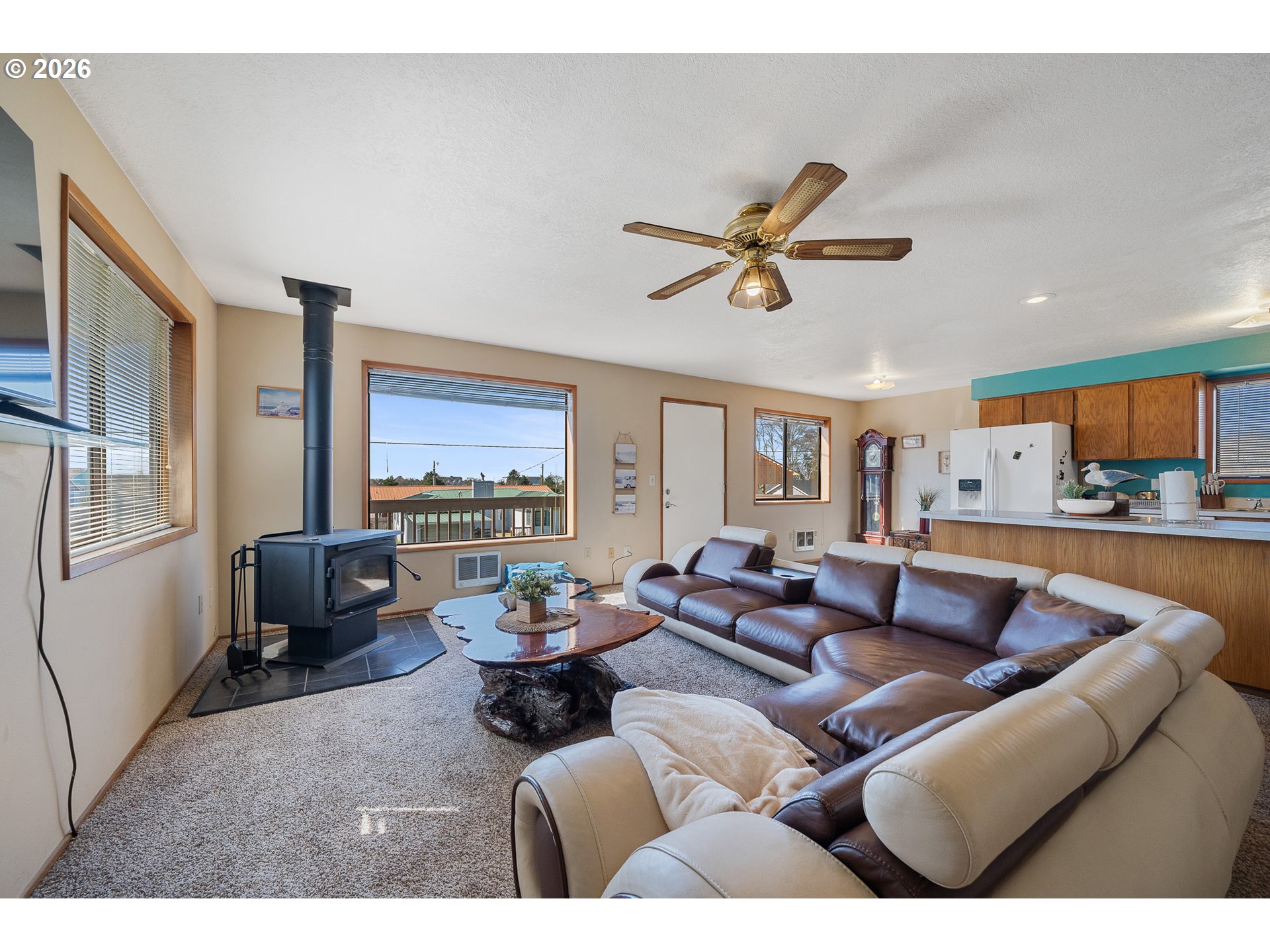 Great home located on a quiet, established street! Fresh interior paint and new carpet throughout. The ground level features two bedrooms, one bathroom, a large laundry area, and a single-car garage. Upstairs offers a spacious great room with an open kitchen and dining area, along with two additional bedrooms and a full bath. Enjoy the wraparound deck with a peek of ocean views—perfect for relaxing and taking in beautiful sunsets at the end of the day. Come take a look!