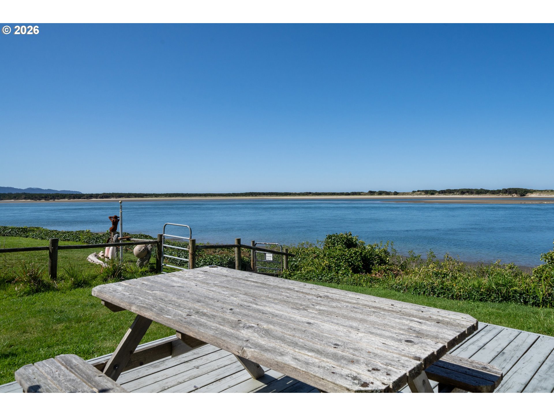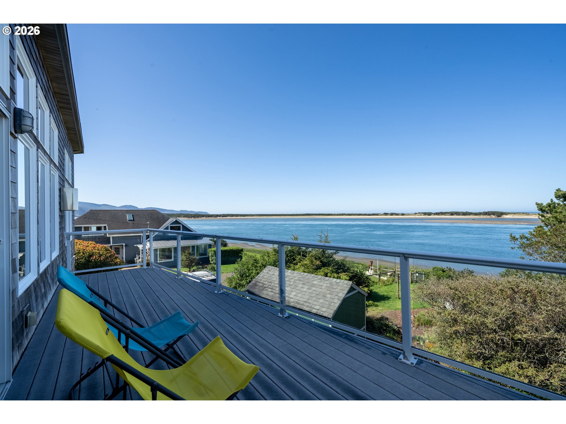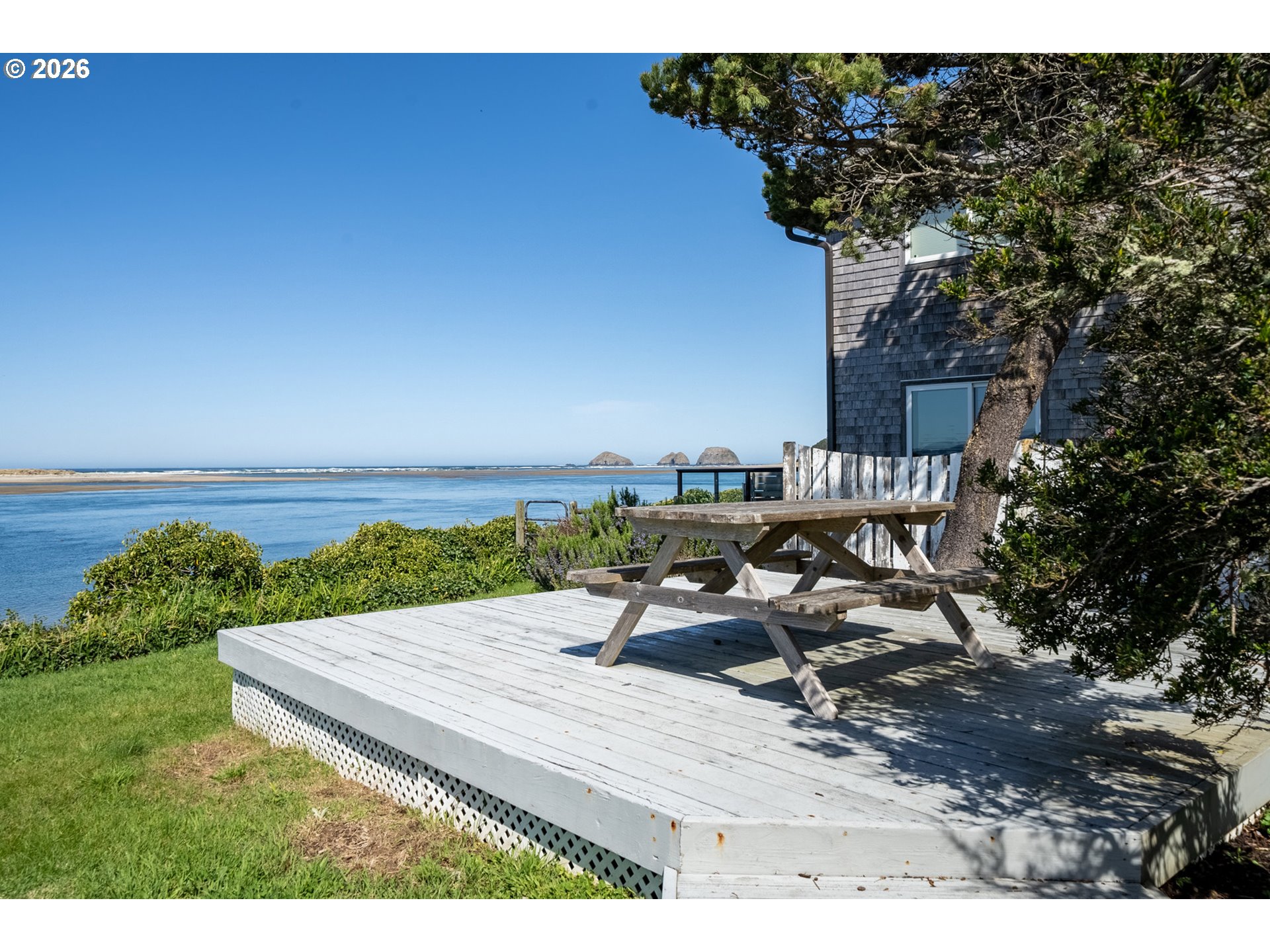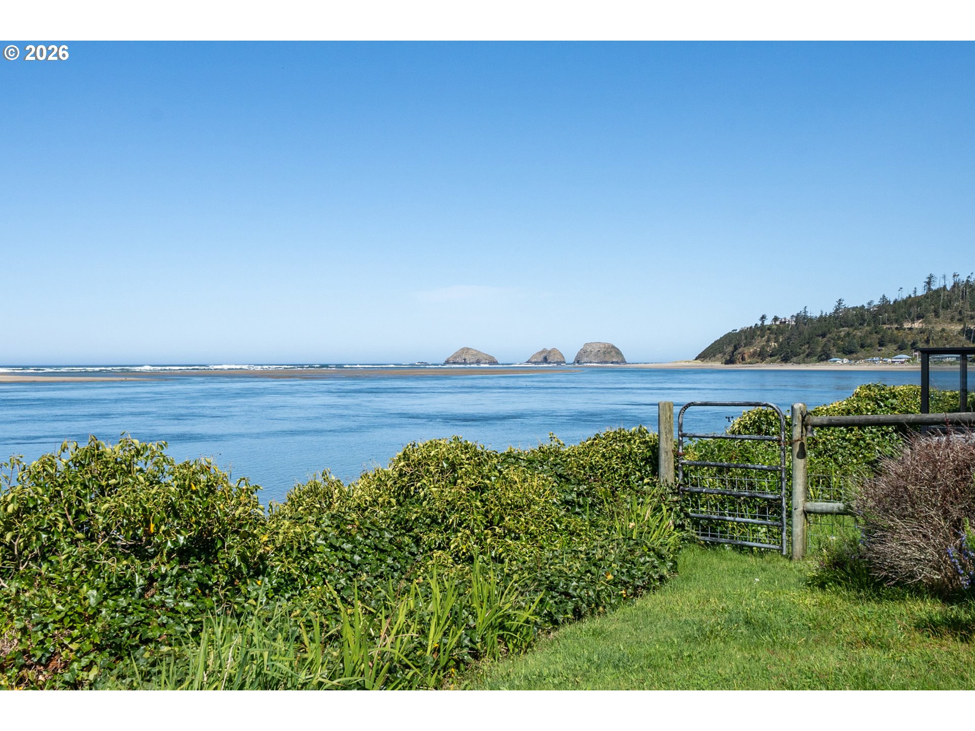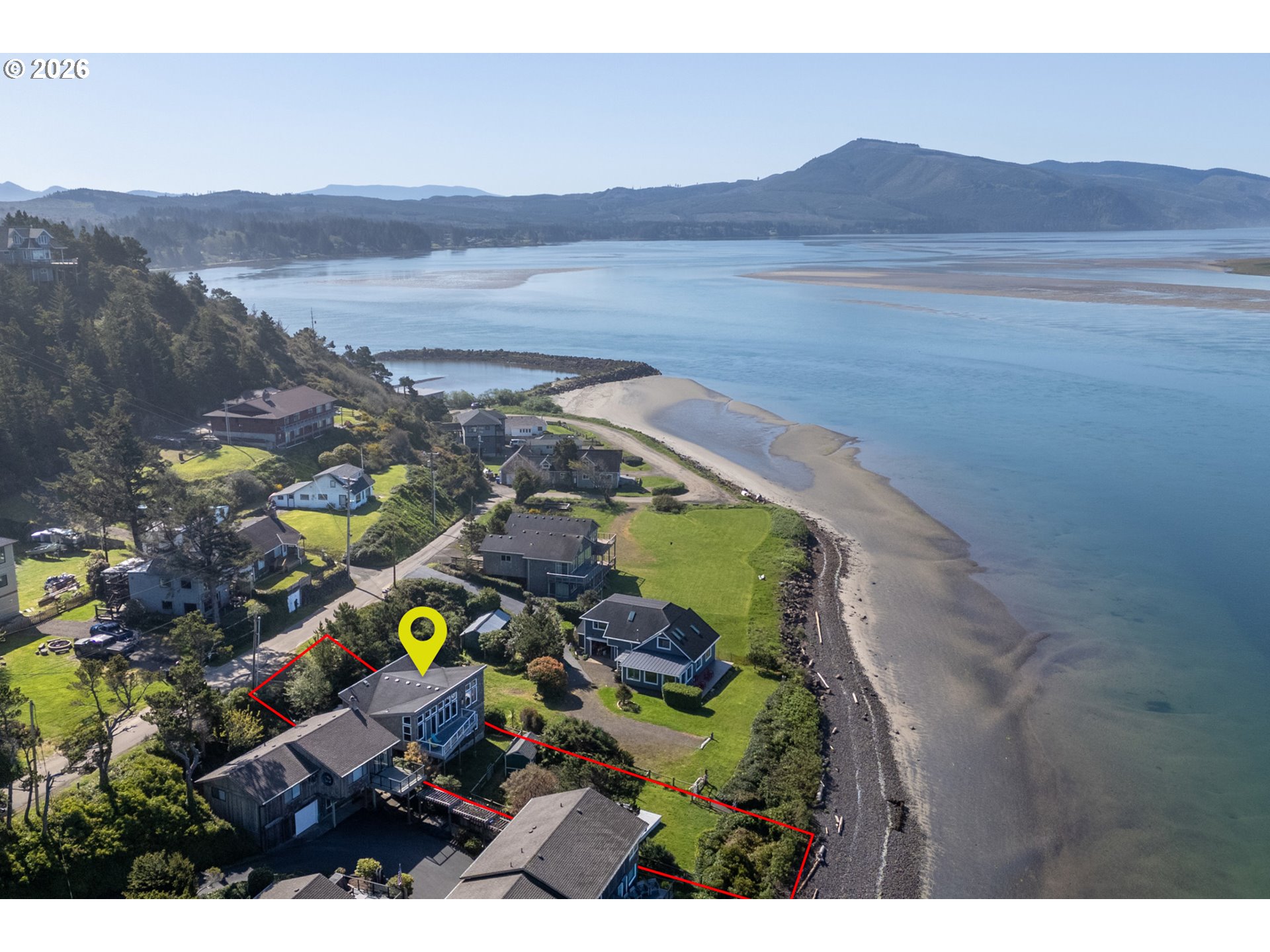Netarts bayfront home on coveted Pearl Street, featuring an enchanting level front yard with private, gated low-bank beach access. Built-in 2009 with cedar shingle siding and ample off-street parking, the home offers a light-filled, open floor plan with exposed beam vaulted ceilings and a wall of floor-to-ceiling windows showcasing views of the bay and ocean. Step out of the great room onto a large composite deck with a glass railing, perfectly positioned to take in the changing tides, wildlife and tranquility of the bay. Back inside you'll find radiant heat tile flooring, granite counters, a breakfast bar, stainless appliances and propane fireplace. The ocean and bay view primary suite located on the main level features a walk-in tile shower, walk-in closet, and dual vanity. The lower level of the home includes three additional bedrooms, a full bathroom and spacious laundry room with extra storage. Outdoor amenities continue with a concrete patio and outdoor shower, a convenient boathouse/storage shed, and a meandering path through a flower garden that leads to an elevated deck overlooking the bay with stunning views of the Three Arch Rocks.