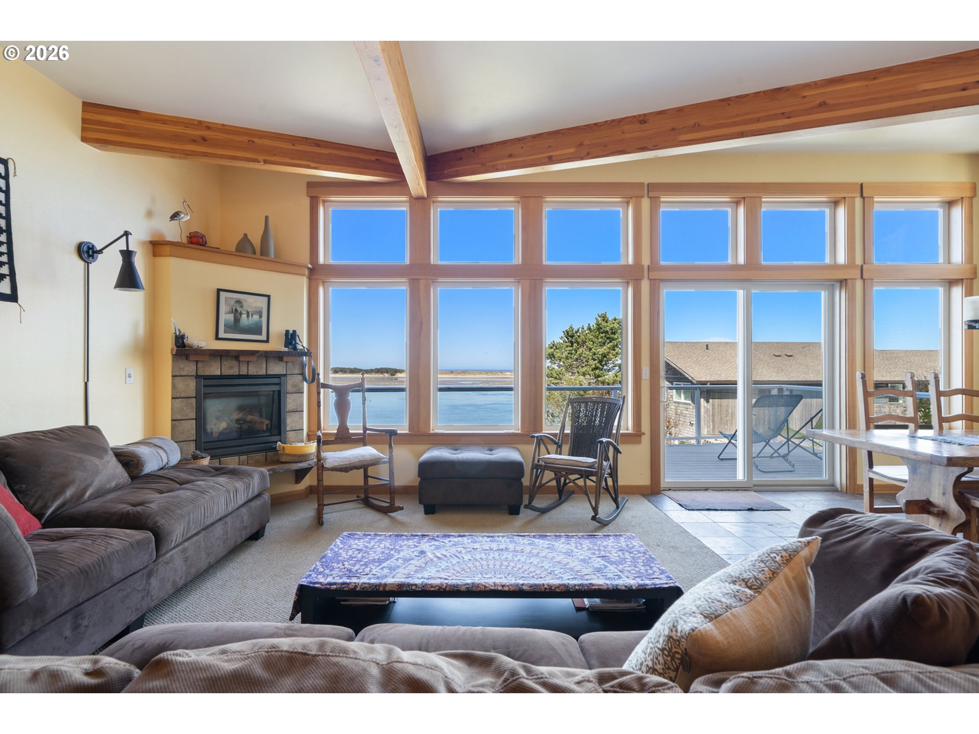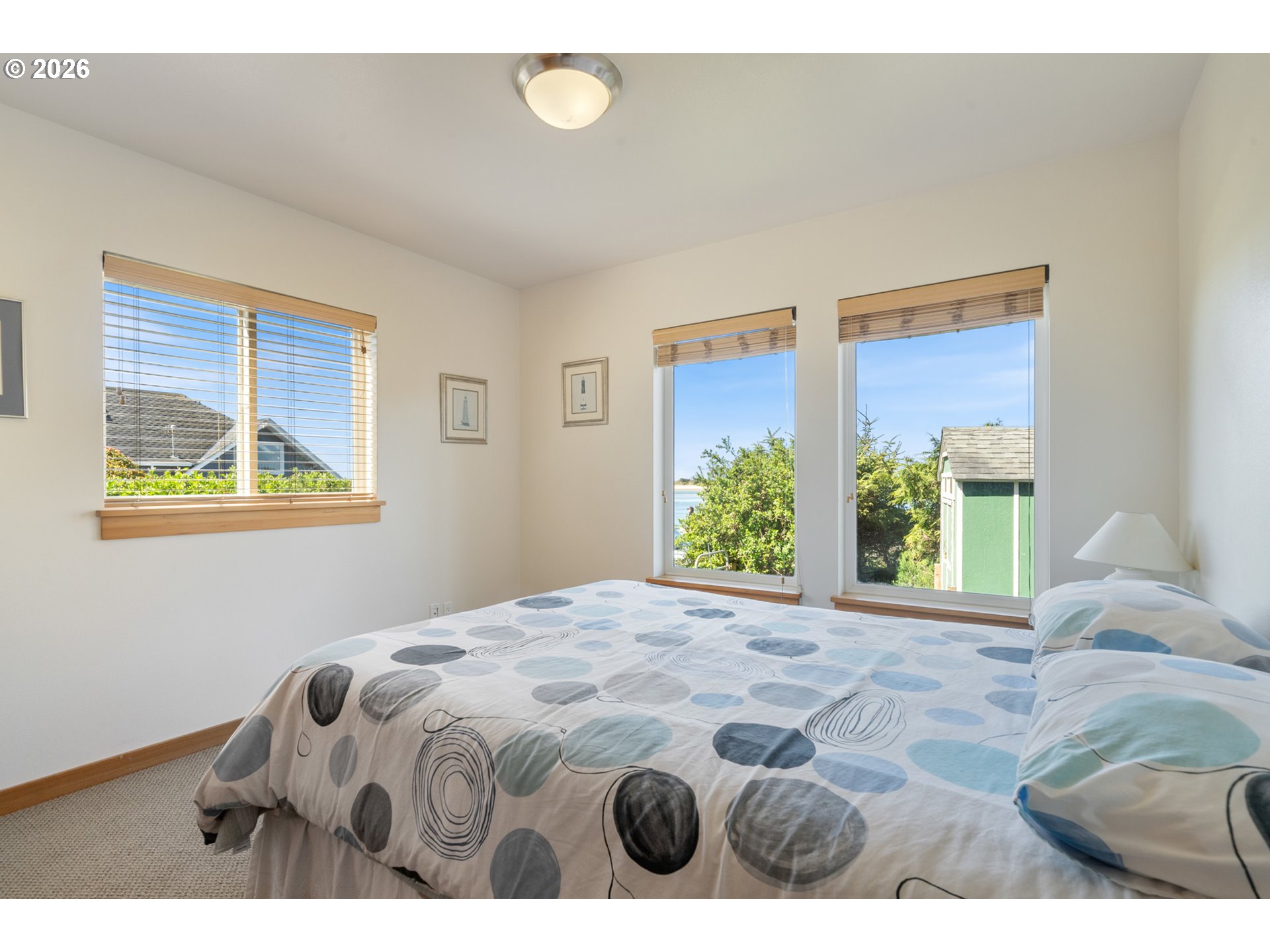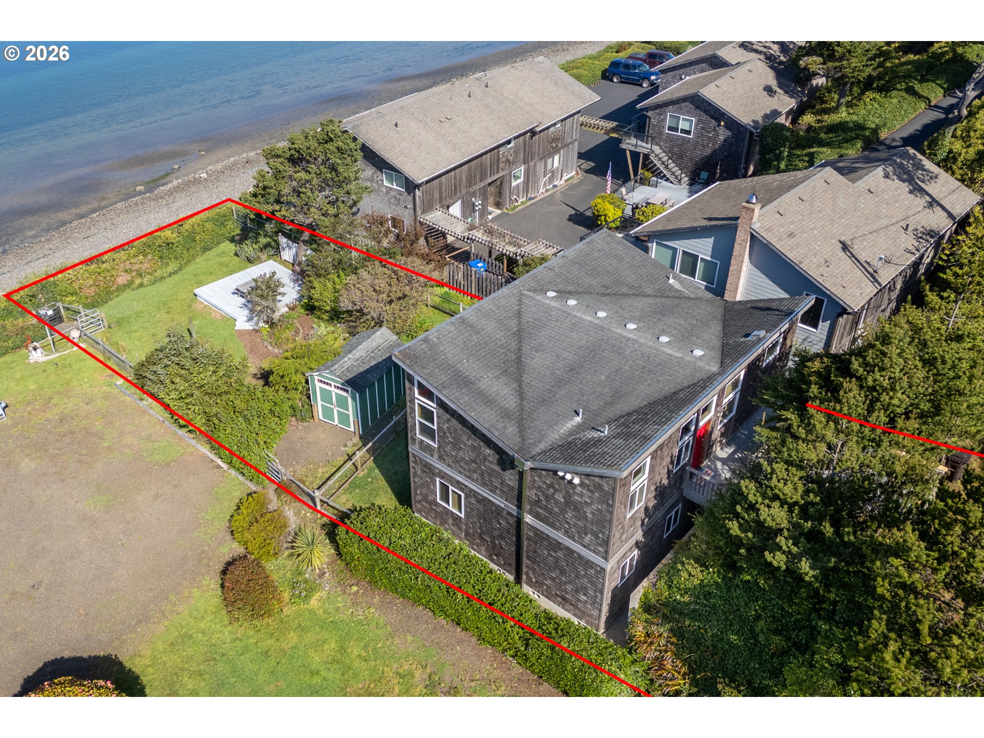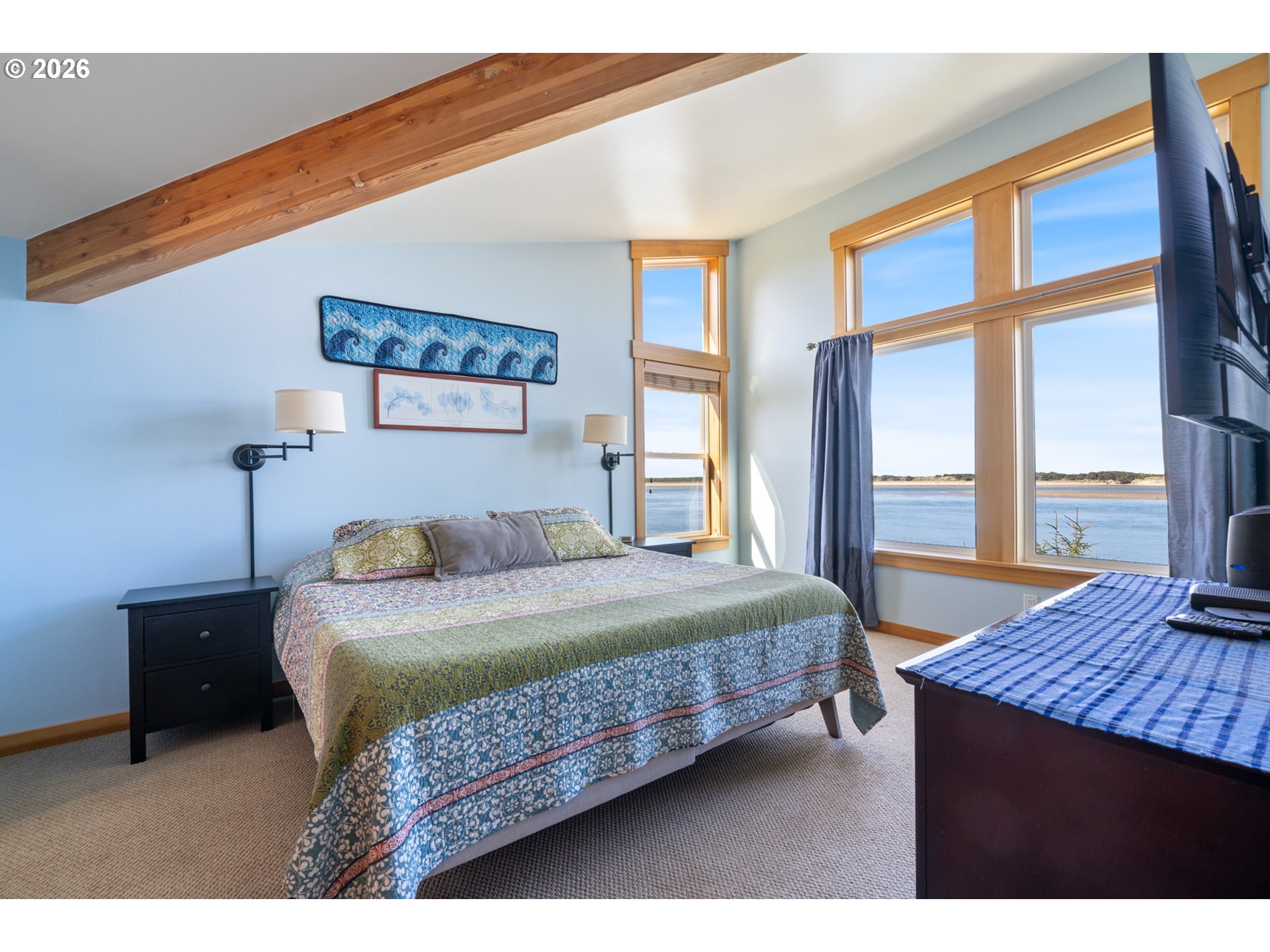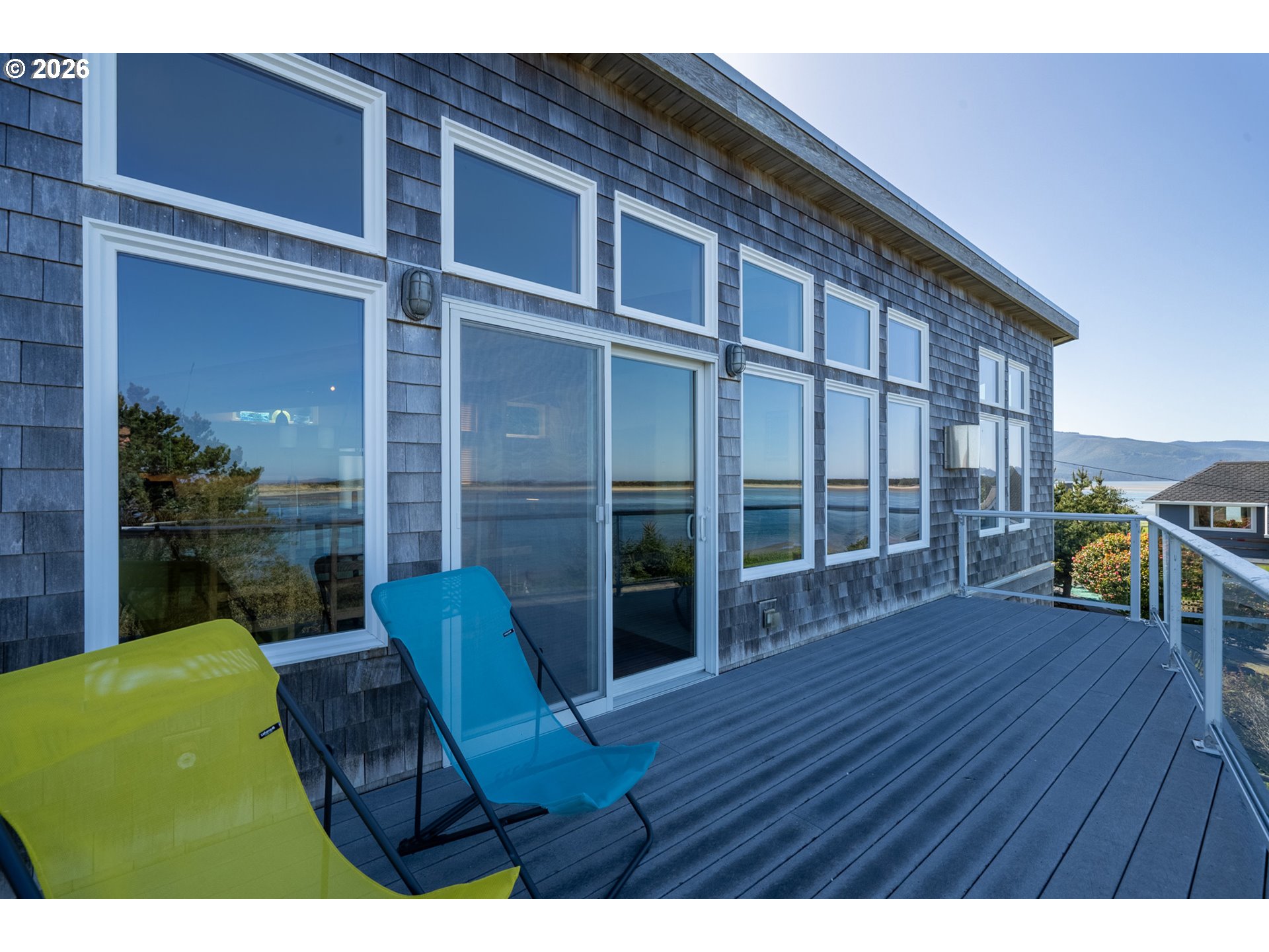 Netarts bayfront home on coveted Pearl Street, featuring an enchanting level front yard with private, gated low-bank beach access. Built-in 2009 with cedar shingle siding and ample off-street parking, the home offers a light-filled, open floor plan with exposed beam vaulted ceilings and a wall of floor-to-ceiling windows showcasing views of the bay and ocean. Step out of the great room onto a large composite deck with a glass railing, perfectly positioned to take in the changing tides, wildlife and tranquility of the bay. Back inside you'll find radiant heat tile flooring, granite counters, a breakfast bar, stainless appliances and propane fireplace. The ocean and bay view primary suite located on the main level features a walk-in tile shower, walk-in closet, and dual vanity. The lower level of the home includes three additional bedrooms, a full bathroom and spacious laundry room with extra storage. Outdoor amenities continue with a concrete patio and outdoor shower, a convenient boathouse/storage shed, and a meandering path through a flower garden that leads to an elevated deck overlooking the bay with stunning views of the Three Arch Rocks.