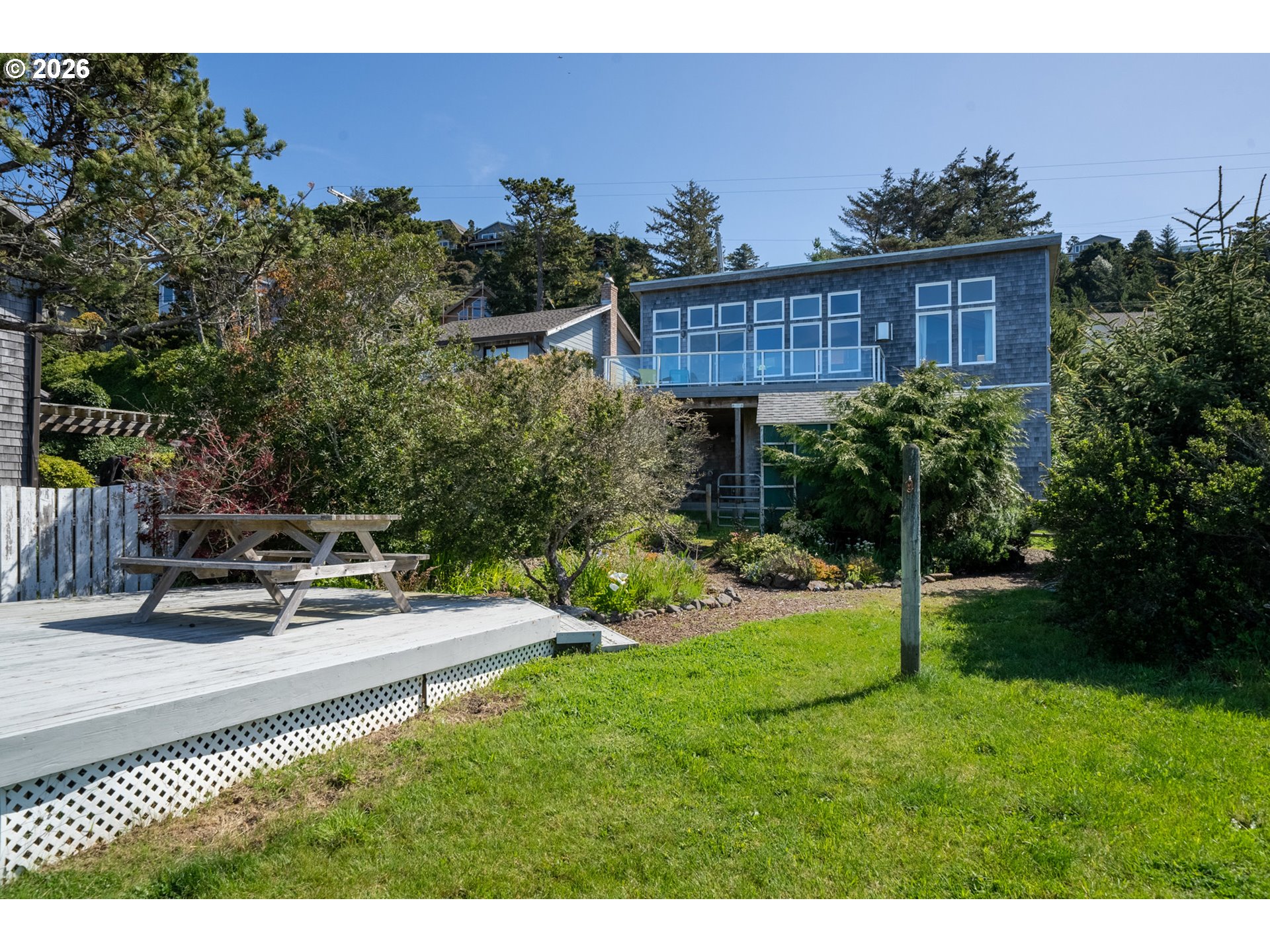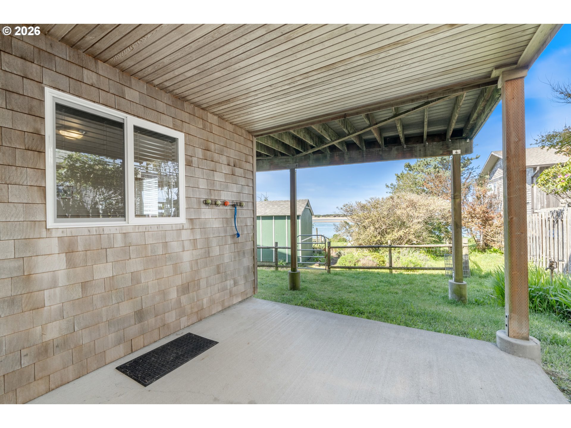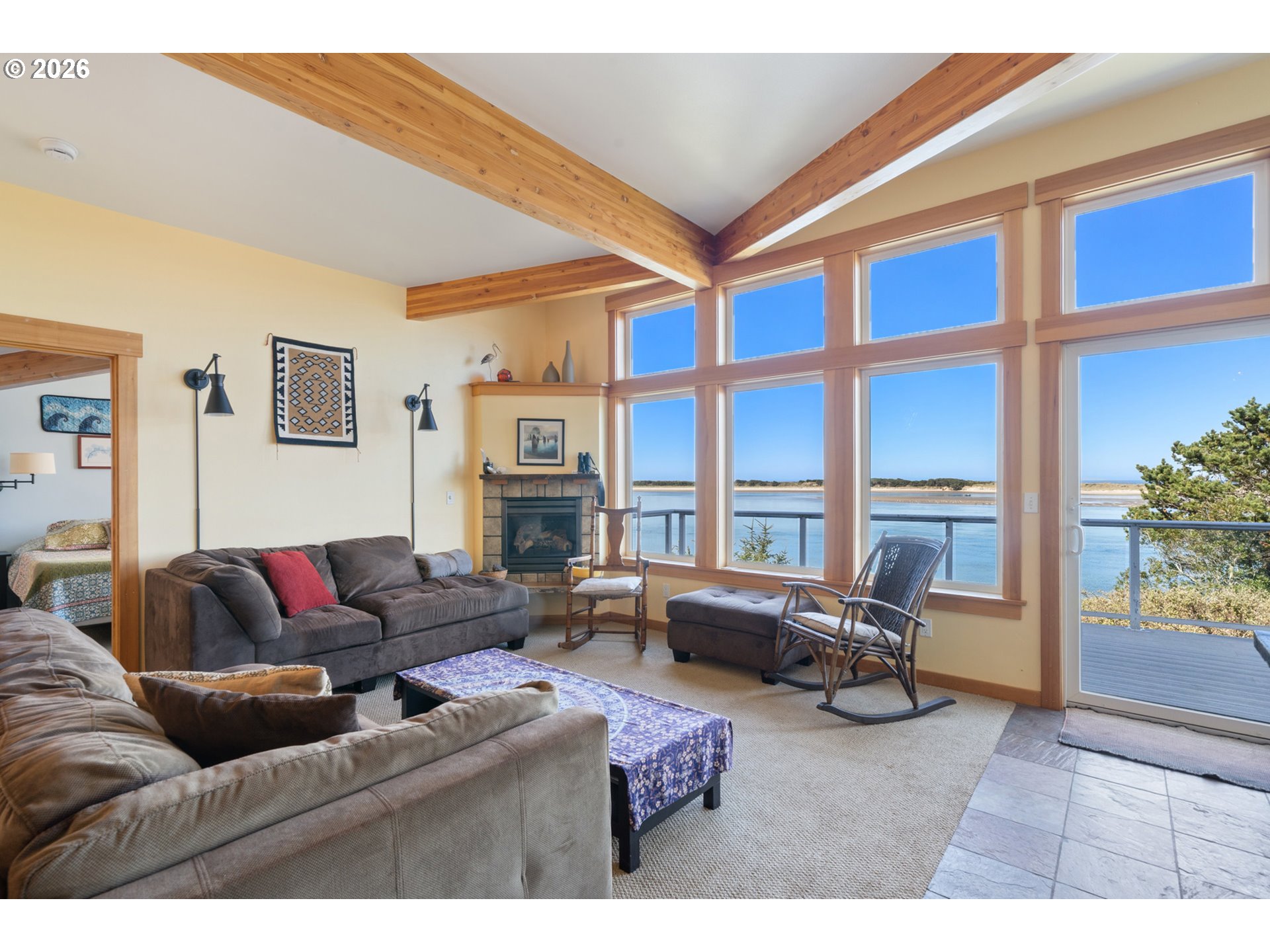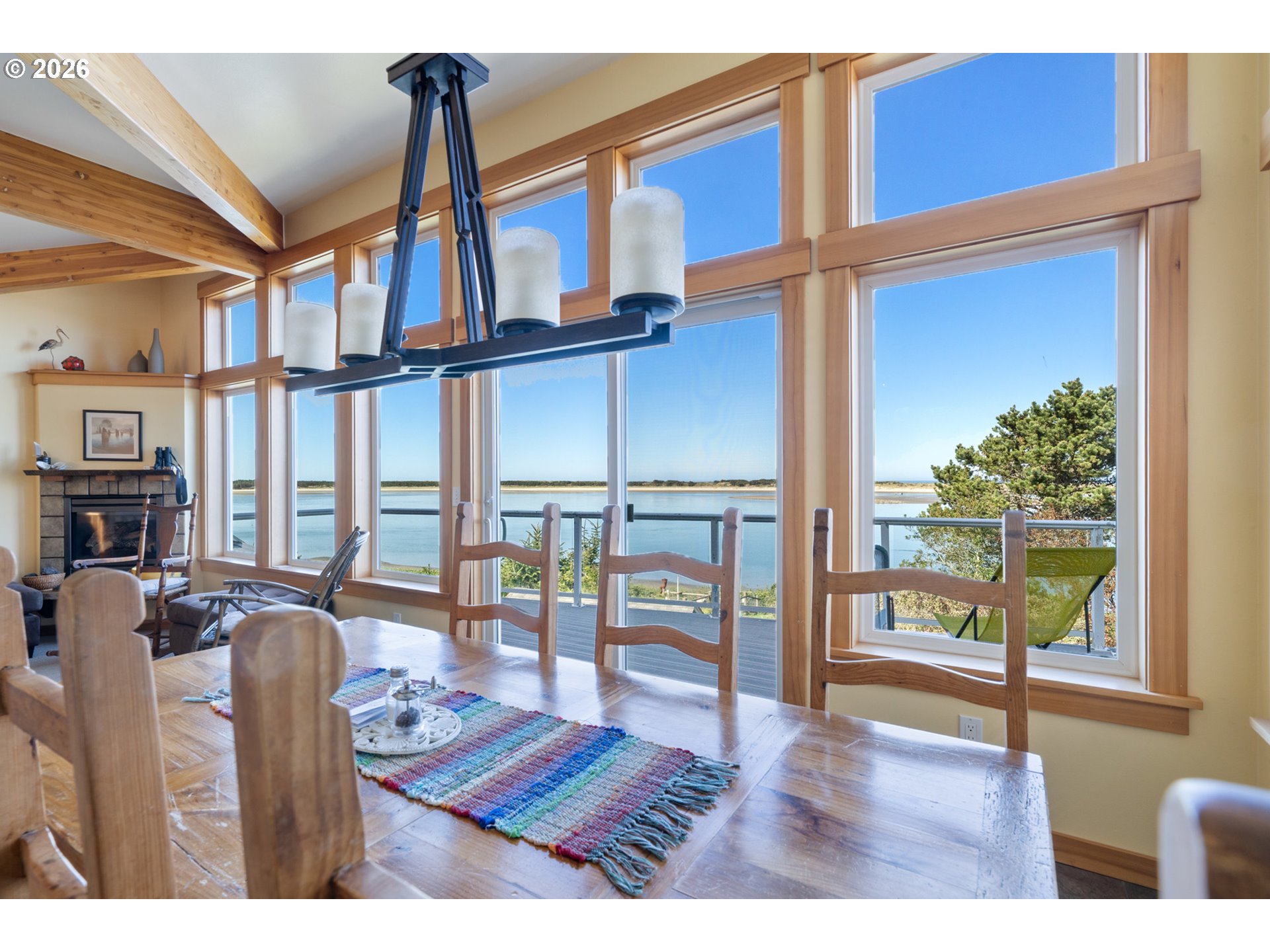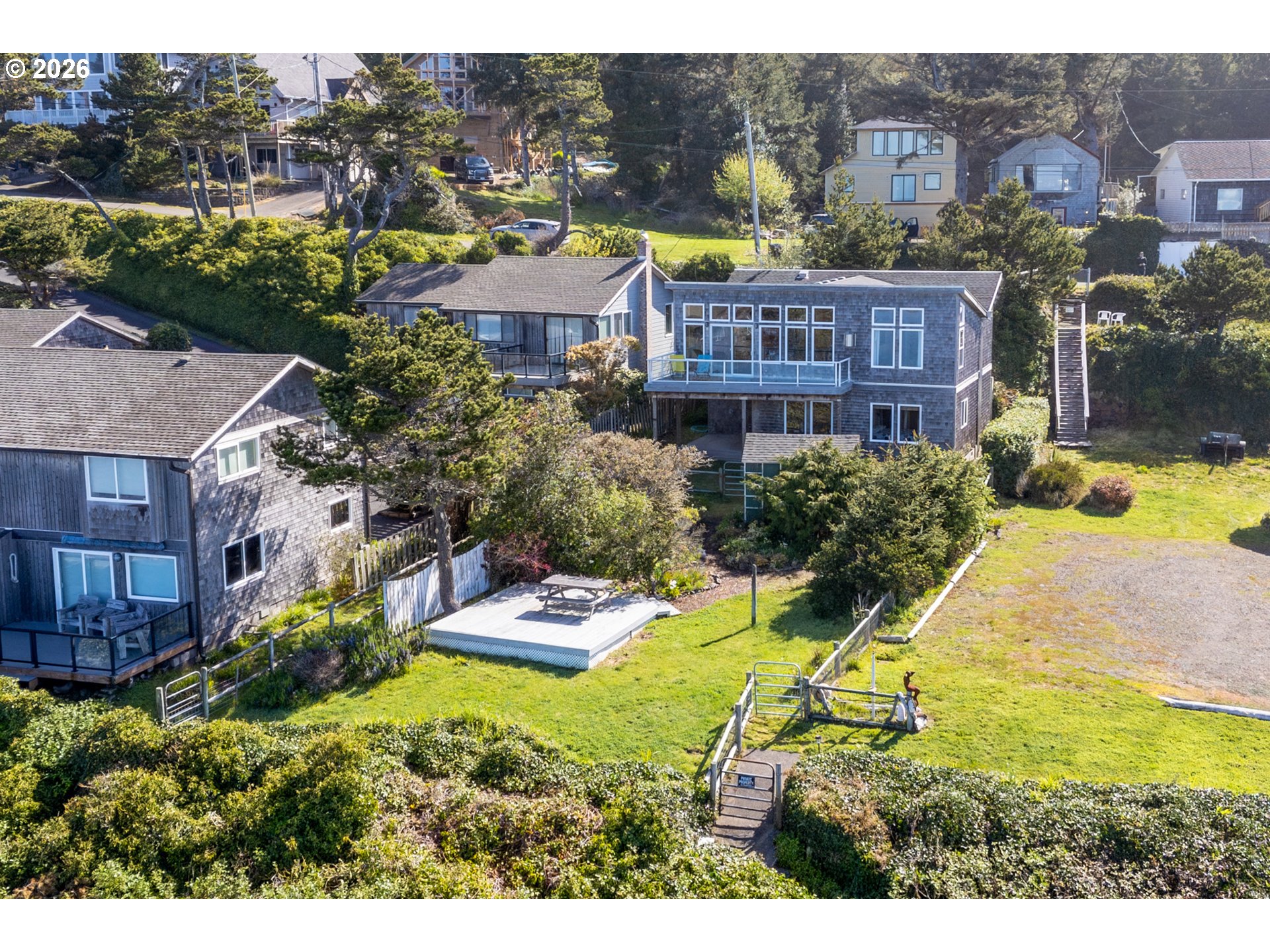 Netarts bayfront home on coveted Pearl Street, featuring an enchanting level front yard with private, gated low-bank beach access. Built-in 2009 with cedar shingle siding and ample off-street parking, the home offers a light-filled, open floor plan with exposed beam vaulted ceilings and a wall of floor-to-ceiling windows showcasing views of the bay and ocean. Step out of the great room onto a large composite deck with a glass railing, perfectly positioned to take in the changing tides, wildlife and tranquility of the bay. Back inside you'll find radiant heat tile flooring, granite counters, a breakfast bar, stainless appliances and propane fireplace. The ocean and bay view primary suite located on the main level features a walk-in tile shower, walk-in closet, and dual vanity. The lower level of the home includes three additional bedrooms, a full bathroom and spacious laundry room with extra storage. Outdoor amenities continue with a concrete patio and outdoor shower, a convenient boathouse/storage shed, and a meandering path through a flower garden that leads to an elevated deck overlooking the bay with stunning views of the Three Arch Rocks.