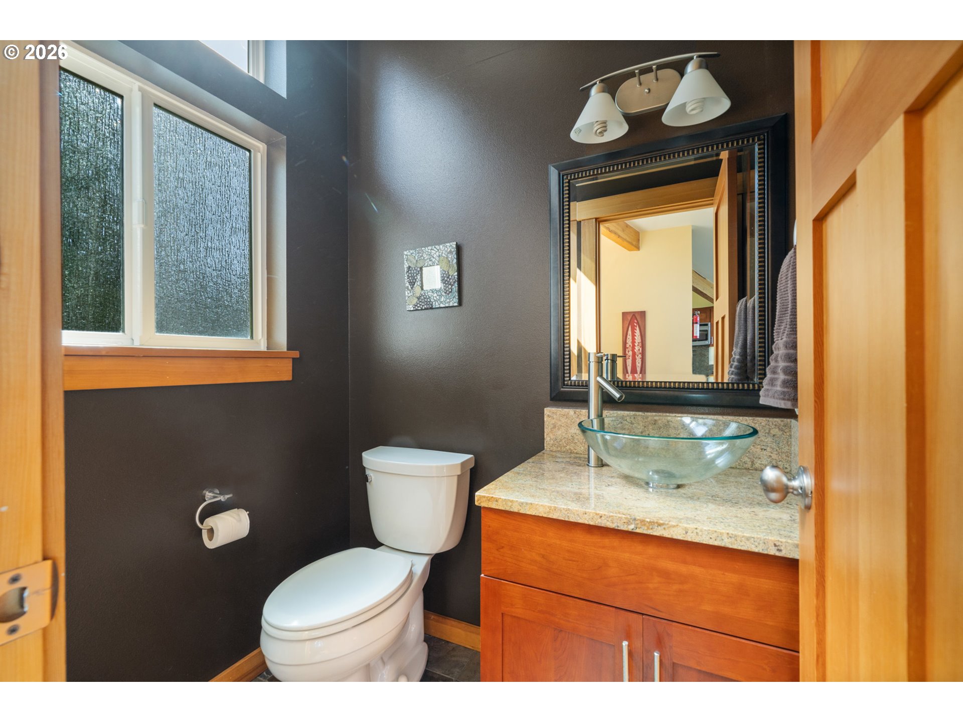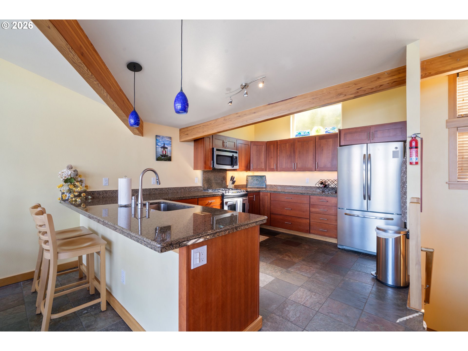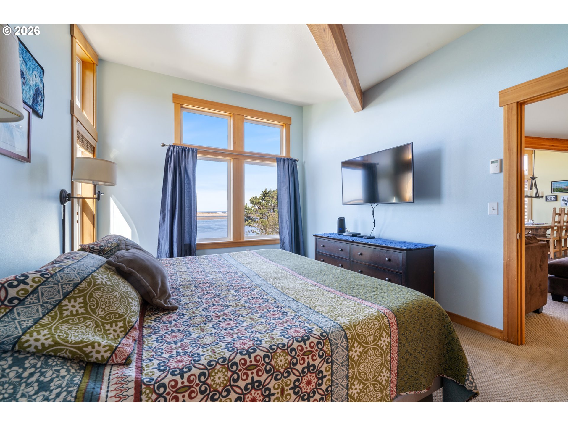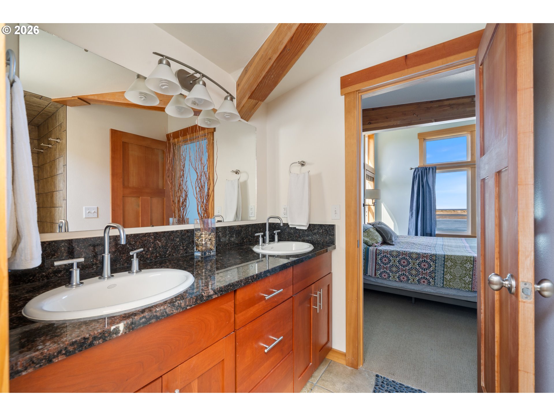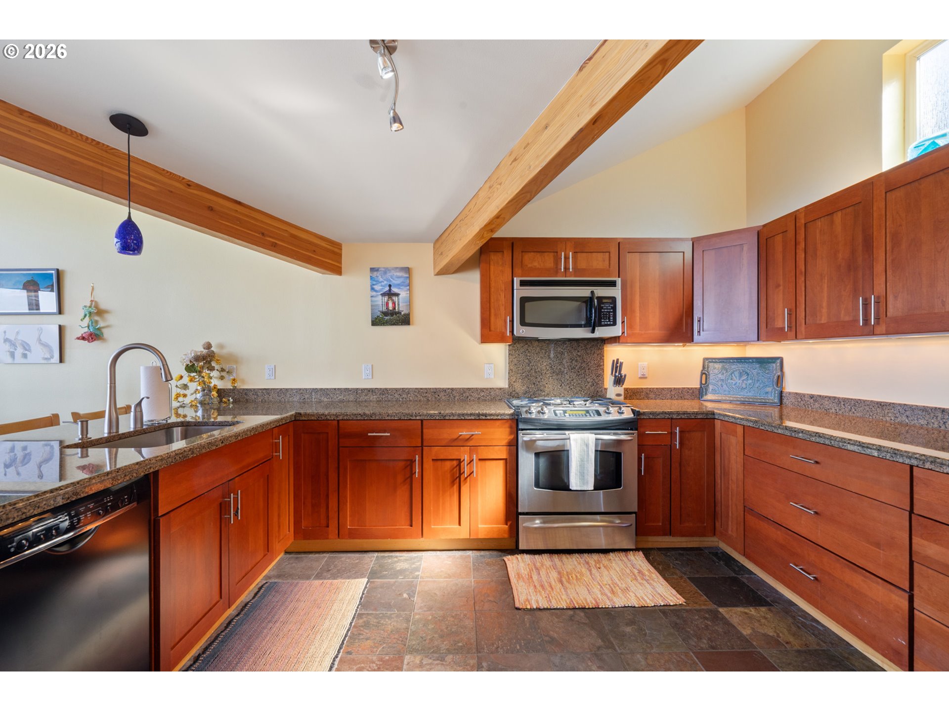 Netarts bayfront home on coveted Pearl Street, featuring an enchanting level front yard with private, gated low-bank beach access. Built-in 2009 with cedar shingle siding and ample off-street parking, the home offers a light-filled, open floor plan with exposed beam vaulted ceilings and a wall of floor-to-ceiling windows showcasing views of the bay and ocean. Step out of the great room onto a large composite deck with a glass railing, perfectly positioned to take in the changing tides, wildlife and tranquility of the bay. Back inside you'll find radiant heat tile flooring, granite counters, a breakfast bar, stainless appliances and propane fireplace. The ocean and bay view primary suite located on the main level features a walk-in tile shower, walk-in closet, and dual vanity. The lower level of the home includes three additional bedrooms, a full bathroom and spacious laundry room with extra storage. Outdoor amenities continue with a concrete patio and outdoor shower, a convenient boathouse/storage shed, and a meandering path through a flower garden that leads to an elevated deck overlooking the bay with stunning views of the Three Arch Rocks.