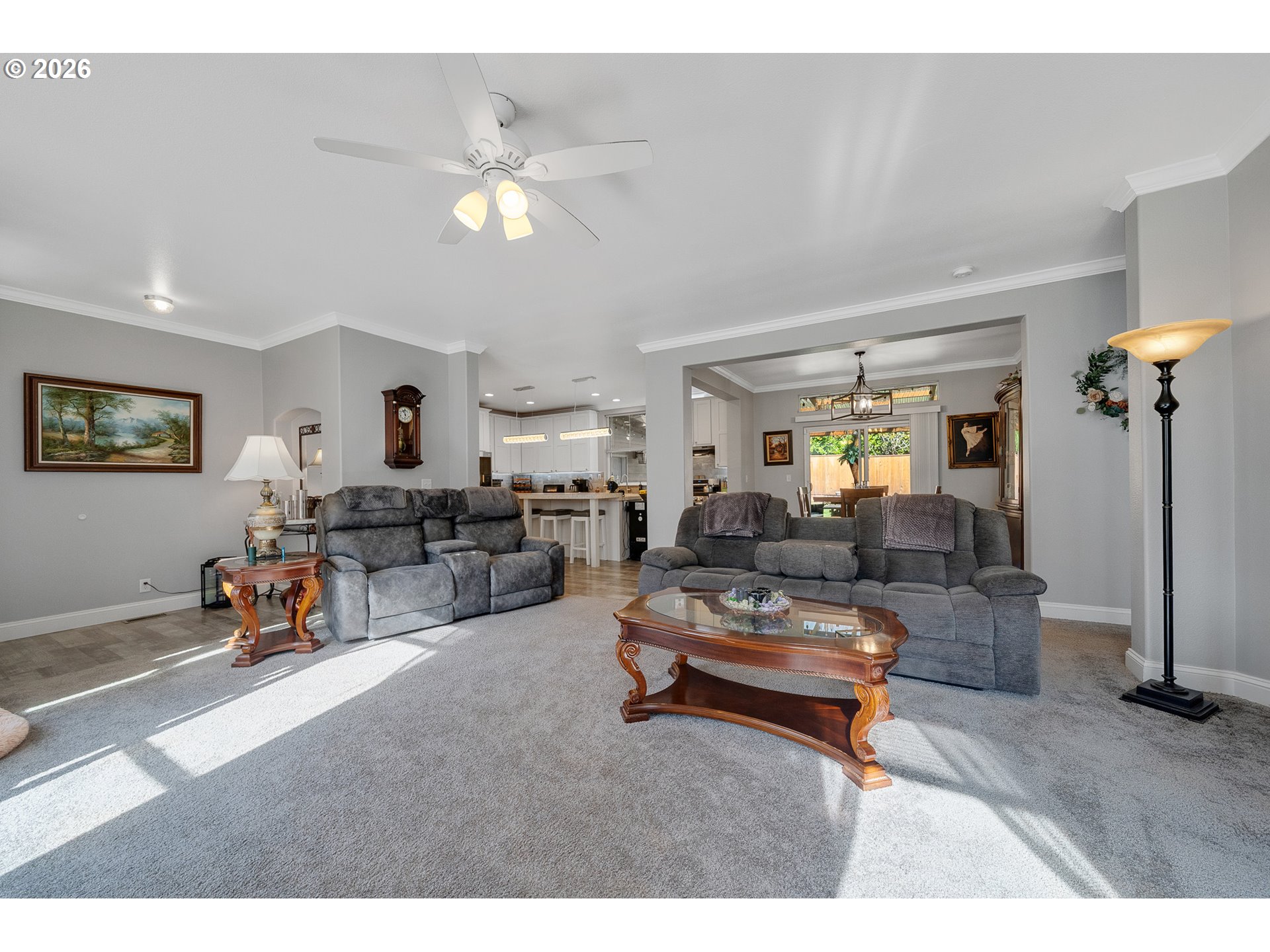 Welcome to this beautifully maintained 2021 home, where modern comfort meets thoughtful design. 9-foot ceilings with crown molding blend seamlessly with the home's neutral color palette, creating a light and airy atmosphere throughout the main living spaces. The layout flows effortlessly from the living room into the kitchen and dining area, offering a comfortable and functional space for both everyday living and entertaining. The kitchen features stainless steel appliances, a large island with breakfast bar seating, and ample cabinetry; all positioned to keep you connected to the heart of the home. Just off the dining area, a sliding glass door leads to a covered outdoor sitting area and a fully fenced backyard—perfect for relaxing or hosting year-round. The primary suite is spacious and private, complete with a large ensuite bathroom featuring double sinks, a walk-in shower, a separate soaking tub, and generous storage. An oversized walk-in closet adds even more functionality to the space. Outside, the property is well-equipped for hobbies, projects, or small-scale homesteading. Highlights include hot and cold water at the exterior spigot, a 30x35 shop with two bays and a wood stove, a covered carport, a 10x12 greenhouse, and a chicken coop with an enclosed run. The level lot provides usable space with a sense of privacy, surrounded by a peaceful, forested backdrop.
