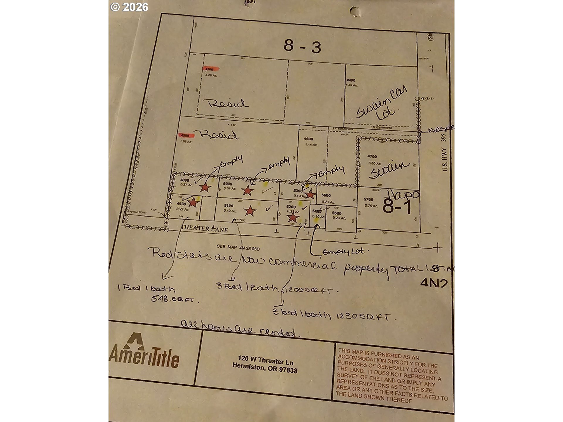 Great opportunity for Commercial investment located across from Chipotle, grocery outlet, planet fitness, Hermiston Theater, Good Will, Hapo Credit Union. Close to Home Depot, Ace Hardware, STCU Bank, Old west Bank and many other businesses. Property has 3 older homes (120,150,220) and 4 unimproved lots that total over 1.87 AC, Seller will consider carrying contract on purchase of all 7 properties with a large down, Seller will consider selling each property separately, home 120 is a 3 bed 1 bath, 1230 sq ft gas, electric, well, public sewer, some updates, home 150 home is 3 bedroom 1 bath 1200 sq ft, septic, well, gas ,electric home is not represented with any value , Home 220 is a 1 bedroom 1 bath, 548 sq ft, septic, city water, electric has some updates, homes have long time renters, keep the renters and developed the properties when ready on lot at a time