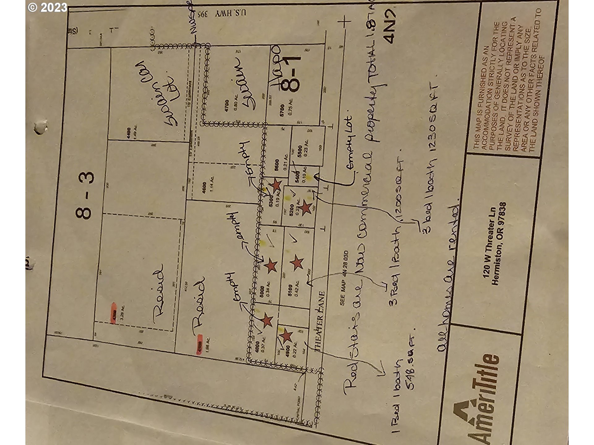 Commercial Property, Located across from Grocery Outlet, Hermiston Theater, Good will, HAPO Credit Union. close to Ace Hardware, Home Depot, Community Bank, Old West Bank and many other businesses. Property has 3 older homes (120,150,220 Theater Lane) Plus 4 unimproved lots total over 1.87 acres. Homes are not being represented. Homes are currently being rented month to month by long term tenants. Good frontage on Theater Lane. Golden opportunity for any commercial building or strip mall. Keep the rentals as income until you know what you want to develope.