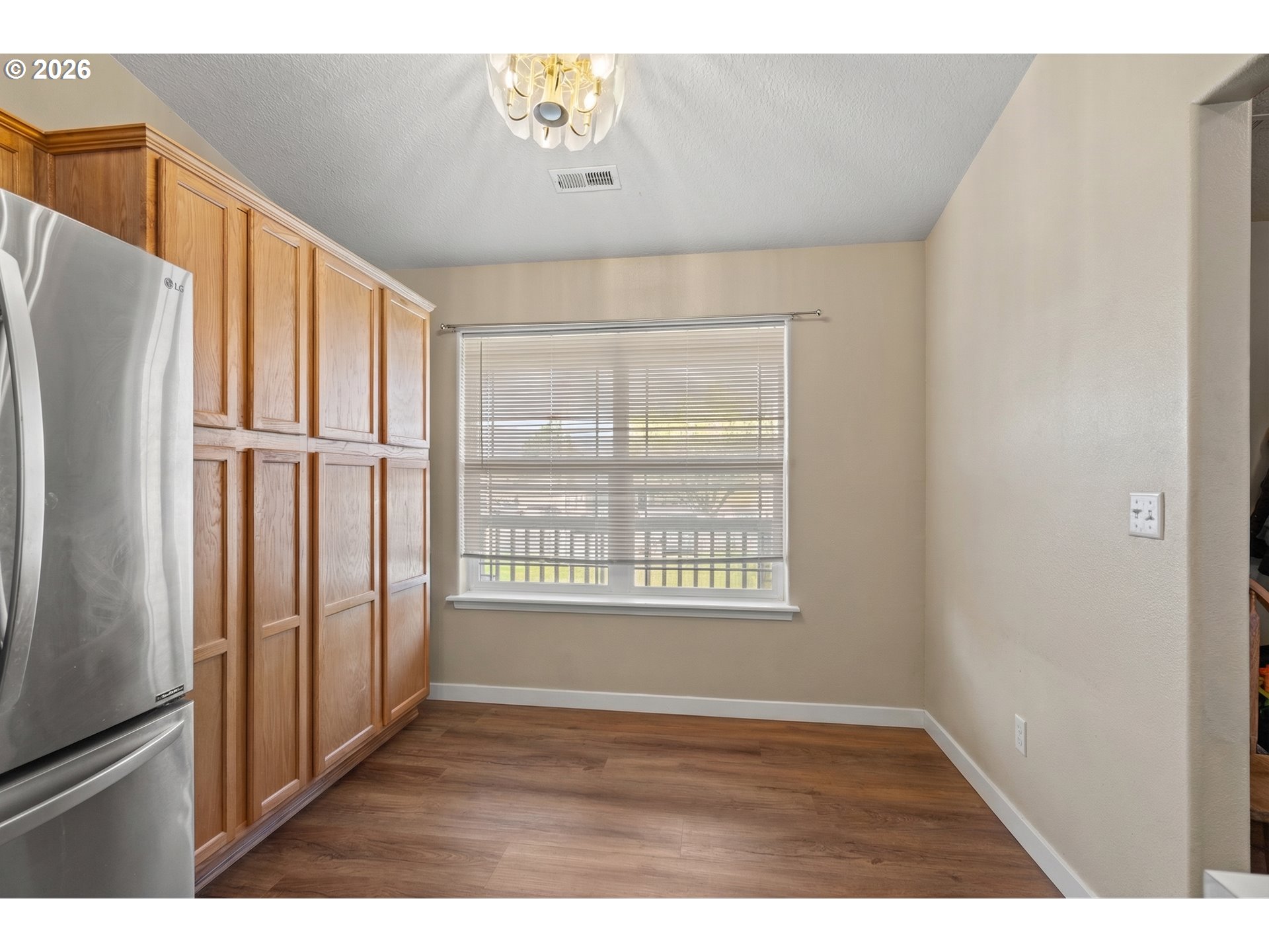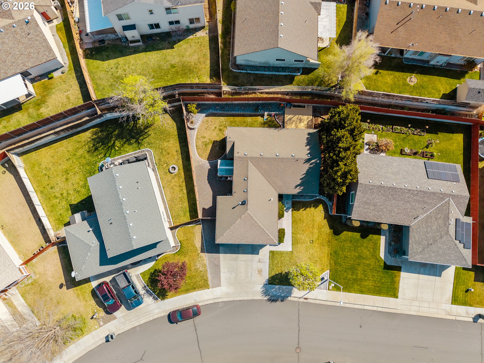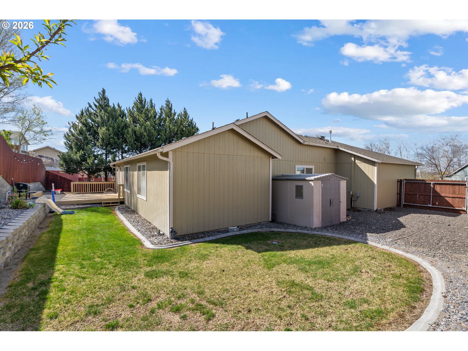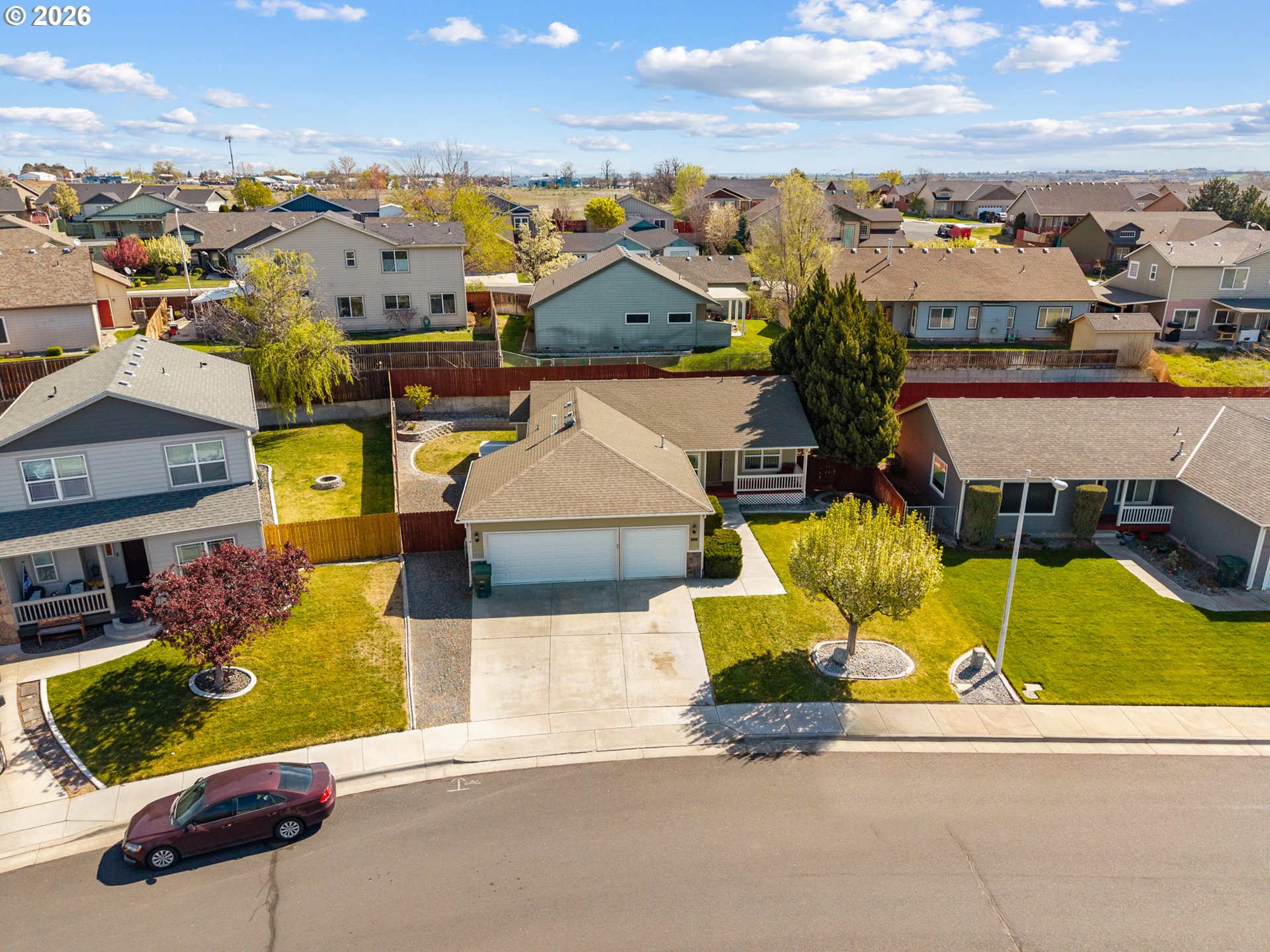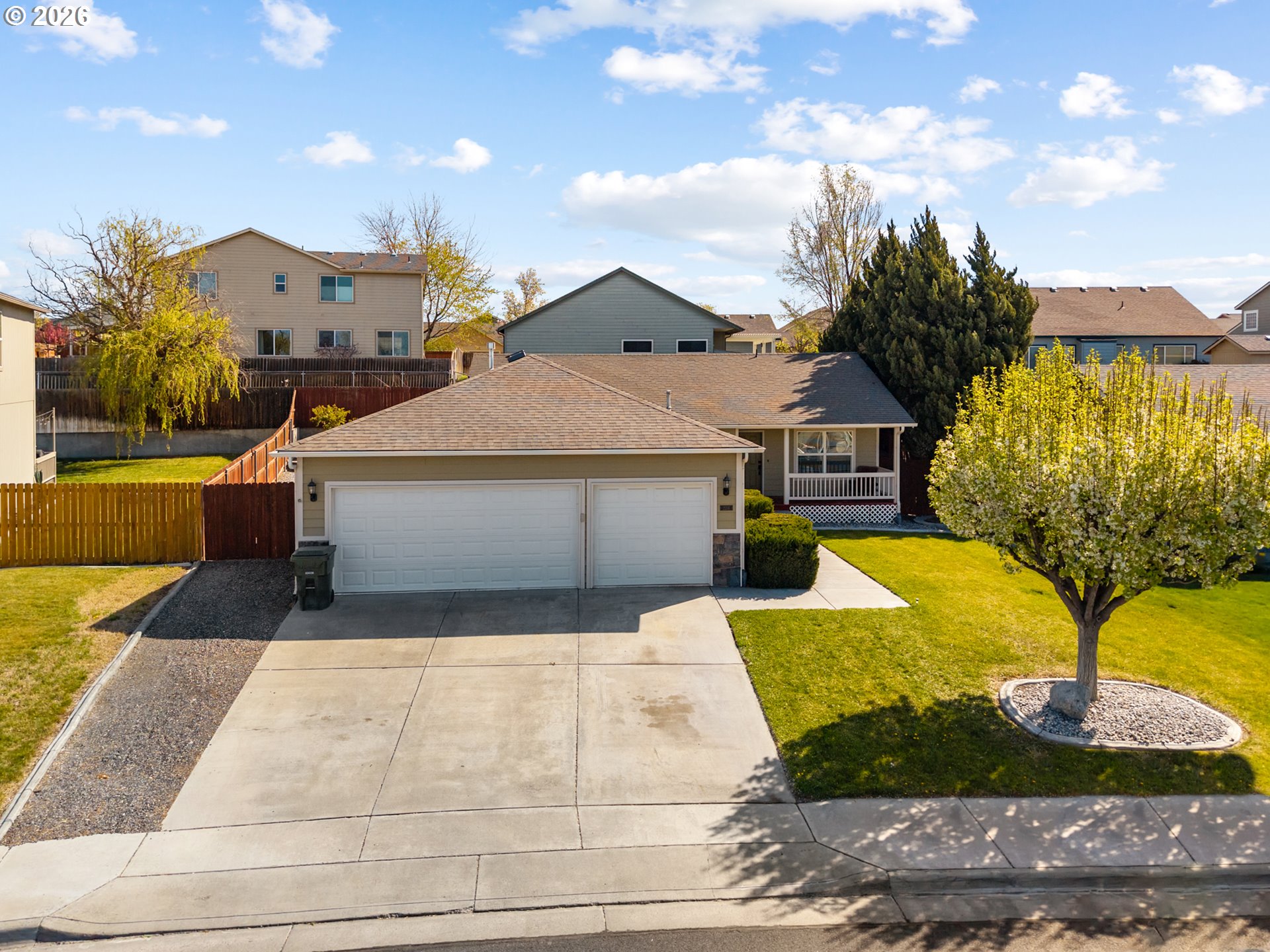 This single-level 3-bedroom, 2-bathroom home offers comfort, function, and curb appeal. The covered front porch and established landscaping with concrete edging and mature trees create a welcoming first impression.Inside, vinyl plank flooring runs throughout the main living areas, tile in the bathrooms and laundry room, and carpet in all three bedrooms. The kitchen features stainless steel appliances, extra cabinet storage, and a sink that overlooks the living and dining areas — great for everyday living and entertaining. The large laundry room with additional shelving adds practical storage.All three bedrooms include closet organizers, keeping storage functional and clutter-free. The updated HVAC system ensures year-round comfort, and the 3-car garage with keyless entryprovides security and convenience — all on one level with no stairs to navigate.Out back, enjoy a deck, fully fenced yard, and timed underground sprinklers. The west-facing orientation means the backyard stays shaded in the evenings — a nice bonus for outdoor relaxing. Concrete edging and established trees round out the low-maintenance landscaping.Don't miss your chance to make it yours!