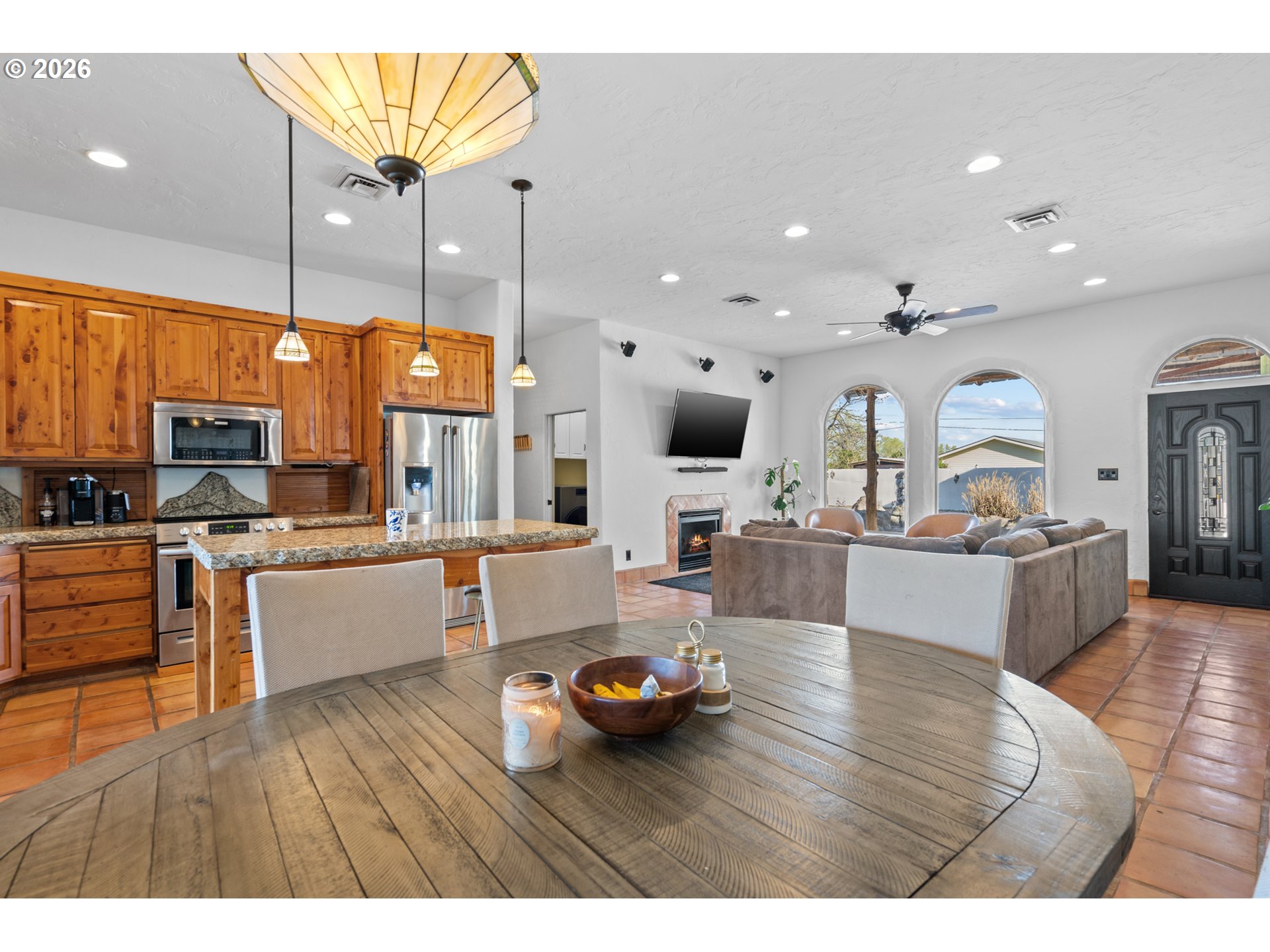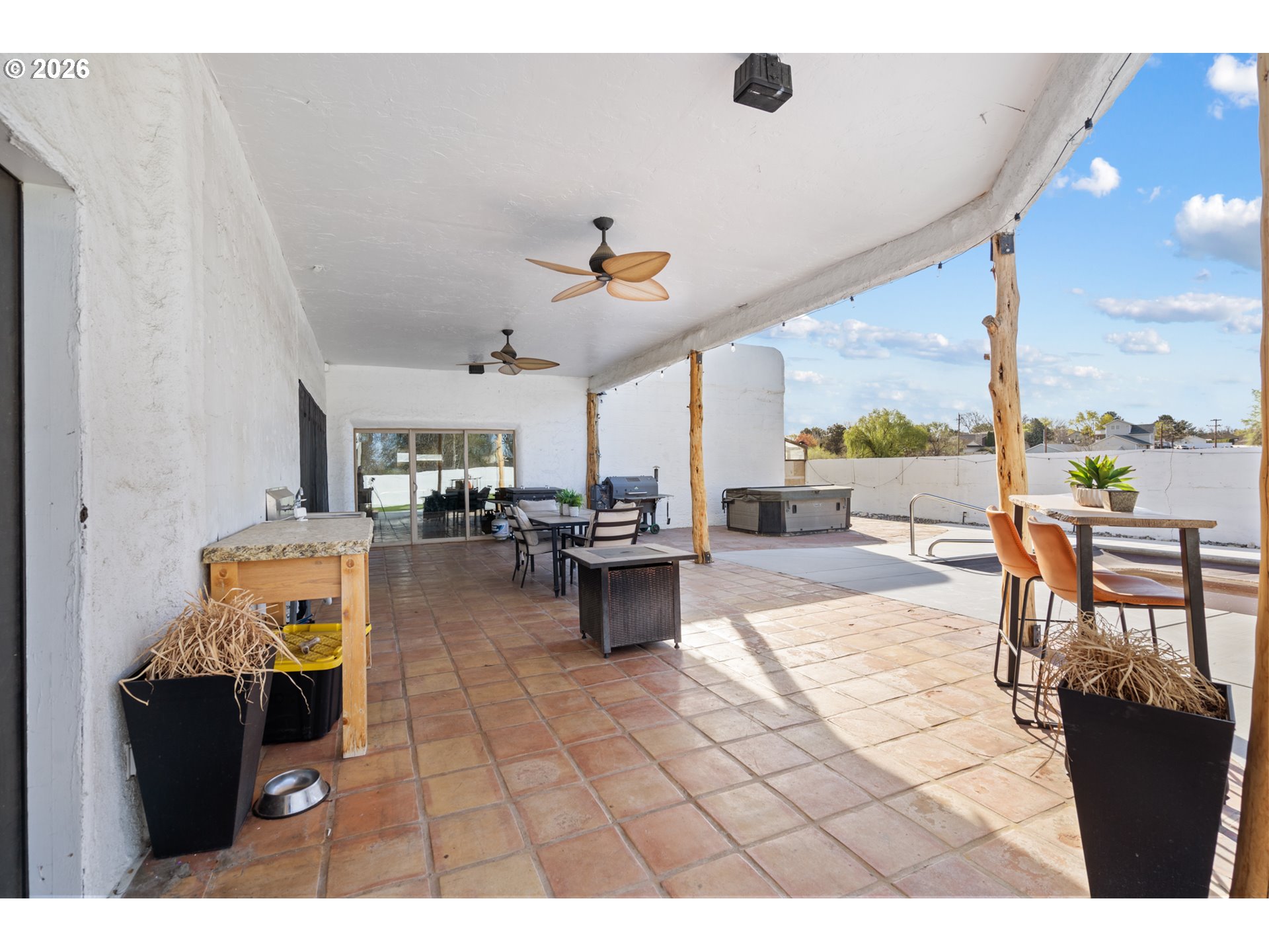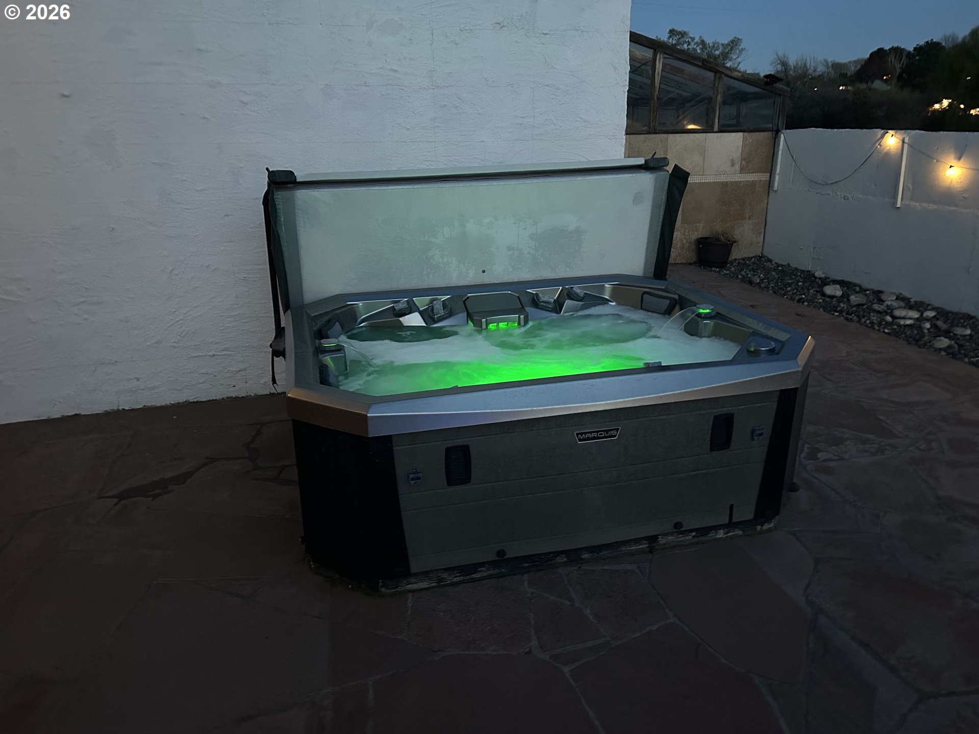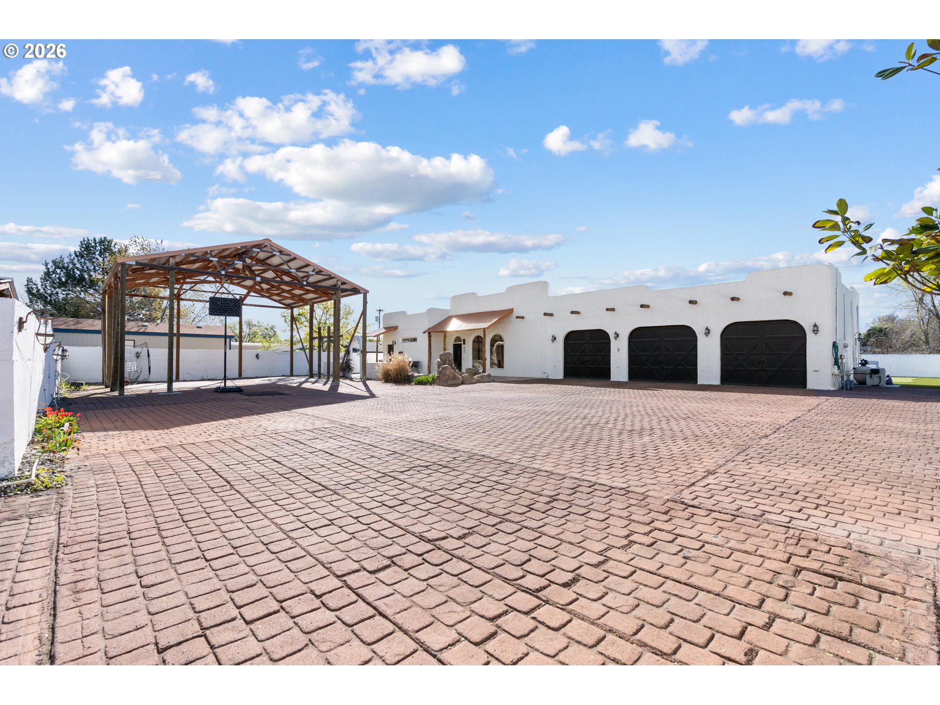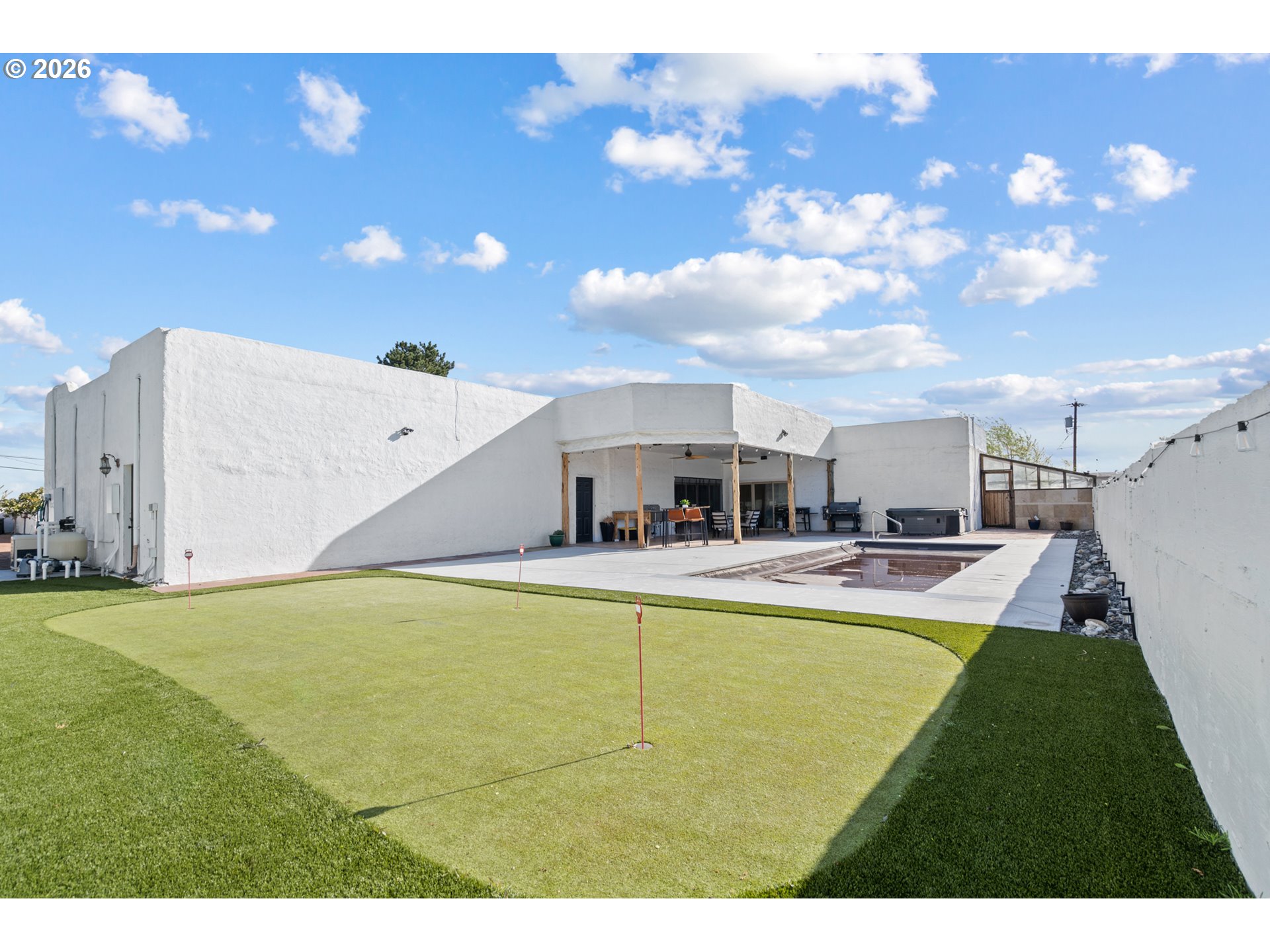 Private Estate | 3 Bed | 2 BathTucked behind a gated driveway and framed by a handsome stucco exterior, this 3-bedroom, 2-bathroom home truly has it all. A classic front fountain greets you on arrival, setting the tone for what's inside.The open floor plan is bathed in natural light, with warm tile floors running throughout. The custom kitchen is a standout — featuring thick, rough-edged granite countertops, quality appliances, a reverse osmosis system, and a generous pantry. The inviting living room centers around a cozy gas fireplace with surround sound speakers.The spacious primary suite features a large walk-in closet, beautifully tiled shower, and opens via slider directly to the stunning backyard, where you'll find a sparkling pool, bubbling hot tub, manicured putting green, and charming greenhouse — everything you need to enjoy the outdoors without the upkeep.Designed with low maintenance living in mind, this property lets you enjoy all the amenities without the hassle. The beautiful stamped concrete driveway and parking area are as functional as they are eye-catching, adding curb appeal while keeping maintenance simple and clean.Radiant heat runs throughout the home for year-round comfort. The oversized 3-car garage offers abundant storage, and a dedicated covered area accommodates an RV or boat with ease.This one checks every box.