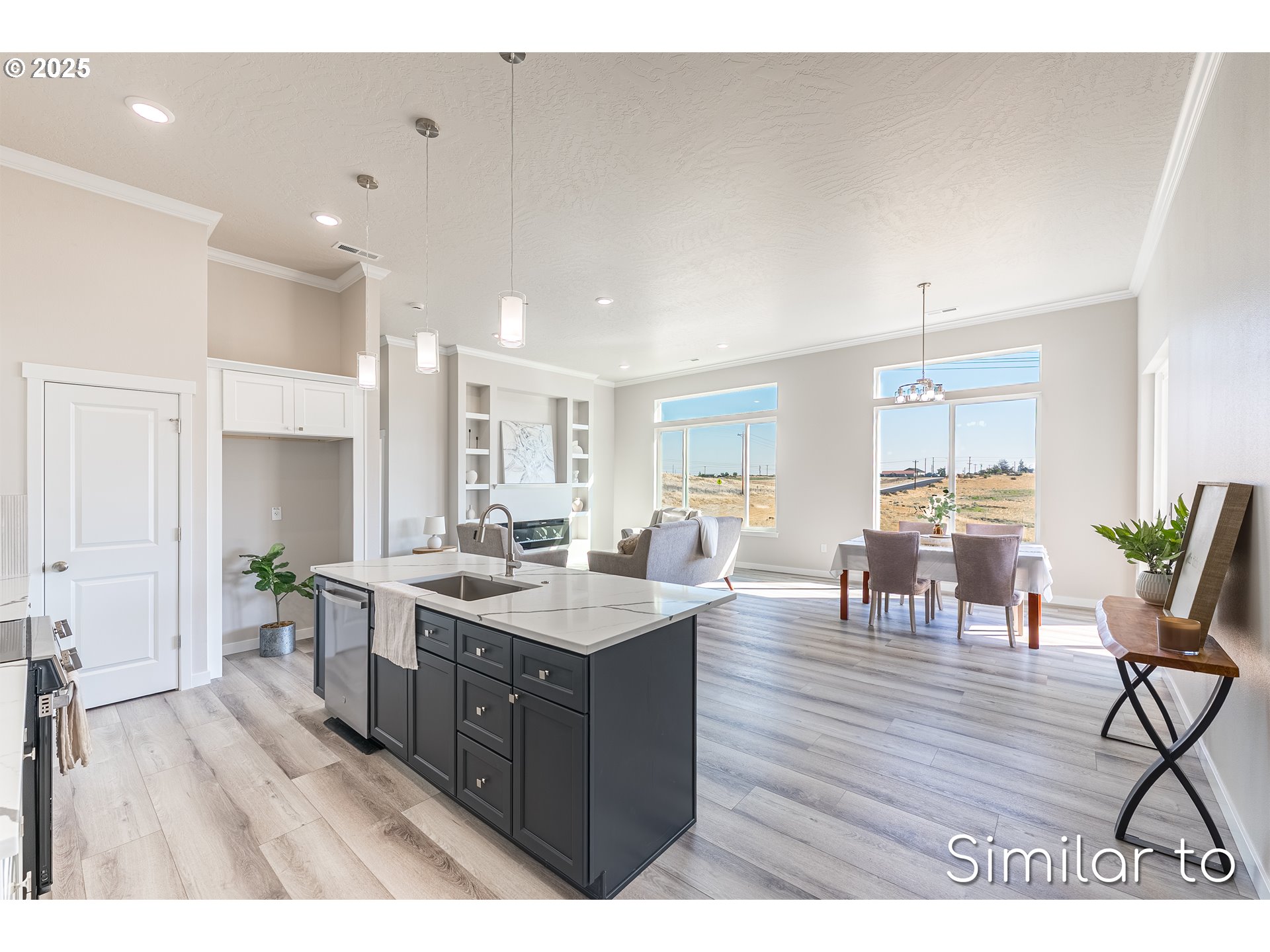 Discover unparalleled modern luxury in this brand-new 3-bedroom, 2-bathroom home, ideally situated on a desirable corner lot. The expansive open-concept living area is designed for entertaining, anchored by a beautiful kitchen island that serves as the home's centerpiece. Soaring 11-foot ceilings and large windows flood the great room with natural light, highlighting the luxury vinyl flooring. The gourmet kitchen is a chef's dream, featuring sleek quartz countertops, a gas range, and a full package of new kitchen appliances.Retreat to the primary suite, which boasts a luxurious, fully tiled spa-like master bath. This high-end design continues with quartz surfaces in all bathrooms. This home is truly turnkey, featuring a fully landscaped yard with underground sprinklers and a gas stub for your grill. Don't miss this exquisite Property. **Limited time offer** Fridge, Washer & Dryer ALSO included as a builder incentive!