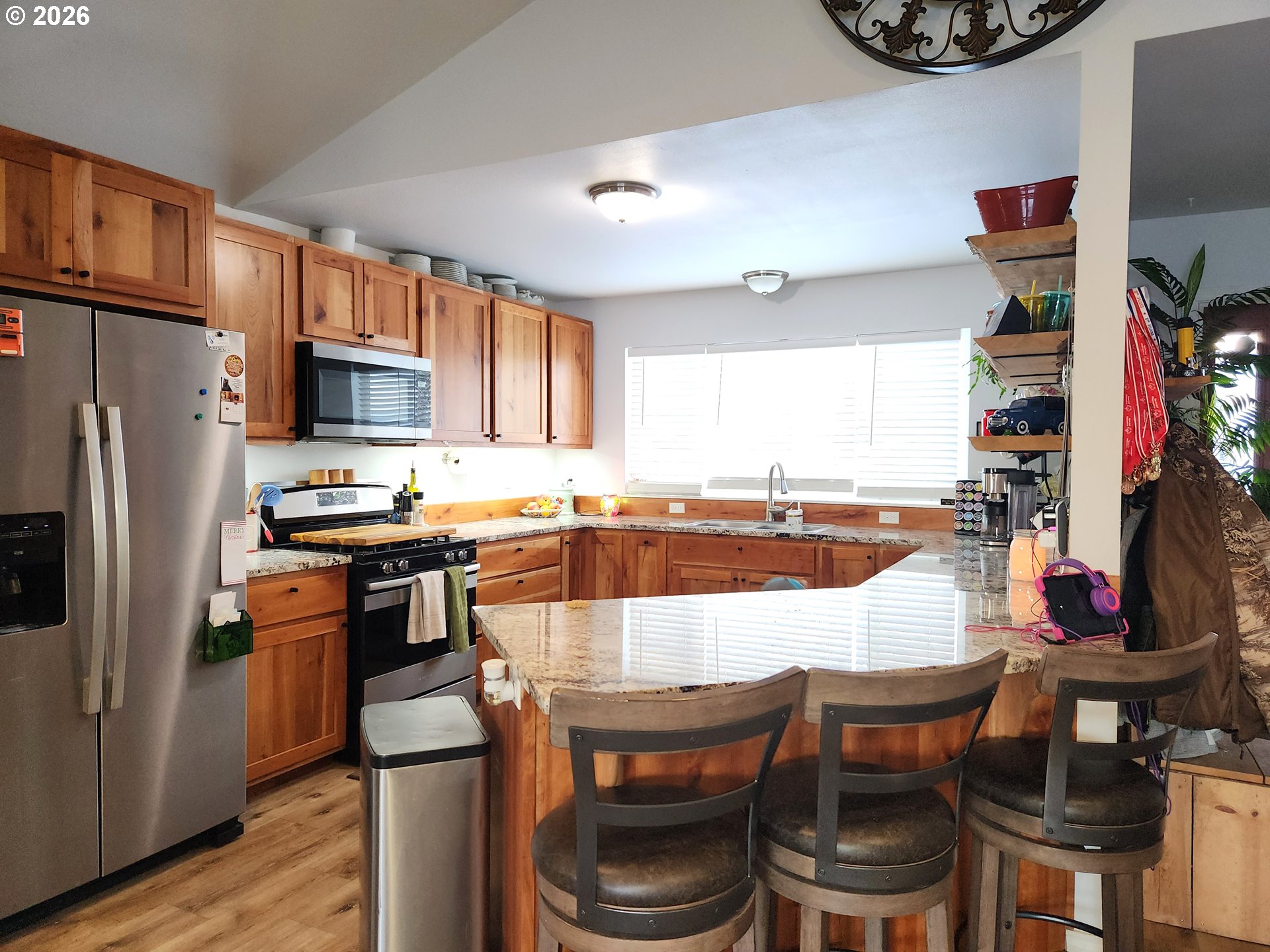 Set on one acre with sweeping mountain views, this 3-bedroom, 2-bath home offers a sense of space and stillness that’s hard to find. The vaulted ceilings in the living room create an open, airy feel, complemented by warm laminate flooring and a layout that flows easily into the well lit kitchen with custom, soft close cabinets by JC Woodworks, open shelving and room to gather. The primary suite offers generous comfort with a walk-in closet and private bath featuring a walk-in shower. Step outside and you’ll find more than just land—there’s a covered patio for quiet mornings, a fire pit for slow evenings, and outbuildings including a storage shed, small hay shed, lean-to, and chicken coop, ready for animals or projects of your own. The continuous gutters help keep the maintenance low. It’s the kind of place that invites a slower rhythm, where you can build a life that feels more like yours. If home feels like this, it might be worth paying attention.