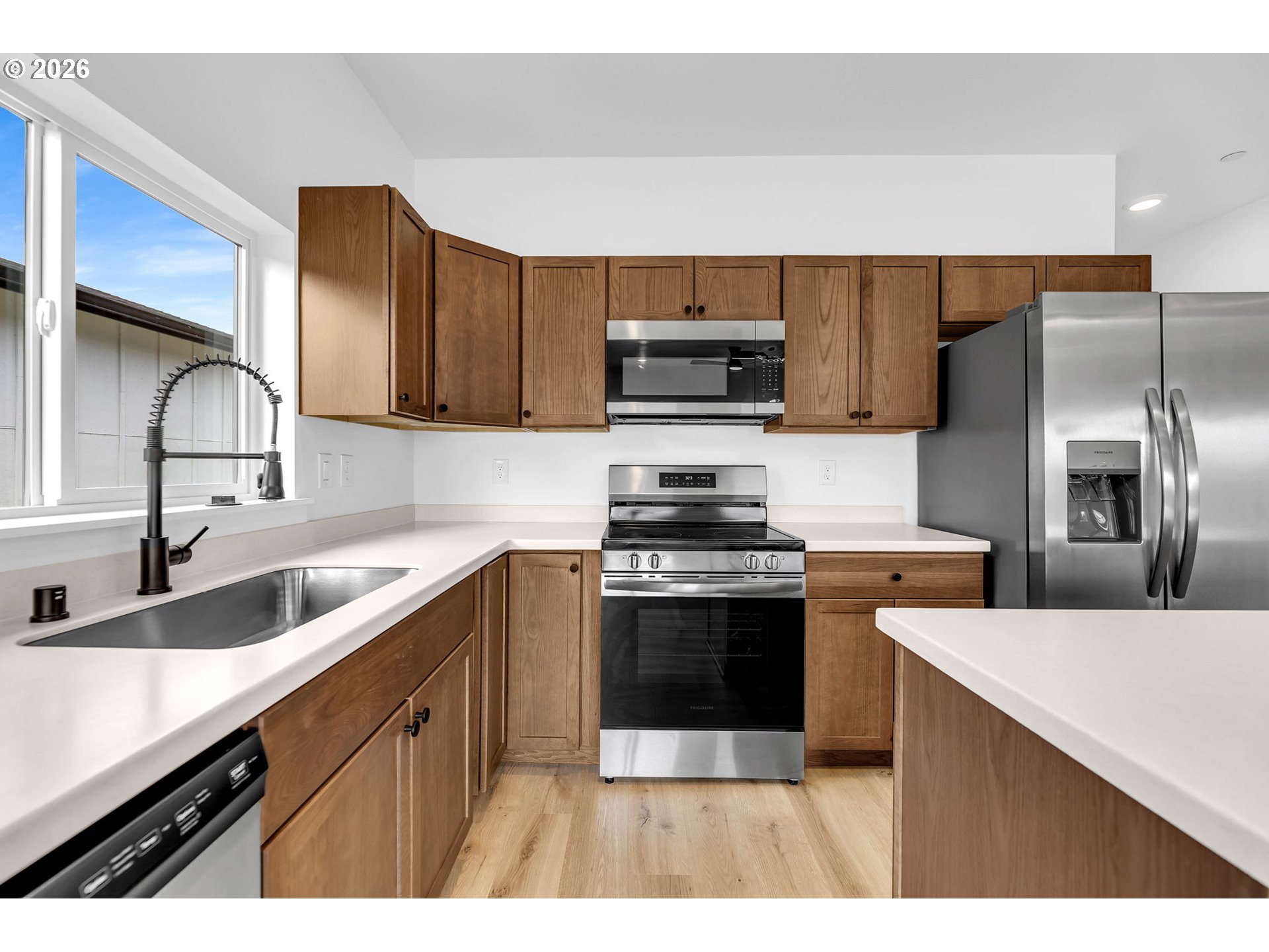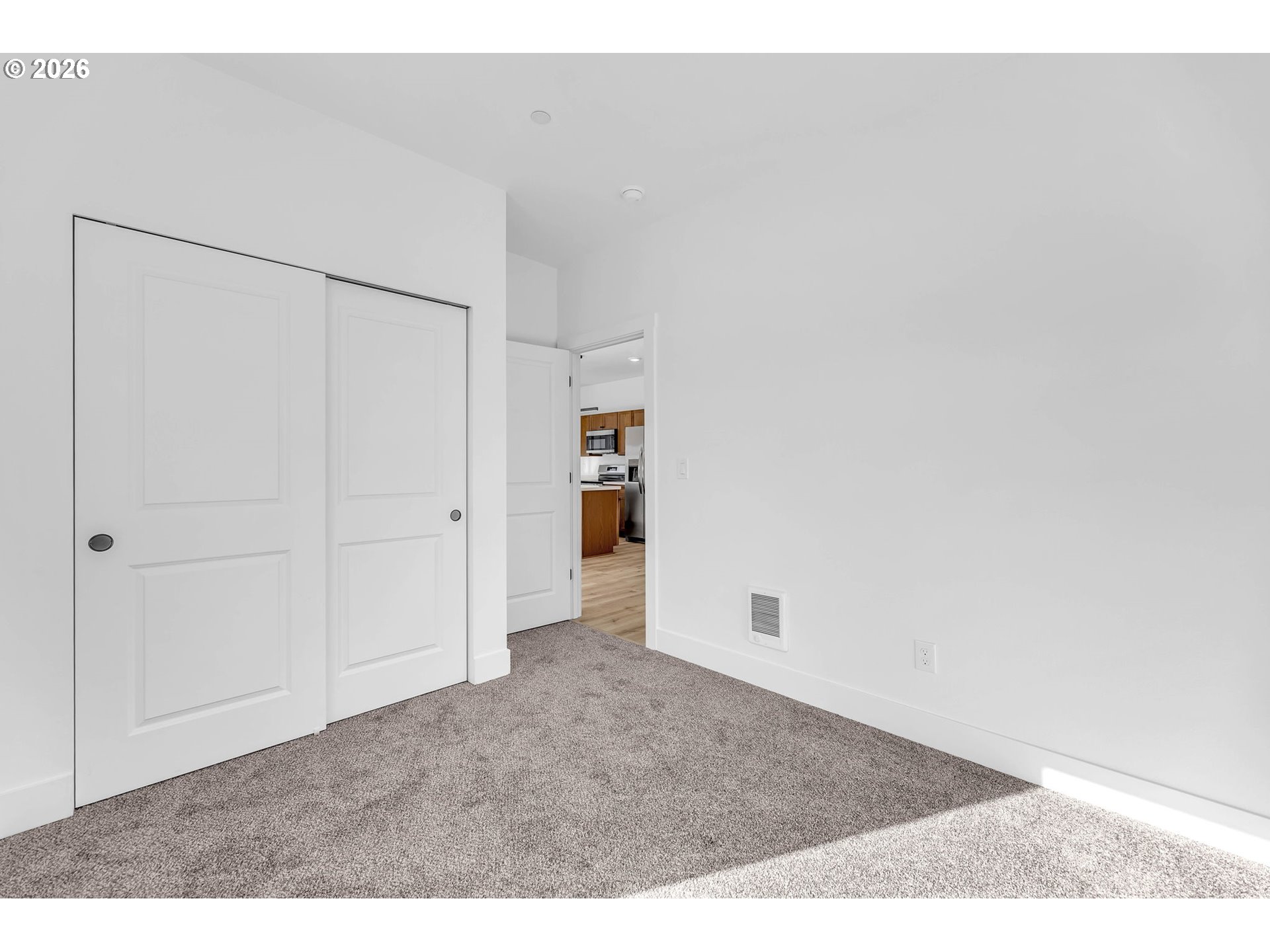 Brand-new construction at an affordable price with attractive finishes and a clean, modern design inside and out. Enjoy low-maintenance living in a new development with this 2 bed, 1 bath condo featuring a 1-car attached garage with EV Charger wiring, open-concept living, 9' ceilings, great lighting, A/C via a mini split, fire sprinklers, and LVP flooring. The kitchen offers stainless steel appliances including a built-in fridge, range, microwave, and dishwasher, along with white marble countertops and custom cabinetry. Covered front patio, back patio, Move-in ready and ready for its first owner.