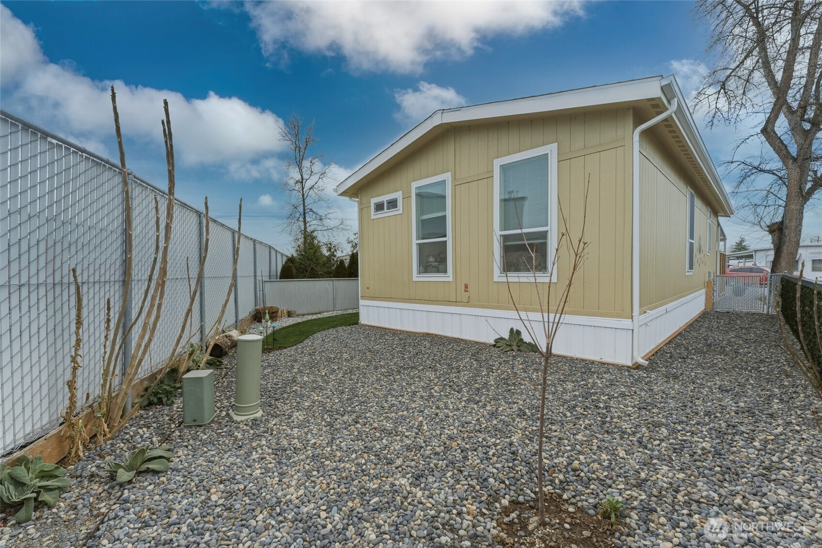 Welcome to this beautifully maintained, newer manufactured home where thoughtful design meets modern comfort. Purchased in 2025 & gently lived in by its original owner, this residence offers a near-new experience w/ a host of tasteful upgrades already in place. Step inside to an inviting open-concept layout, where a spacious living & dining area seamlessly connects to a bright, well-appointed kitchen. The stylish kitchen features ample cabinetry, generous counter space, a tile backsplash, stainless steel appliances, & a central island w/ bar seating & storage—perfect for casual dining & entertaining alike. The primary suite is complete w/ a large closet & ensuite bath. A second bedroom & full guest bathroom provide flexibility for visitors or home office. A dedicated laundry room includes both washer/dryer & adds everyday convenience. Outside, the home truly shines w/ thoughtfully curated improvements. The fully enclosed yard features added fencing & gates for privacy, low-maintenance landscaping w/ rock accents & rock garden, young trees, a small lawn, & a paved seating area ideal for relaxing or entertaining. Decorative paneling enhances both the carport & front porch, while custom solar screens provide comfort & efficiency throughout sun-exposed windows. Enjoy access to Rancho Villa’s community amenities, including a park, clubhouse, & nearby walking trails—all conveniently located just minutes from shopping & dining -all ages encouraged to apply w/ the park! Welcome home!