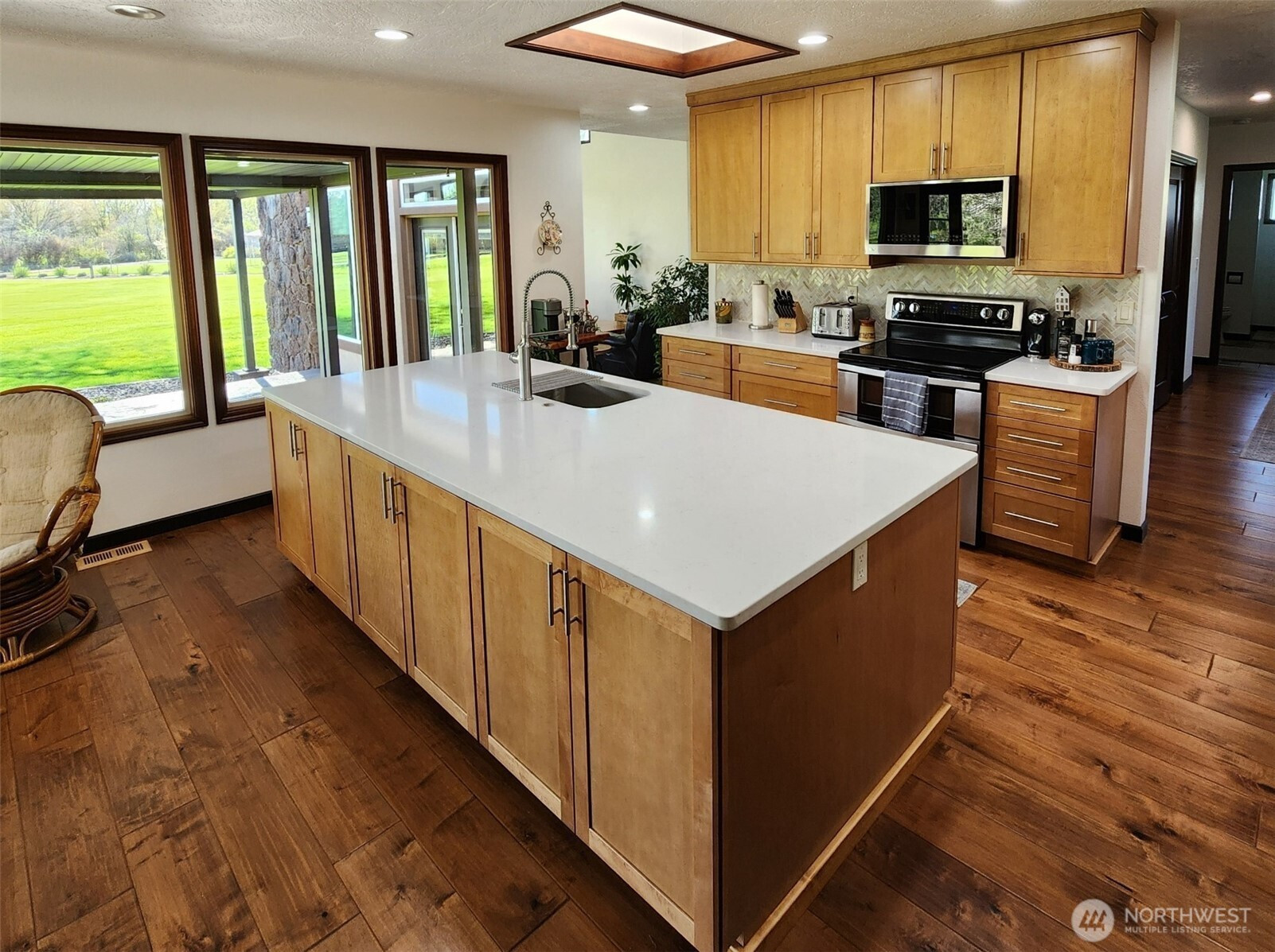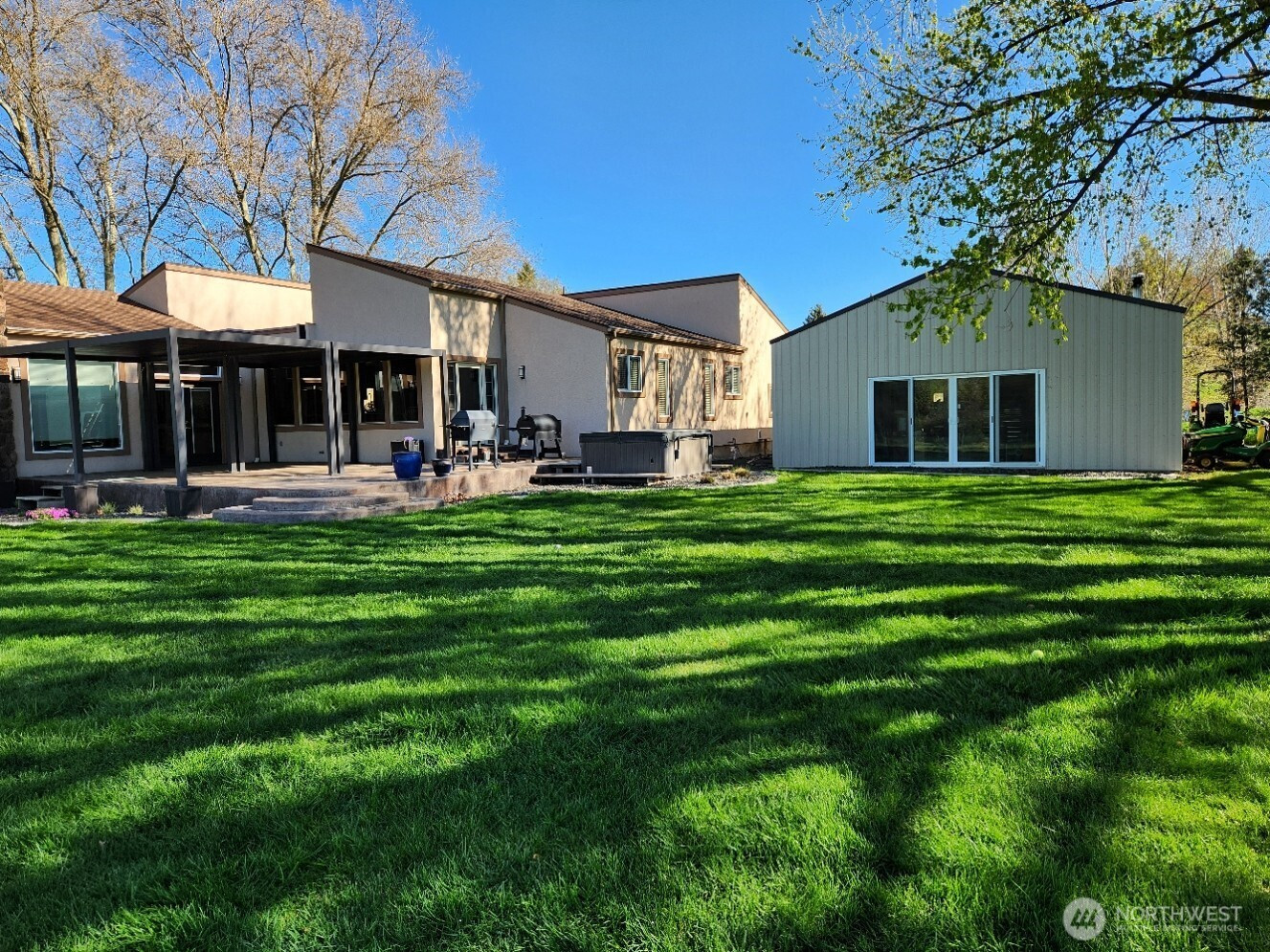 Live in the country and take in the view of the lawns and neighboring trees, horses and cows each numbering about 6 that entertain us daily here on 3.11 acres just 6 minutes from Walmart area shopping and eating. There is extensive cabinet storage between the Kitchen and Laundry room just off the Kitchen. There have been many upgrades to home and yard during our 5 years here: 27X48 insulated Pole Building with concrete floor, electrical service and 12-foot-wide full view glass slider of the back yard; underground irrigation in yard and pastures, concrete curbing, Old Hickory shed, kitchen cabinets and appliances, flooring, interior painting and rear patio adjustable louvered cover. The back yard is like a park with seasonal Stone Creek and shade trees. The yard is fully fenced with an access gate. 3 Phase power for Pasture Irrigation. There is additional covered parking in Pole Building.