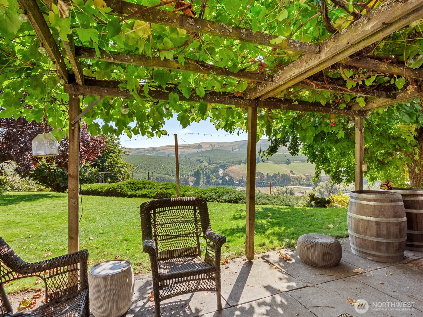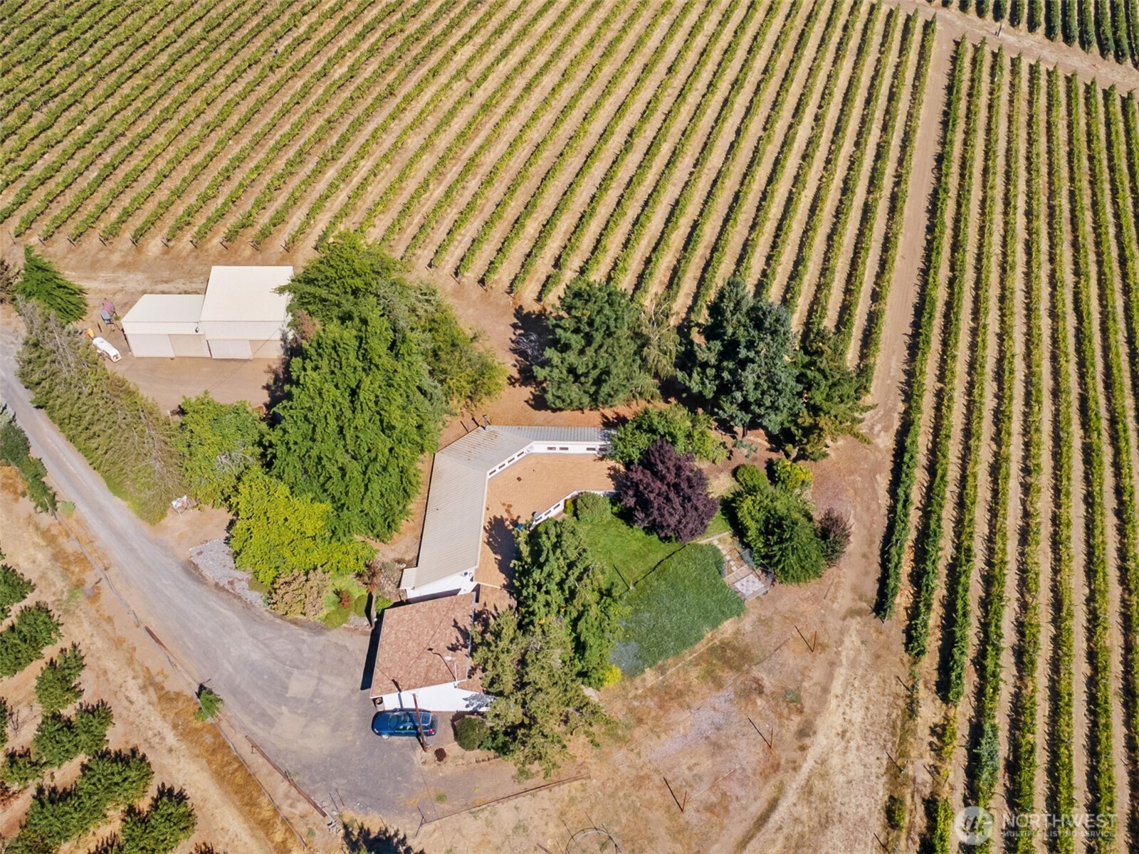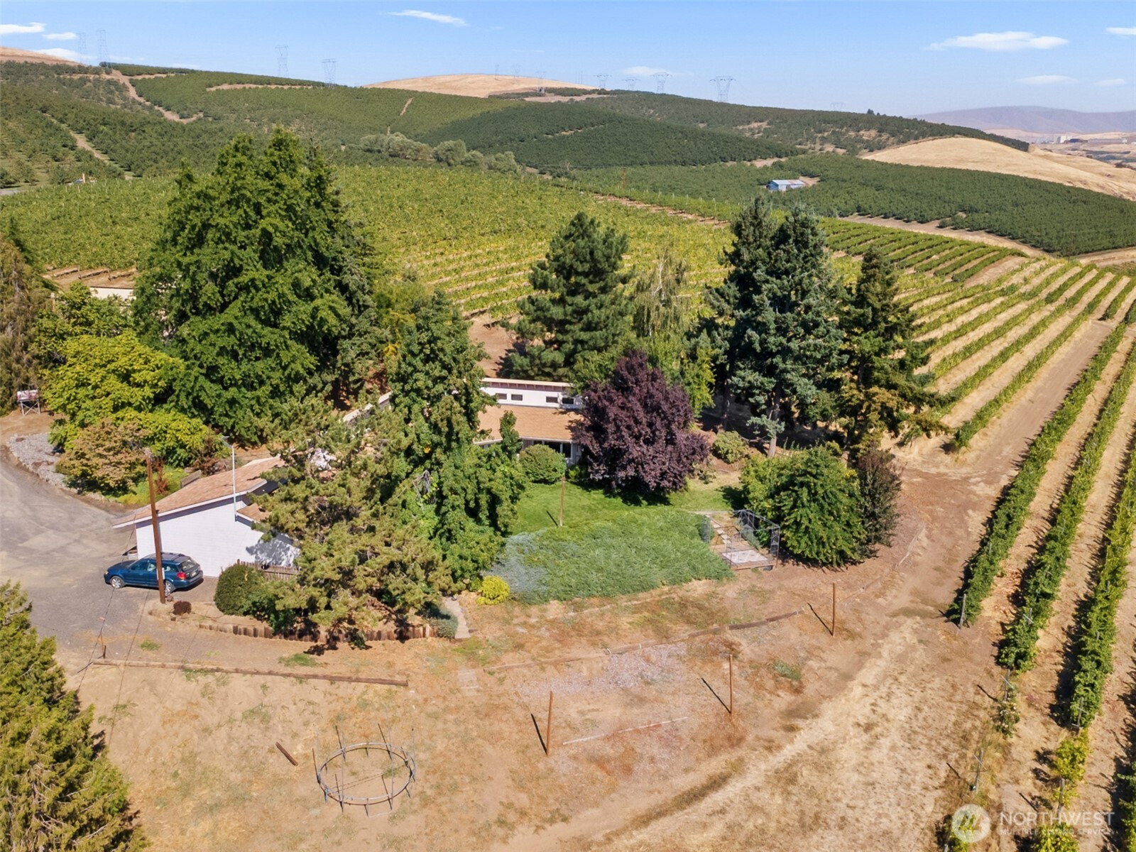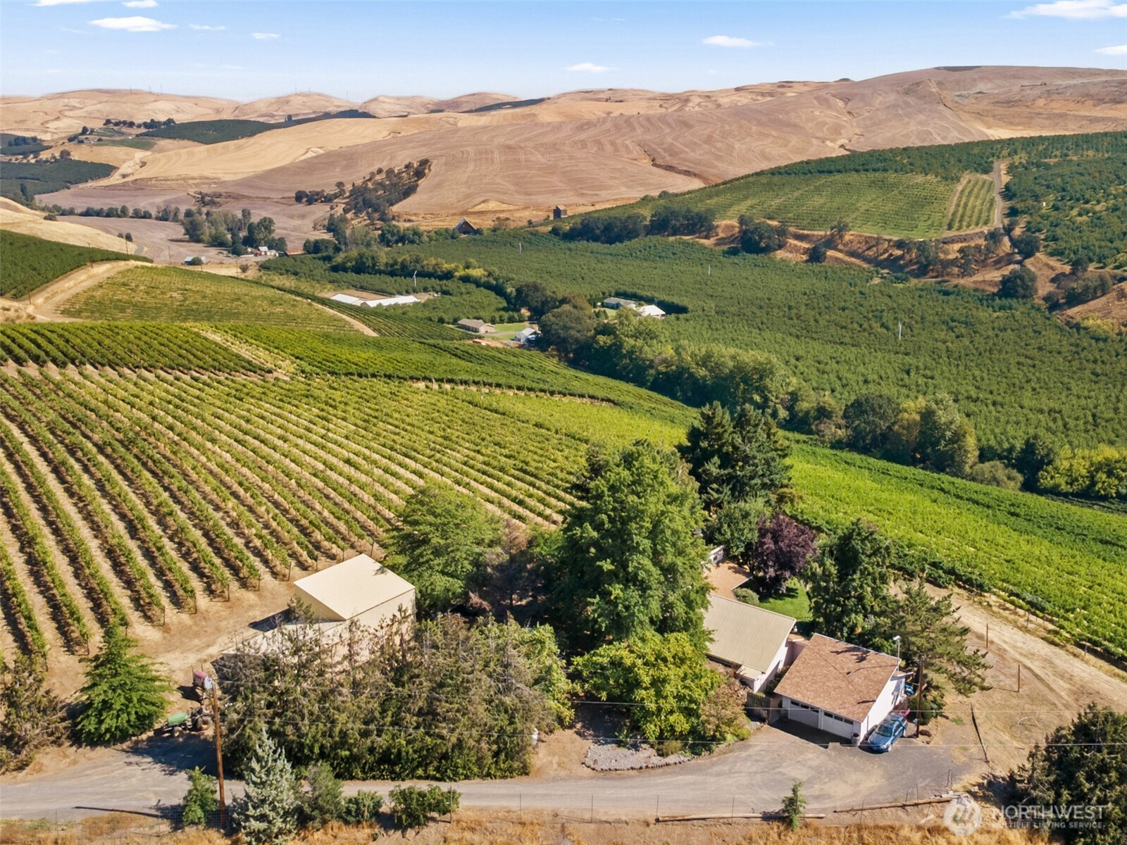 Nestled on just over 29 gently sloping acres, this stunning vineyard property offers the perfect blend of lifestyle, beauty, and agricultural opportunity. Planted between 1982 and 2001, the vineyard features premium varietals including Pinot Noir, Cabernet, Chardonnay, Riesling, and more — each thriving on the south-facing slope that maximizes sunlight exposure and grape quality. The vineyard is fully equipped with drip irrigation and frost mitigation sprinklers, with water provided by The Dalles Irrigation District, ensuring efficient and reliable management throughout the growing season. At the heart of the property sits a single-level, 2,000 sq. ft. home, built in 1983.
