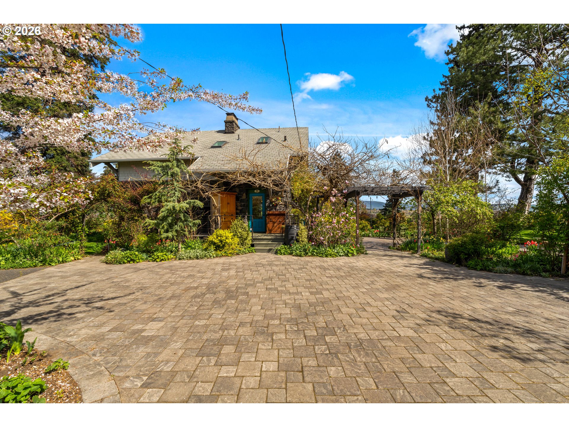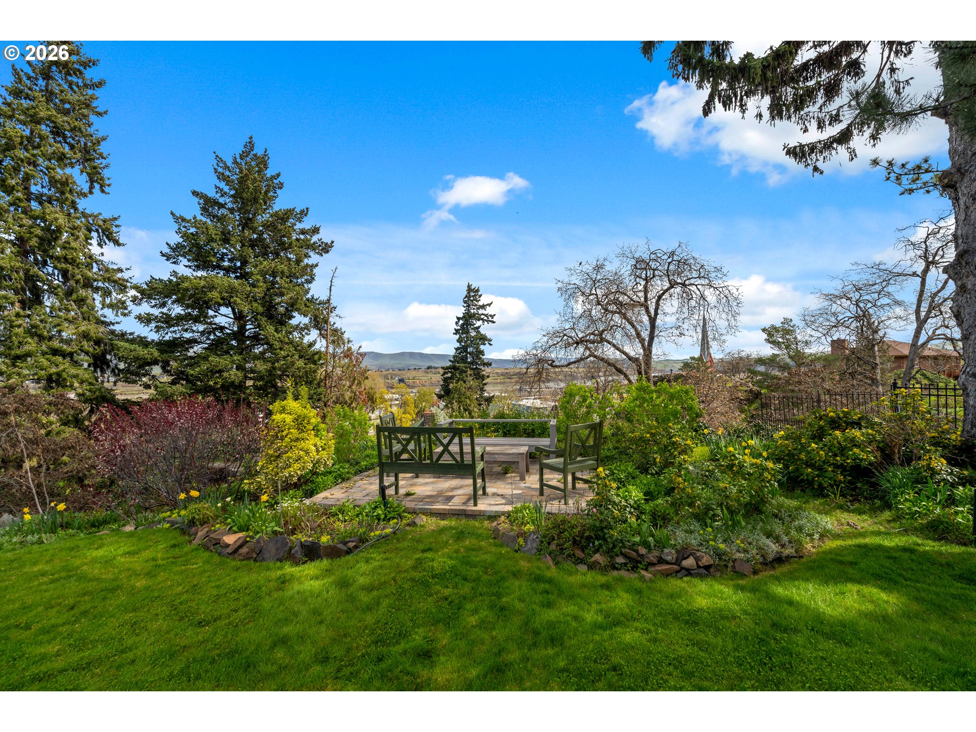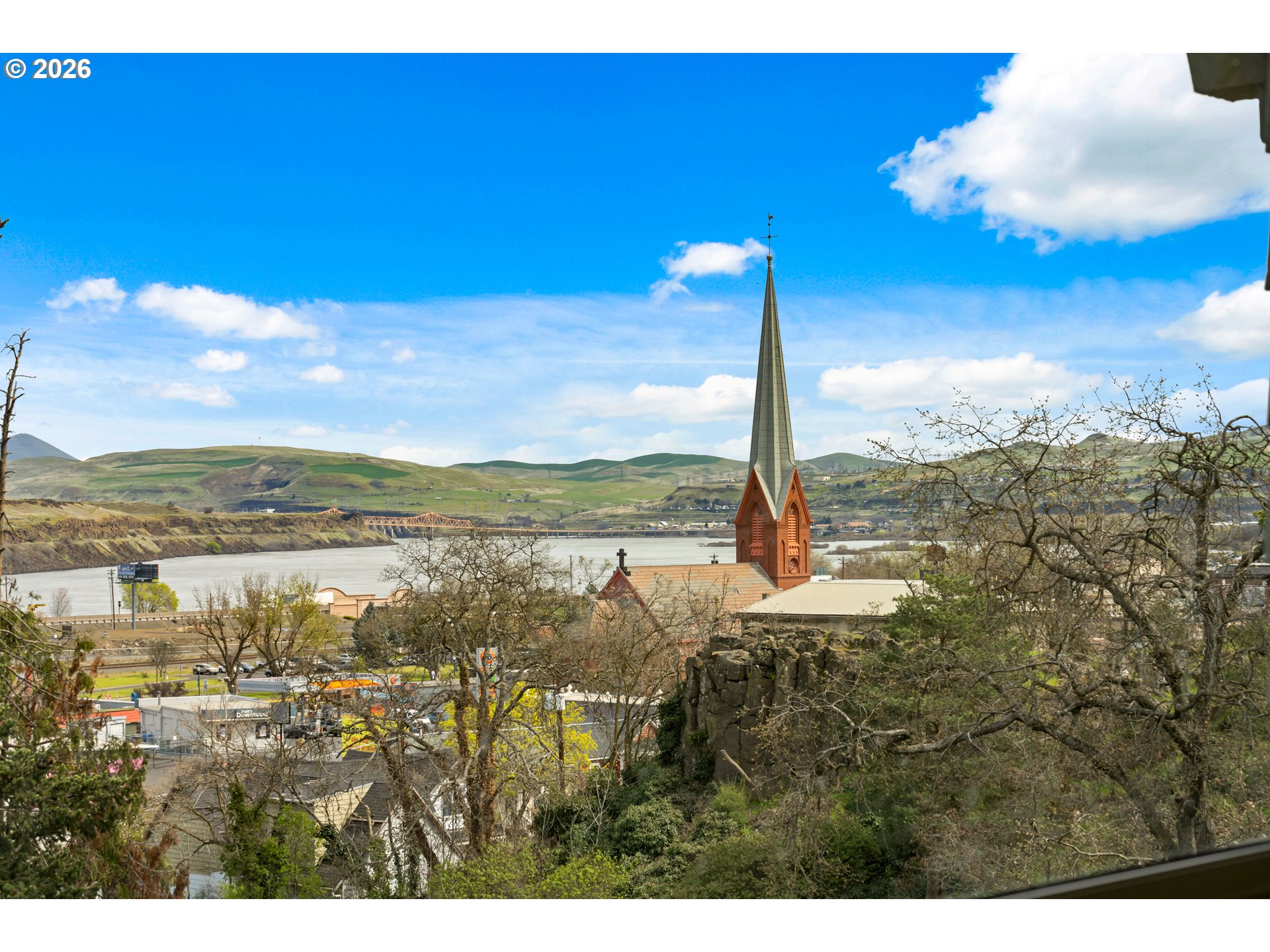 Perched high above town, this is a truly rare offering — an in-town sanctuary that feels worlds away. Set among mature Ponderosa Pines and Douglas Firs, the property unfolds like a private garden estate, with curated landscaping, winding paths, and intimate seating areas framed by sweeping views of the Columbia River, Mt. Adams, the Klickitat Hills, and St. Peter's Landmark. That dramatic backdrop doesn't stop at the door — it carries through the home itself. Rich in history and craftsmanship, the property features a signature basalt arch and a stone stairway connecting the garden to 3rd Street — details originally crafted by the Tronzano Bros. that speak to the enduring quality woven into every corner of this home.Inside, thoughtful updates honor the home's character rather than erase it. The kitchen has been reimagined with custom cabinetry, quartz countertops, and premium appliances including an induction cooktop. Original quarter-sawn oak floors on the main level and maple upstairs add warmth and authenticity, while the living room is anchored by a striking basalt gas fireplace. Modern comfort is well covered with radiant heat in the upper bath, mini-splits throughout, and a gas furnace. Upstairs, light-filled bedrooms and a tucked-away bonus space offer flexibility for guests, a home office, or creative use. The detached two-car garage includes an additional ~360 sq ft of flex space with real potential for a studio or ADU (buyer to verify). A gated entry provides privacy, with ample off-street parking for an RV or boat. Whether you're drawn by the views, the history, the gardens, or the lifestyle — this is Pacific Northwest living at its finest, with the added possibility of short-term rental income.