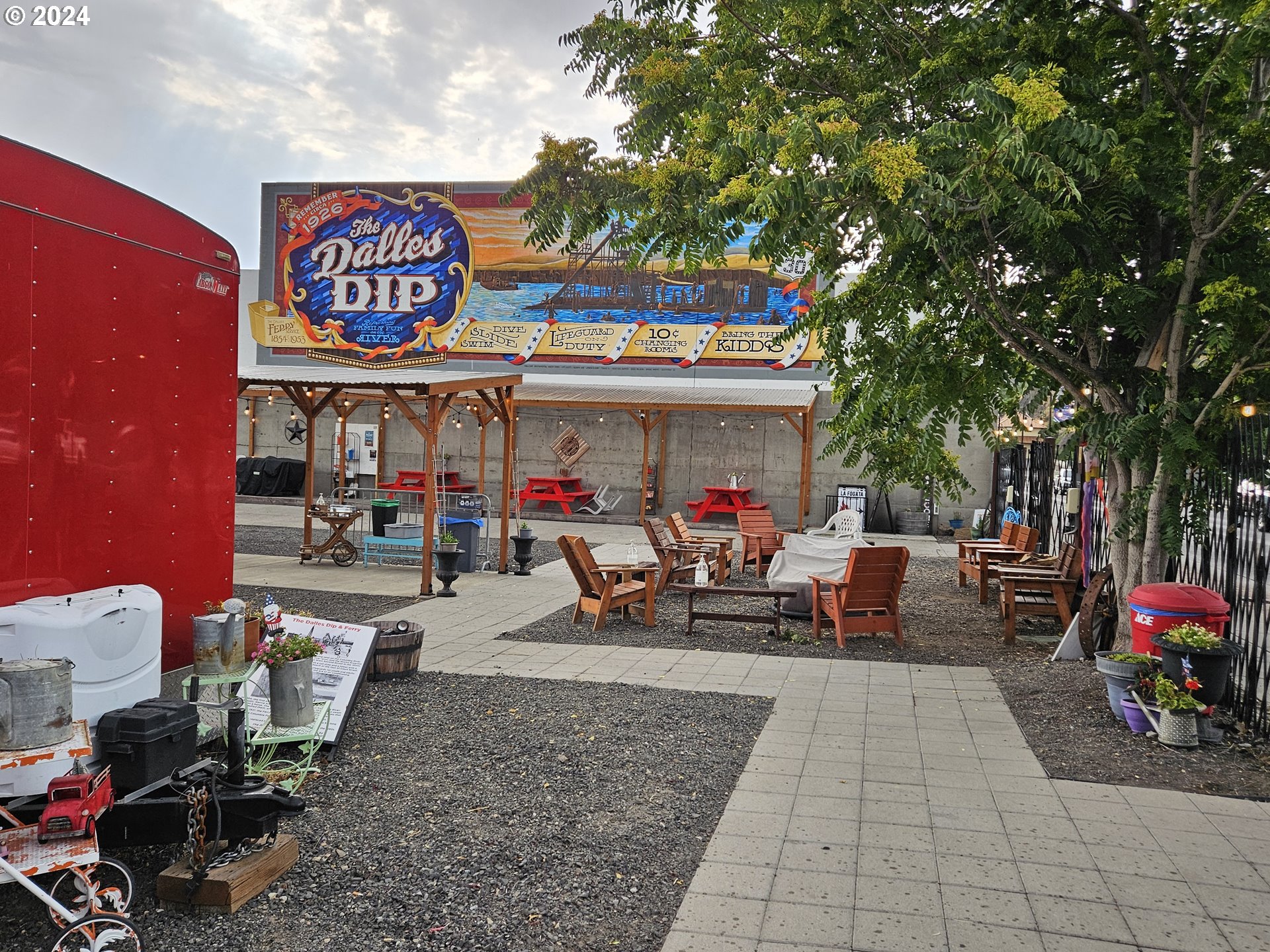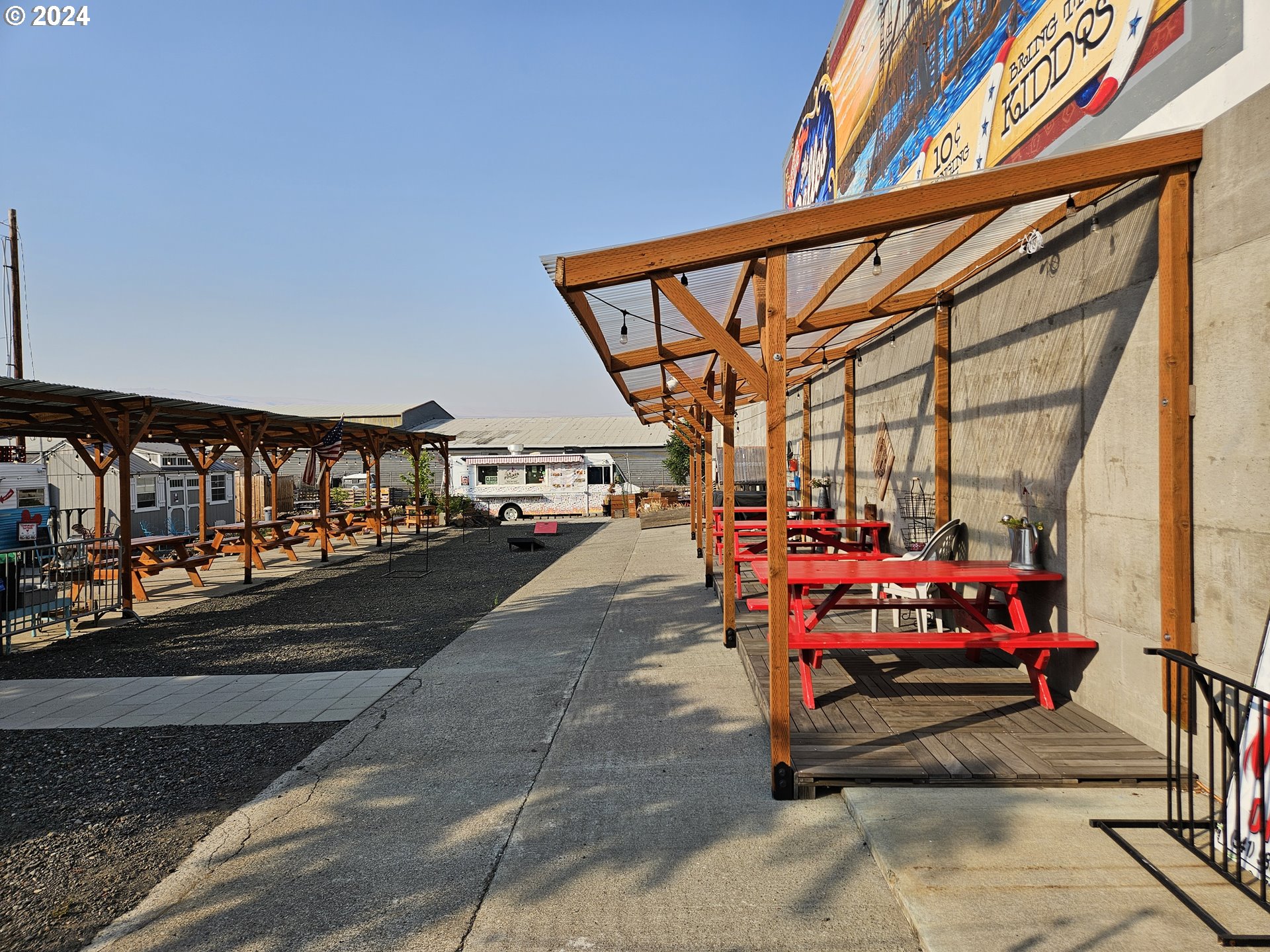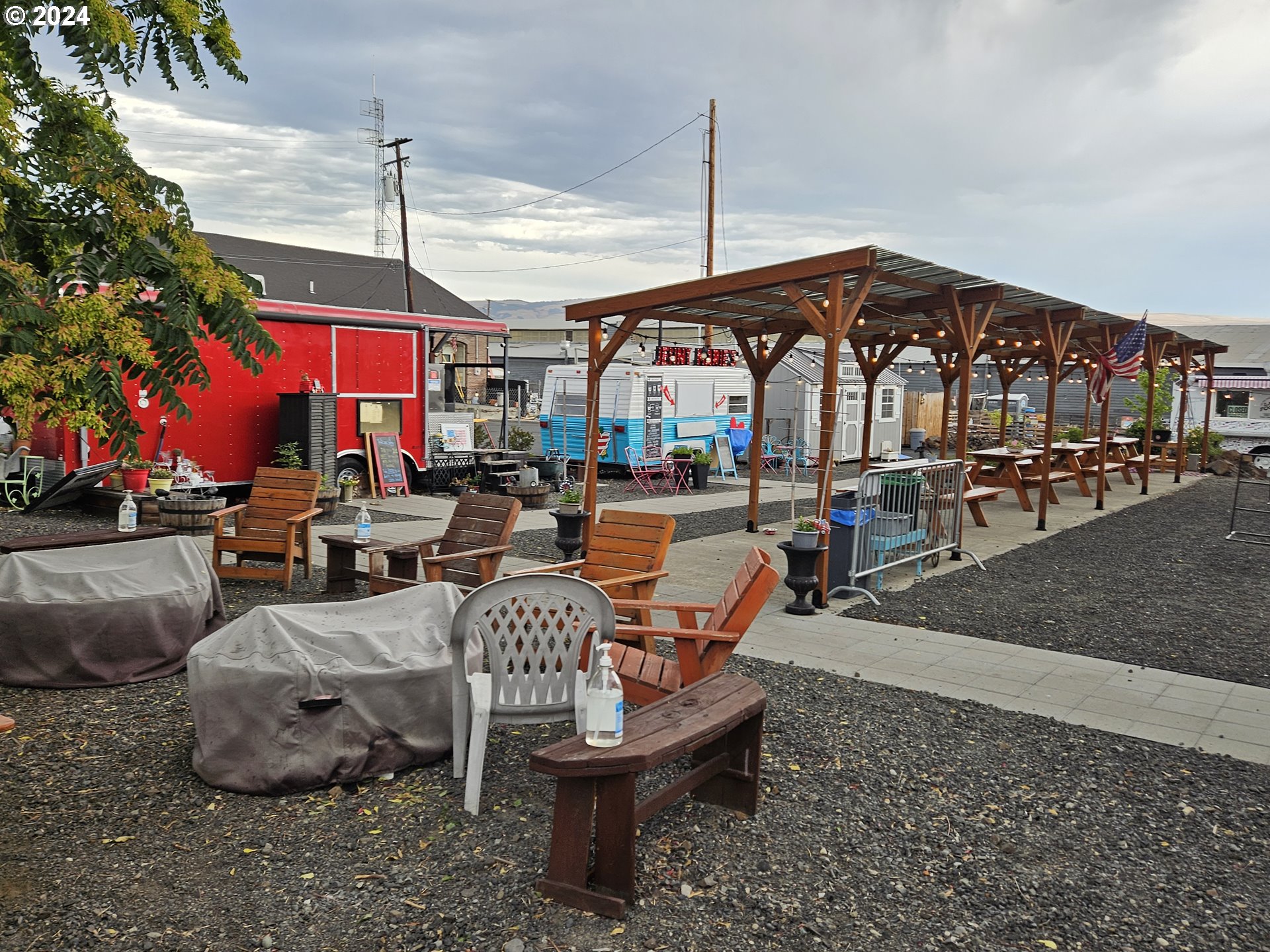 "The Landing" Food Cart Park at 801 E 2nd in Historic Downtown The Dalles offers spaces for 6 food carts, has multiple covered outdoor seating areas, entertainment spaces, and a 1,500 sq ft undeveloped indoor space ready for your imagination. The Park sits on a large 14,375 sq ft lot that can continue to be developed out by a new owner.