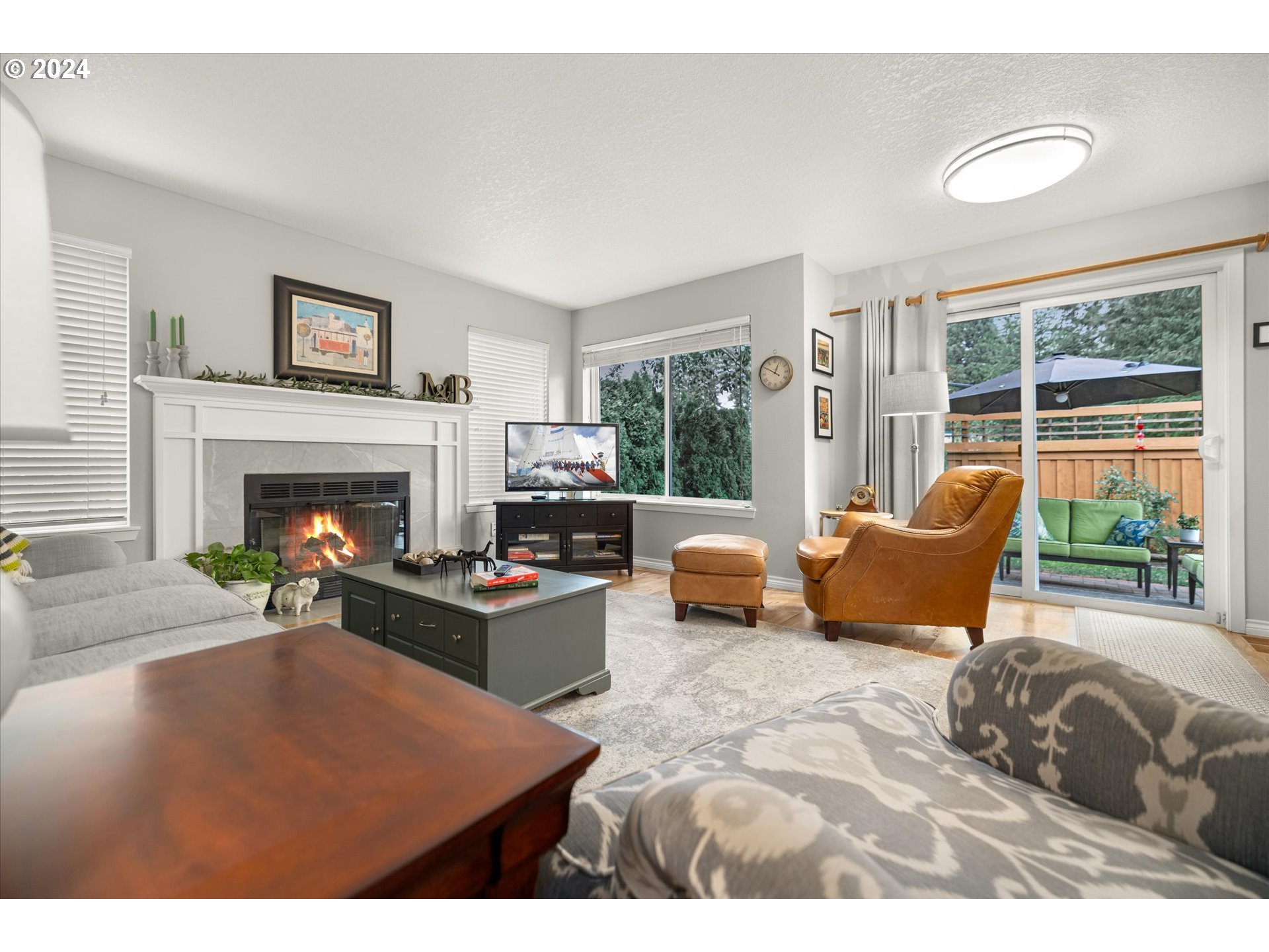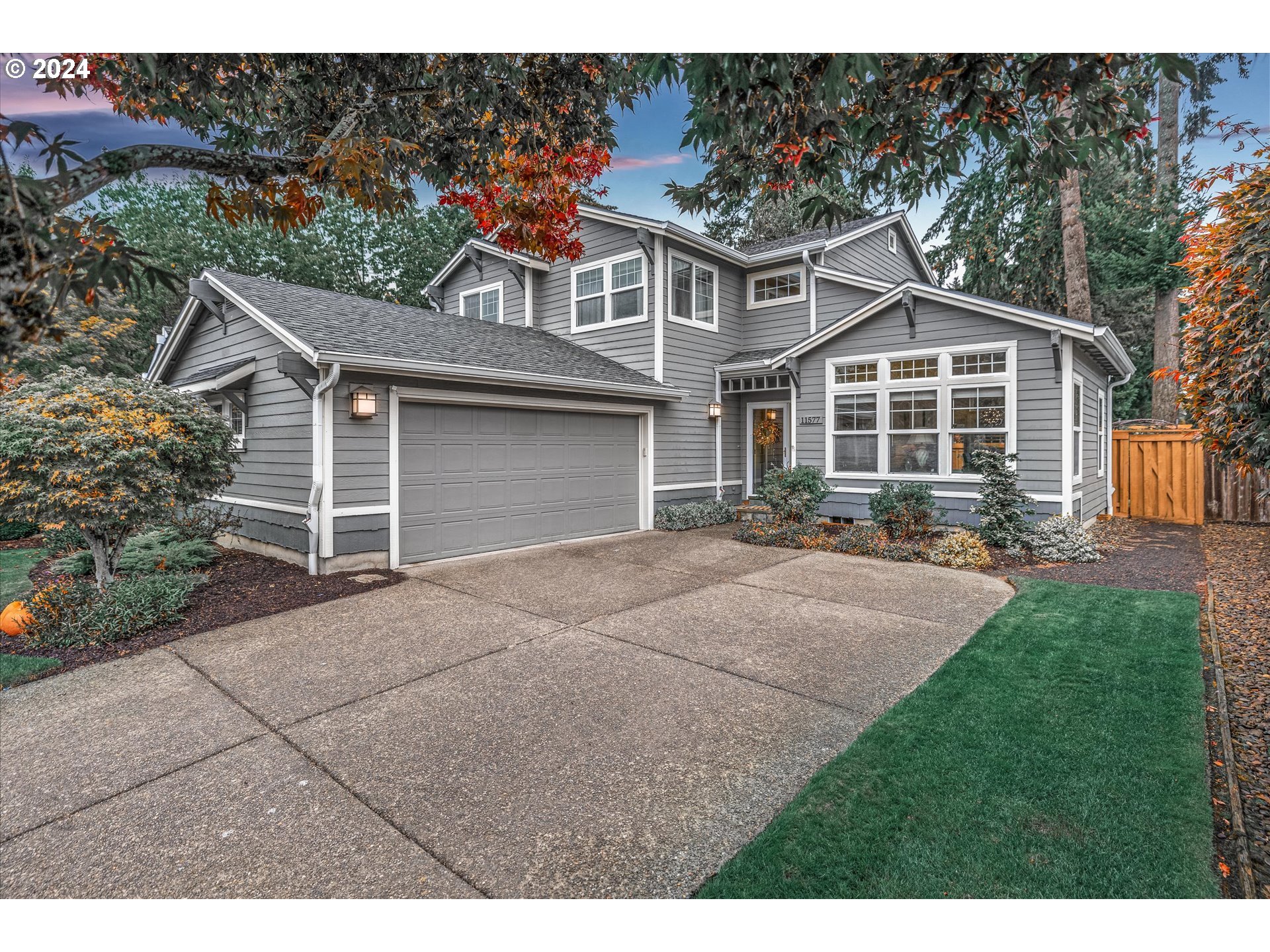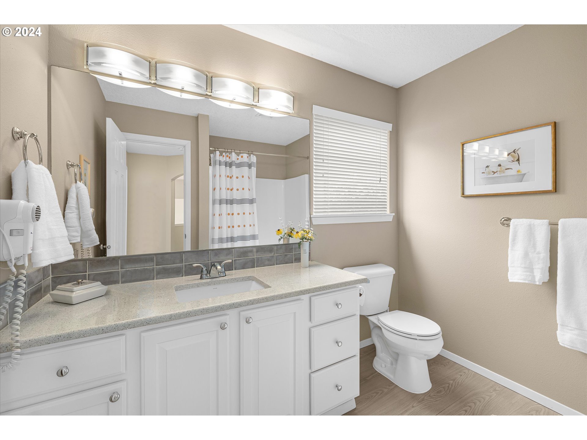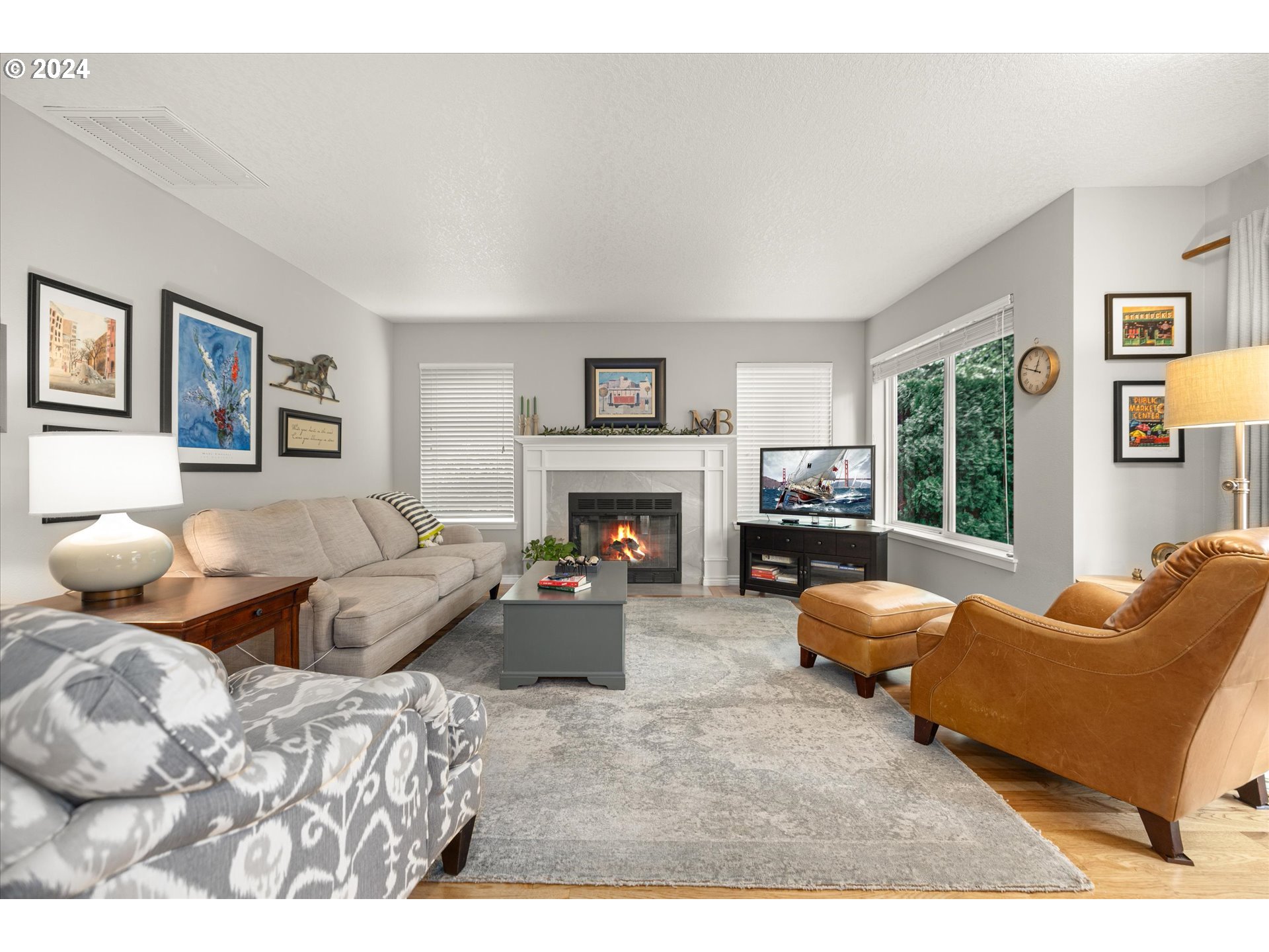 This stunning 3-bedroom, 3-bathroom home with a versatile office (potential 4th bedroom) offers a blend of elegance, comfort, and convenience. Located in a peaceful cul-de-sac surrounded by beautifully maintained homes, it exudes pride of ownership and curb appeal.Upon entering, you’re greeted by a spacious, light-filled living room with vaulted ceilings, leading seamlessly to a dining area with scenic backyard views. The updated kitchen is a true centerpiece, featuring quartzite countertops, stainless steel appliances, and Hickory hardwood floors that extend into the cozy family room with a gas fireplace. Large windows on both levels flood the home with natural light, creating a warm and welcoming atmosphere.The main level includes two open living areas, a full bath, and laundry room. Upstairs, the luxurious primary suite boasts vaulted