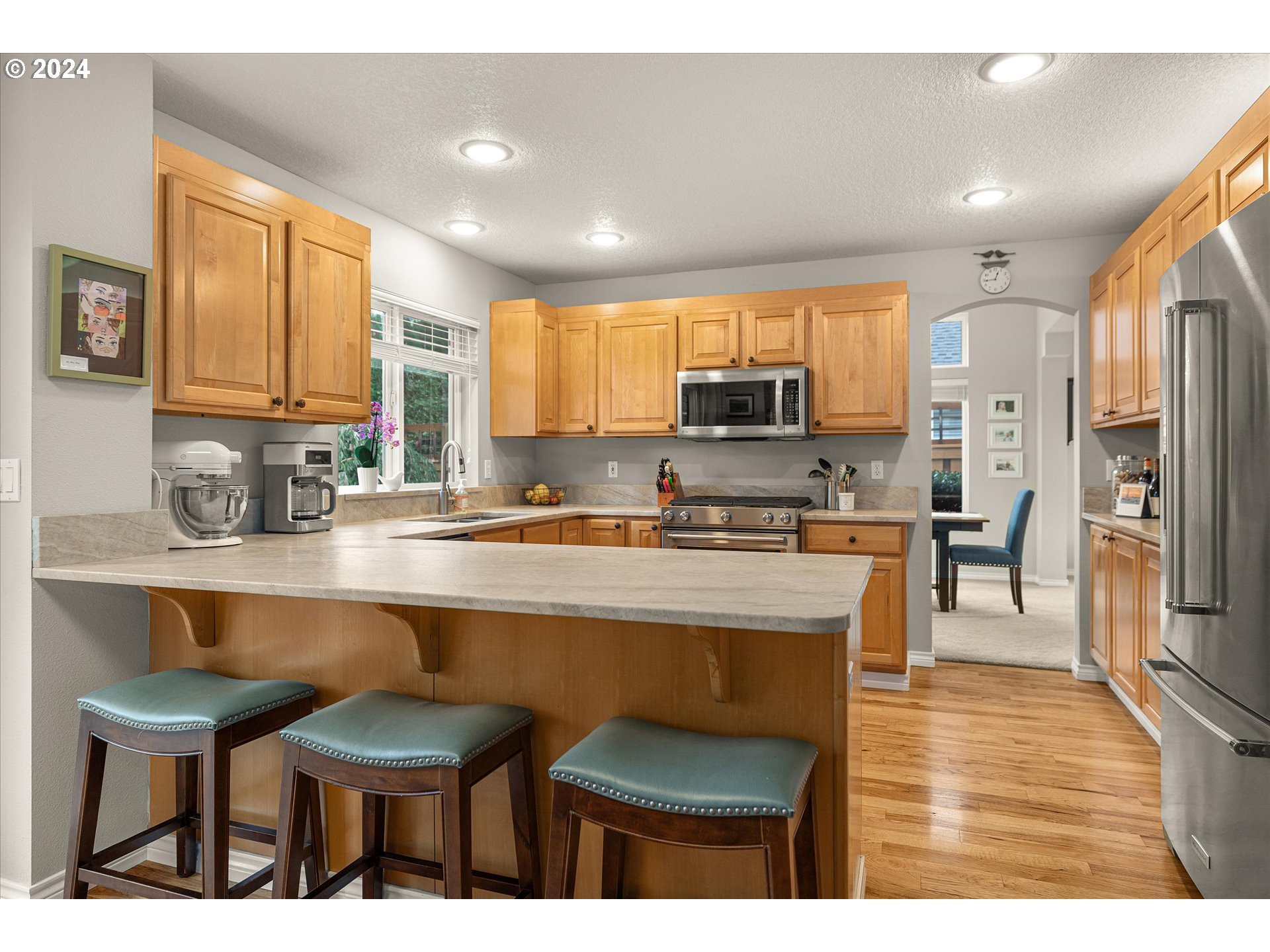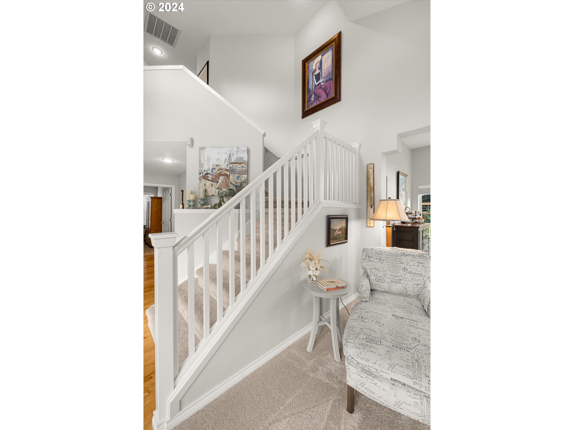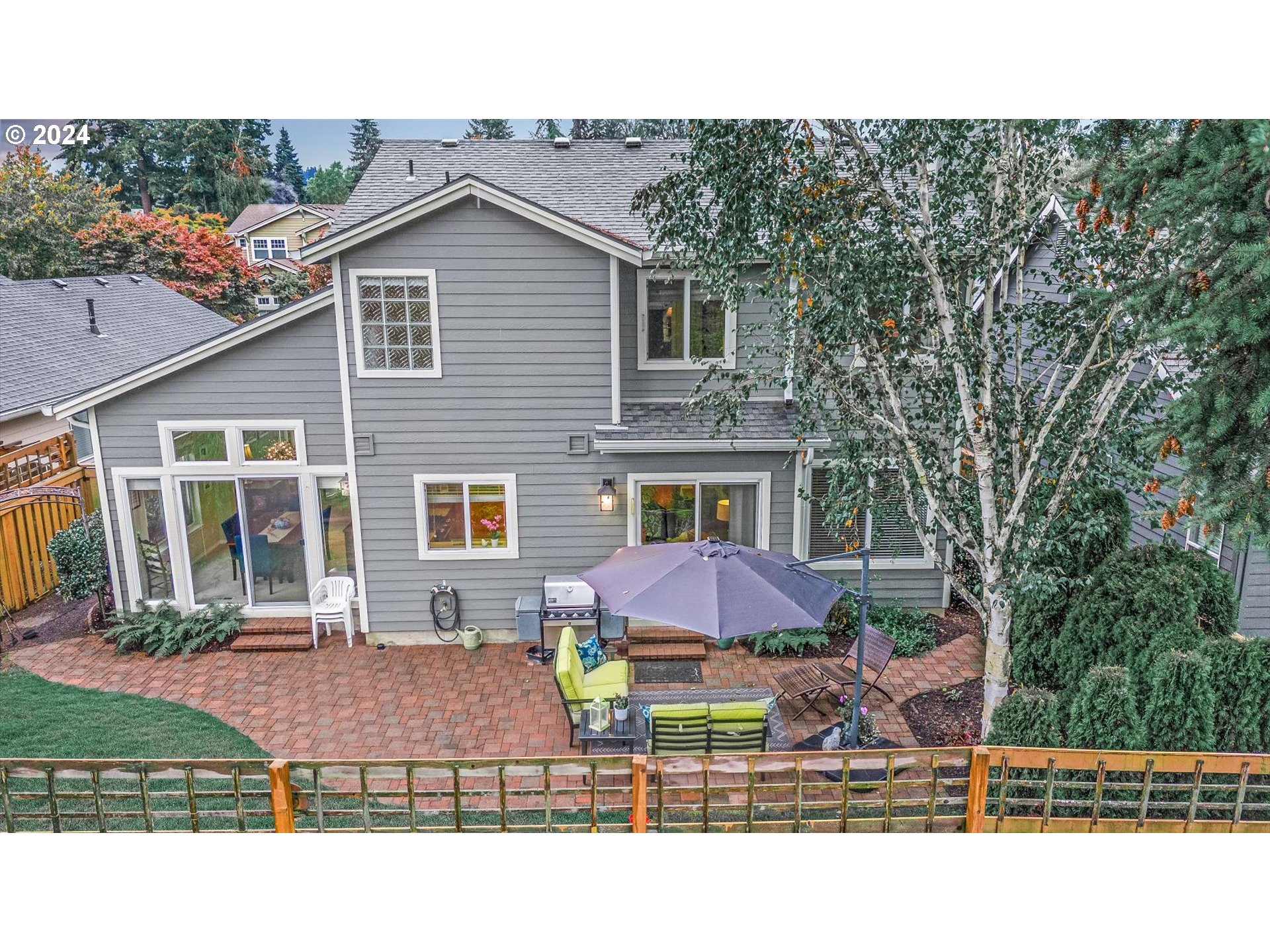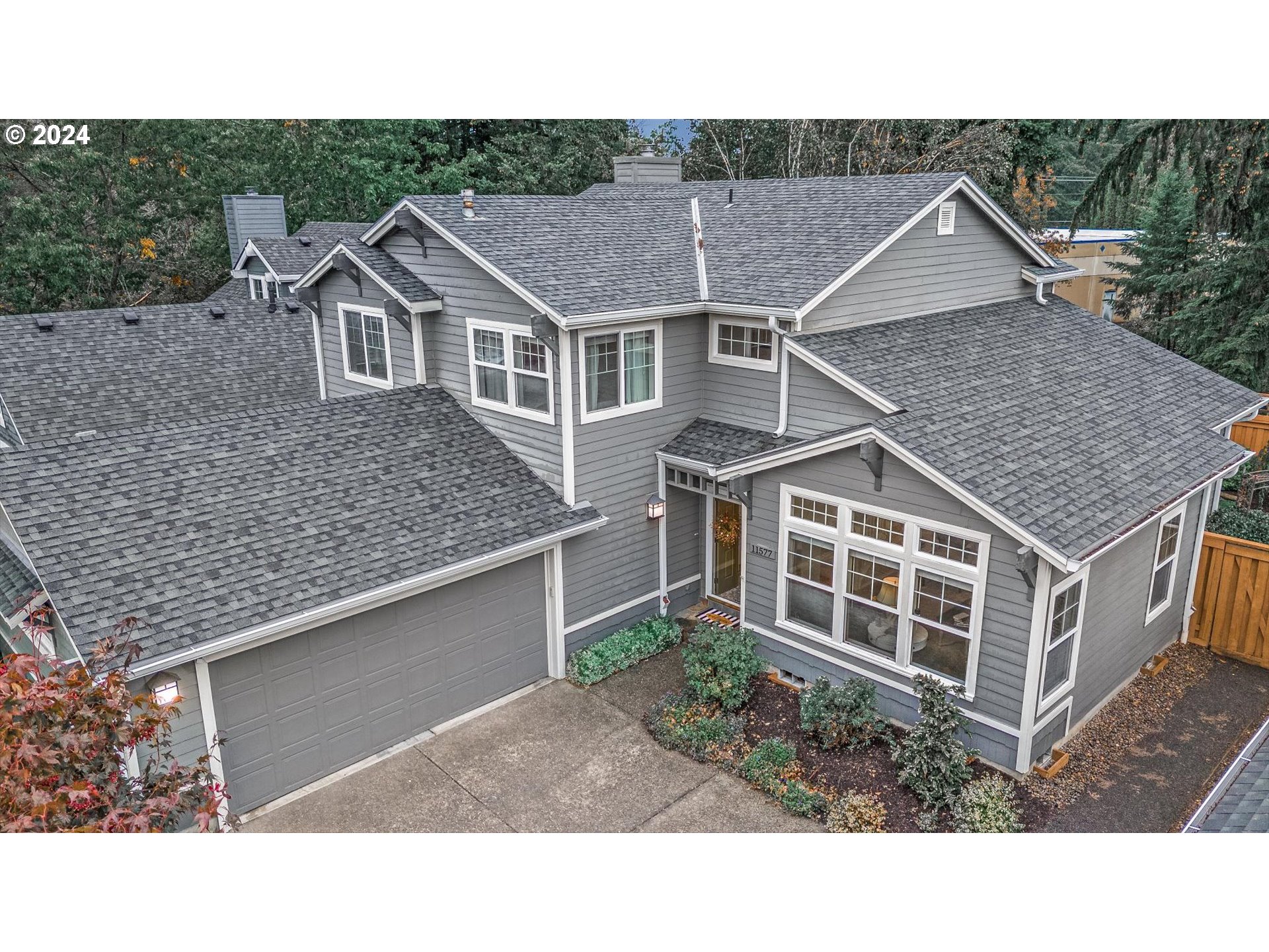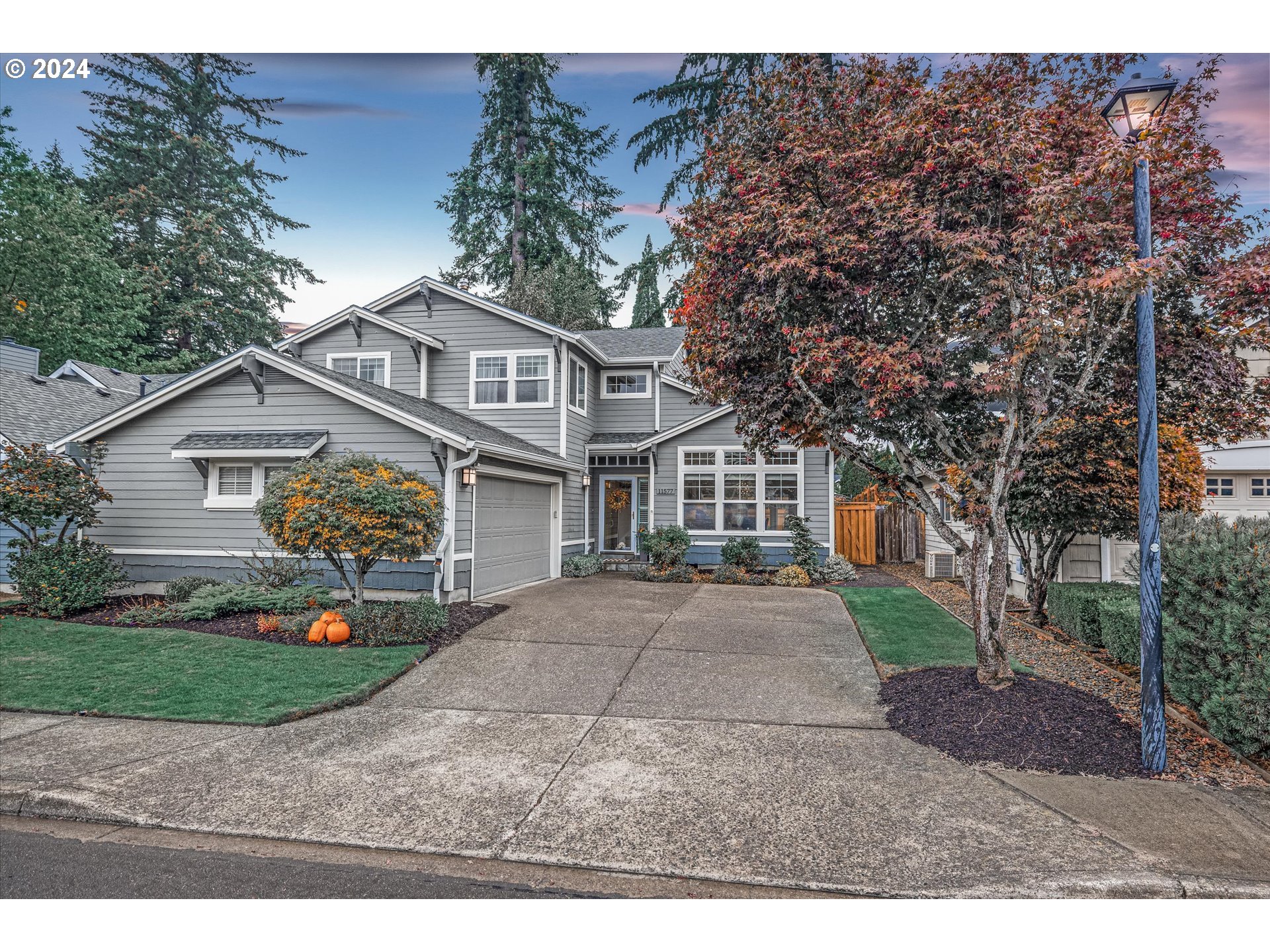 This stunning 3-bedroom, 3-bathroom home with a versatile office (potential 4th bedroom) offers a blend of elegance, comfort, and convenience. Located in a peaceful cul-de-sac surrounded by beautifully maintained homes, it exudes pride of ownership and curb appeal.Upon entering, you’re greeted by a spacious, light-filled living room with vaulted ceilings, leading seamlessly to a dining area with scenic backyard views. The updated kitchen is a true centerpiece, featuring quartzite countertops, stainless steel appliances, and Hickory hardwood floors that extend into the cozy family room with a gas fireplace. Large windows on both levels flood the home with natural light, creating a warm and welcoming atmosphere.The main level includes two open living areas, a full bath, and laundry room. Upstairs, the luxurious primary suite boasts vaulted