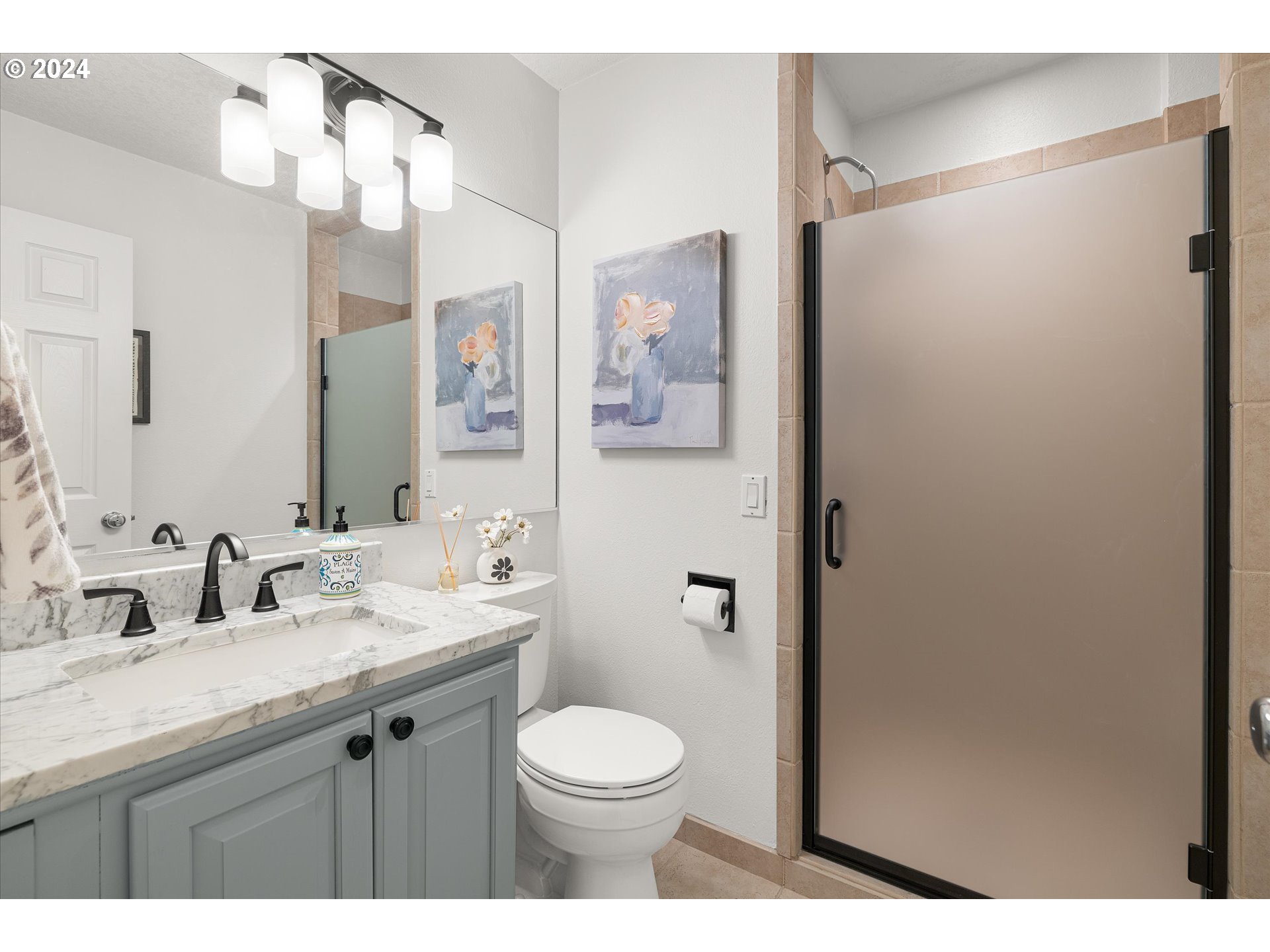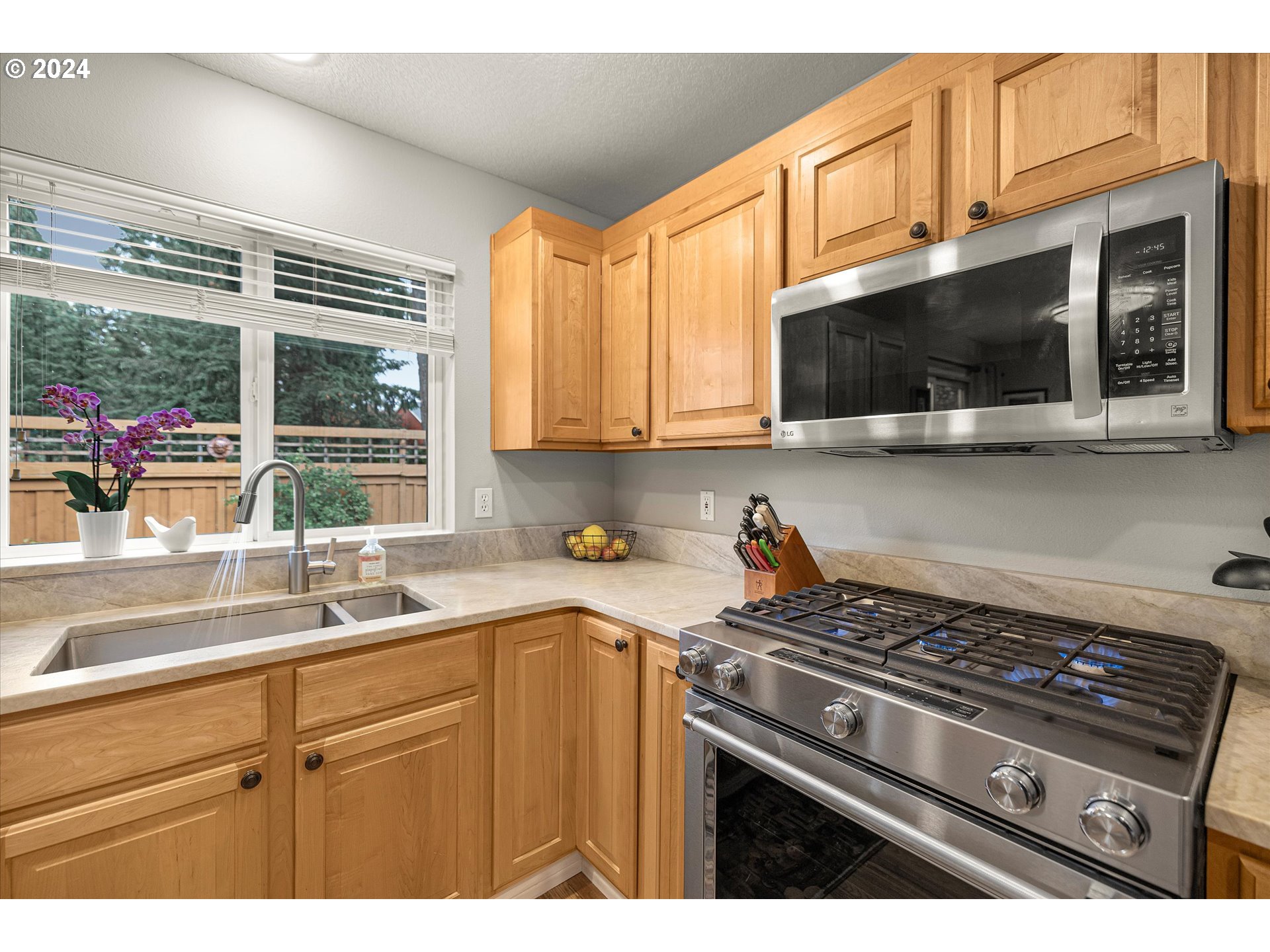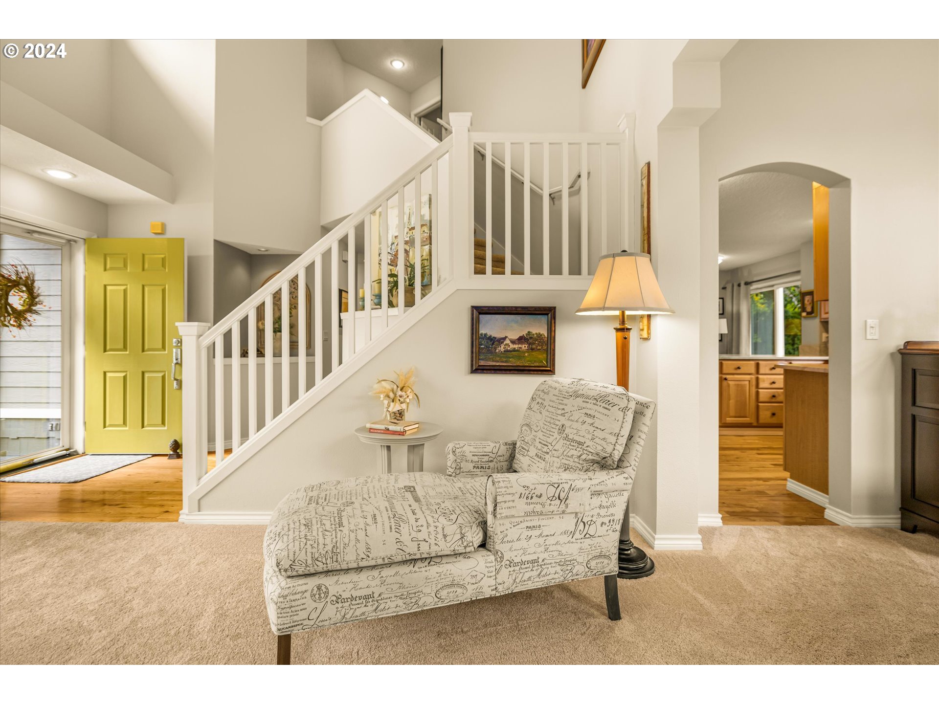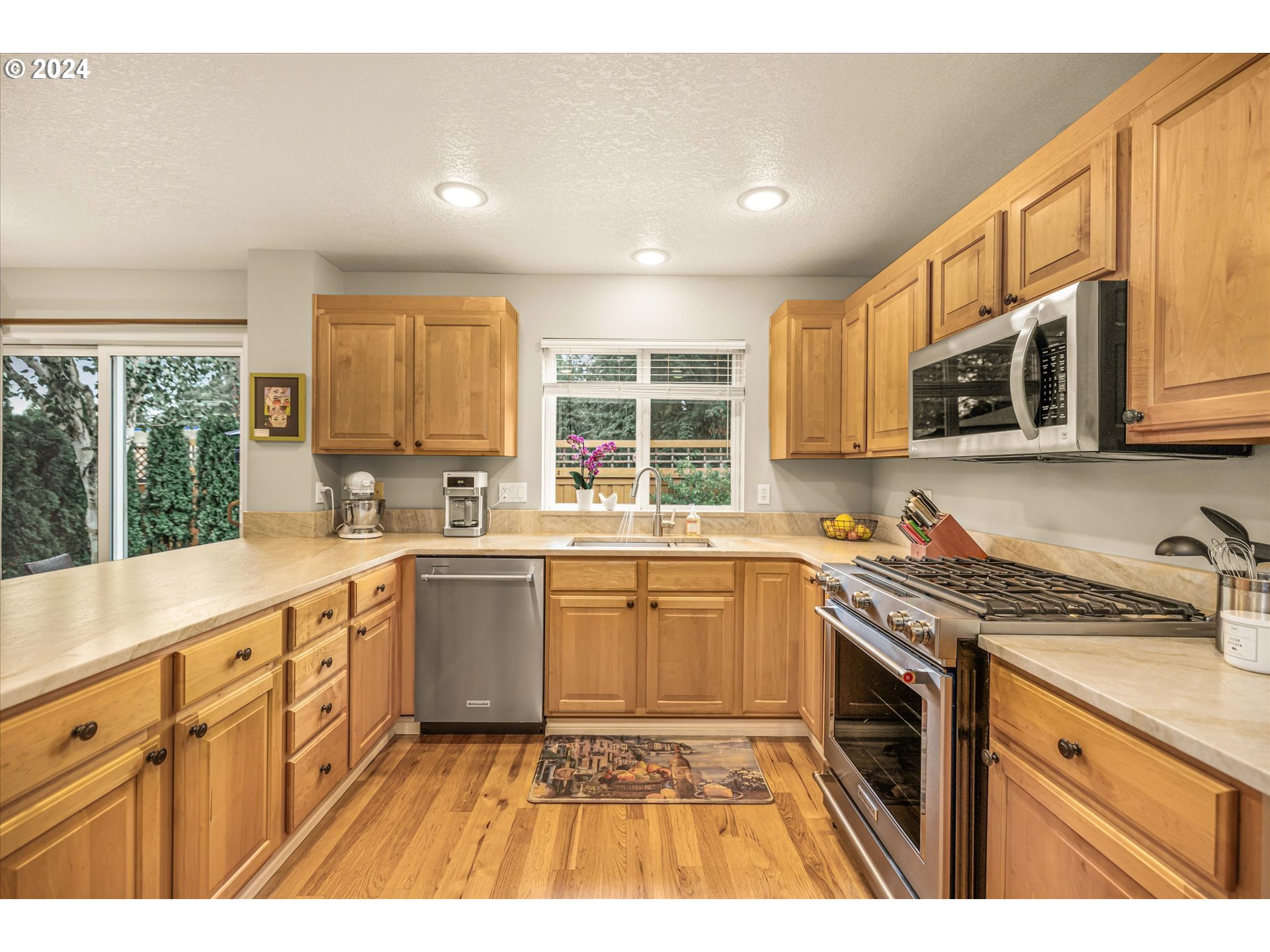 This stunning 3-bedroom, 3-bathroom home with a versatile office (potential 4th bedroom) offers a blend of elegance, comfort, and convenience. Located in a peaceful cul-de-sac surrounded by beautifully maintained homes, it exudes pride of ownership and curb appeal.Upon entering, you’re greeted by a spacious, light-filled living room with vaulted ceilings, leading seamlessly to a dining area with scenic backyard views. The updated kitchen is a true centerpiece, featuring quartzite countertops, stainless steel appliances, and Hickory hardwood floors that extend into the cozy family room with a gas fireplace. Large windows on both levels flood the home with natural light, creating a warm and welcoming atmosphere.The main level includes two open living areas, a full bath, and laundry room. Upstairs, the luxurious primary suite boasts vaulted