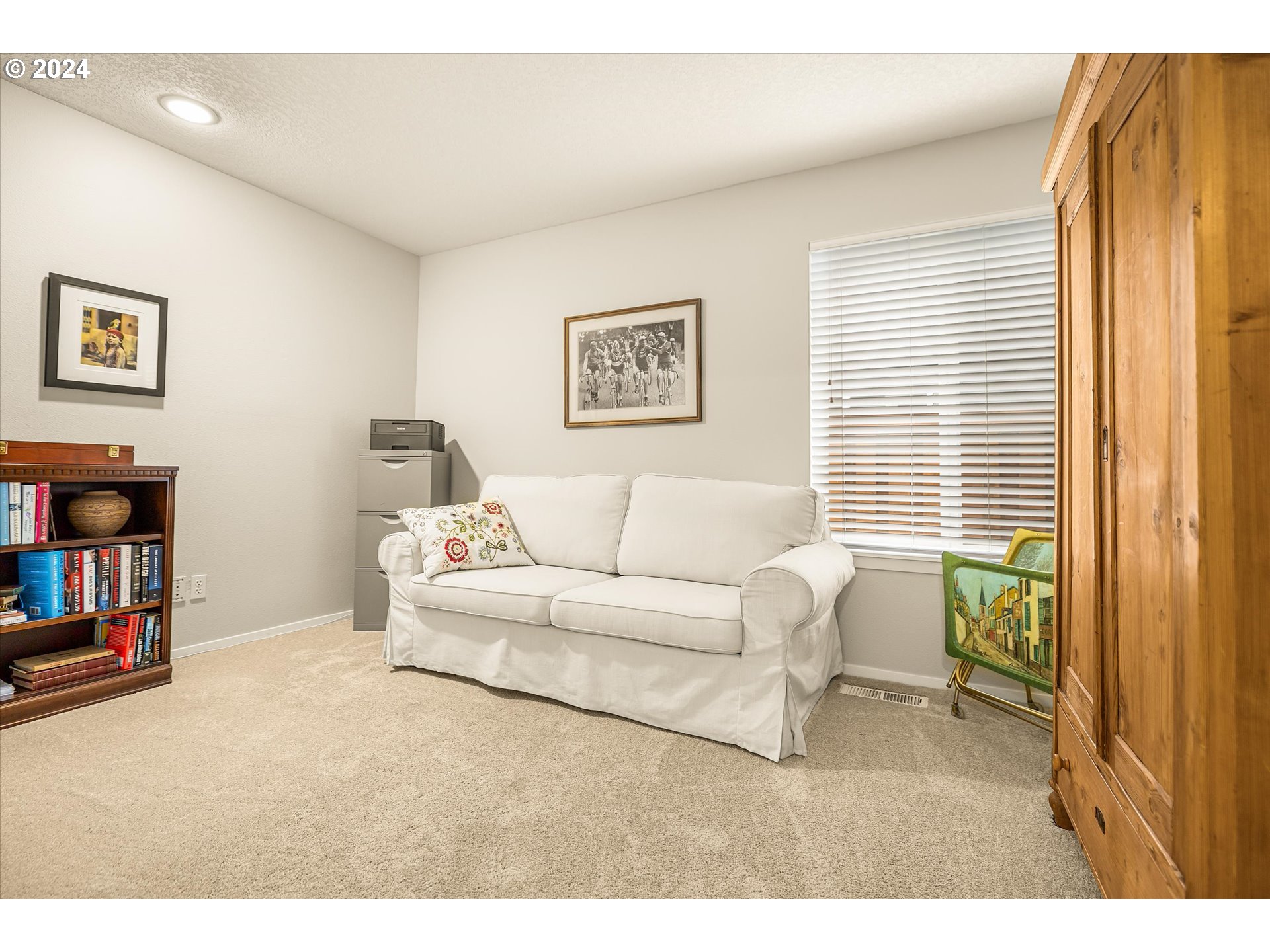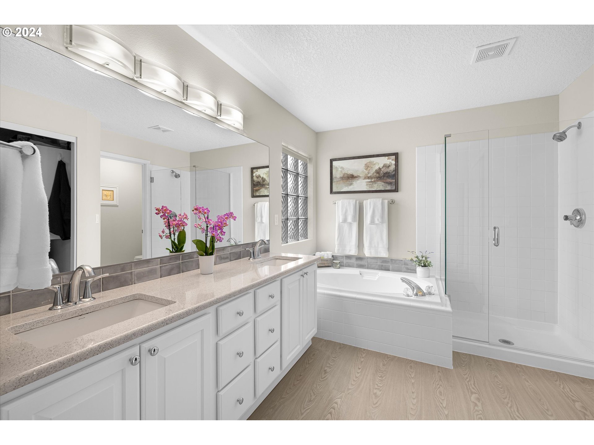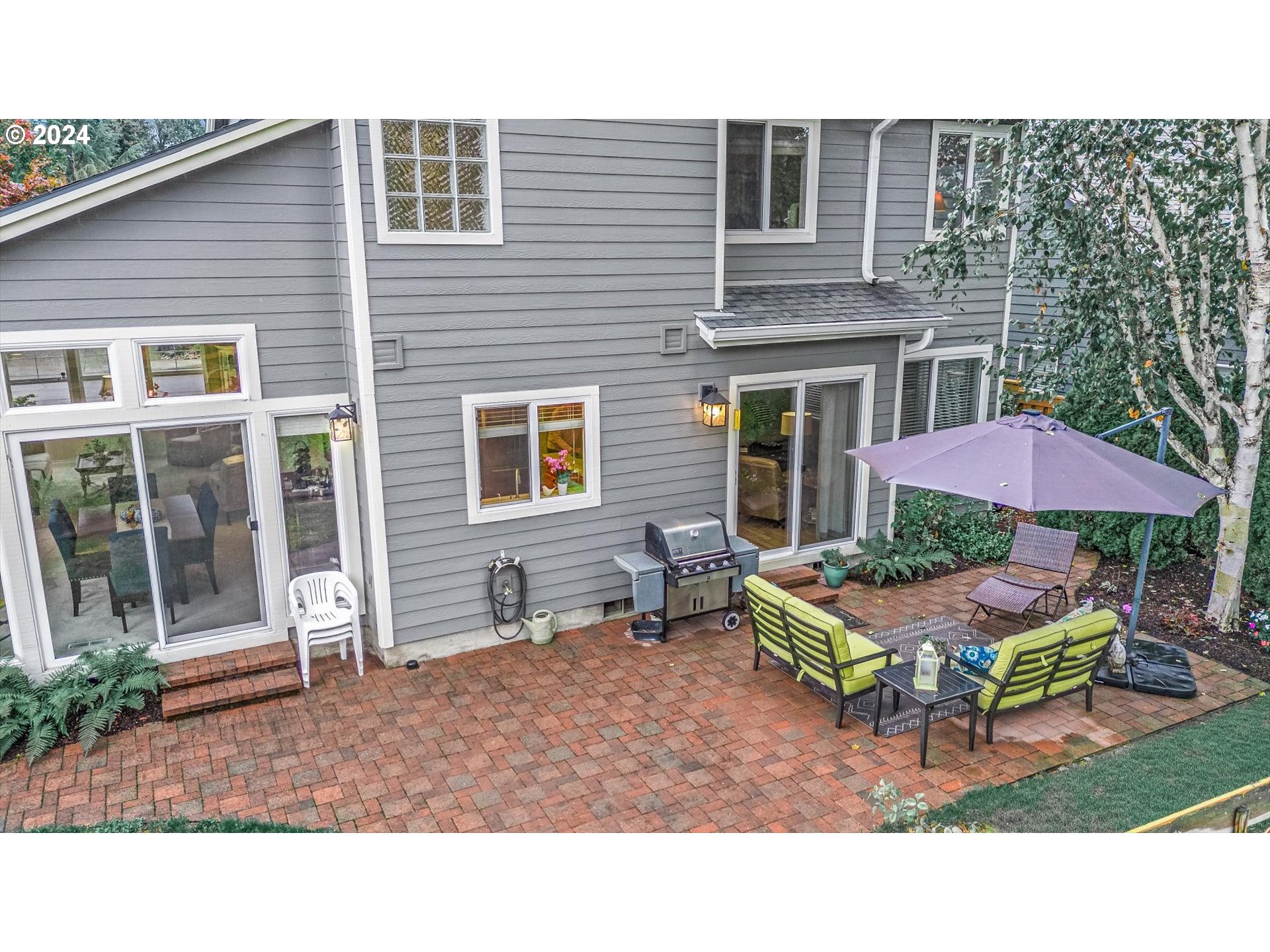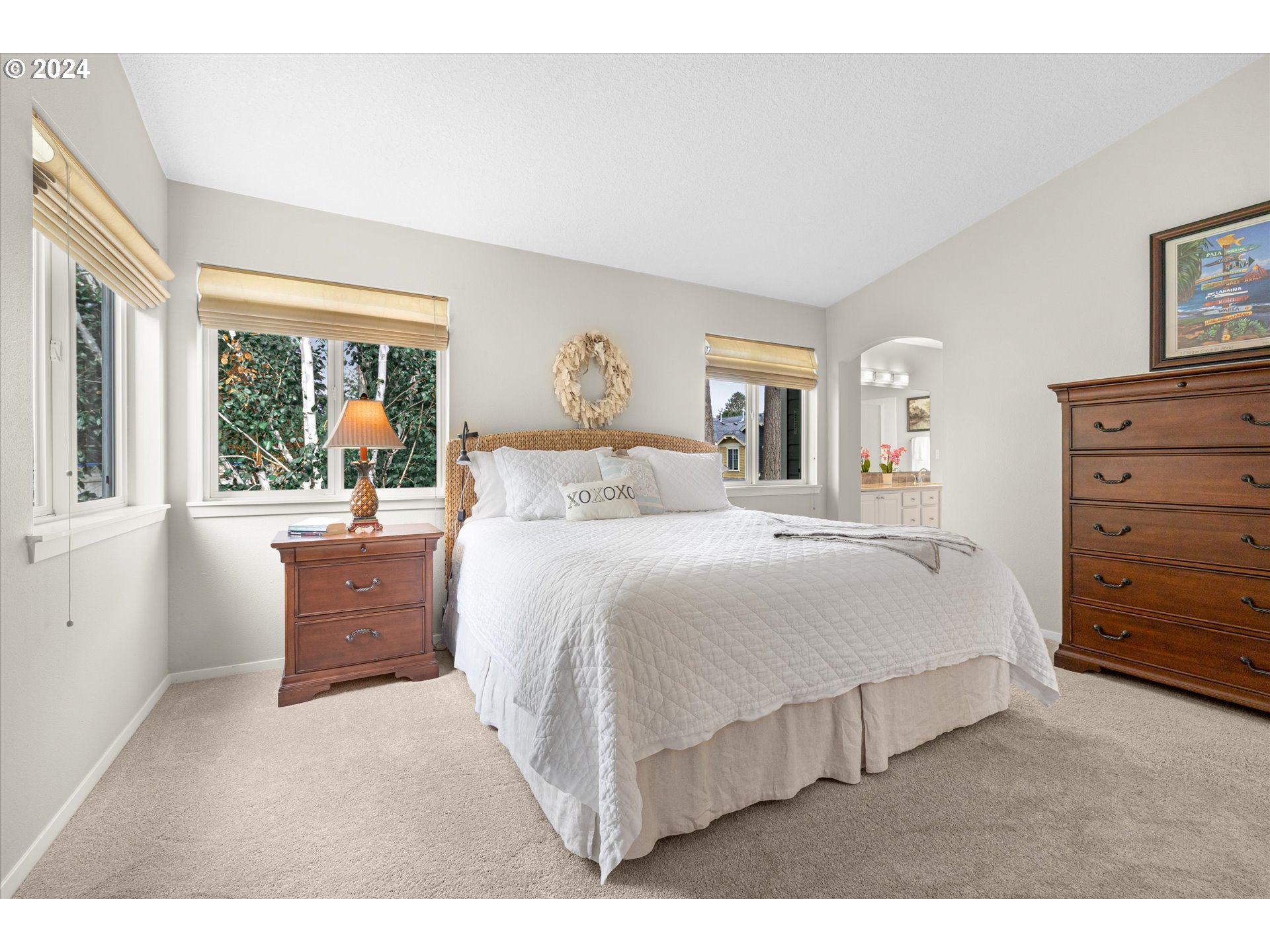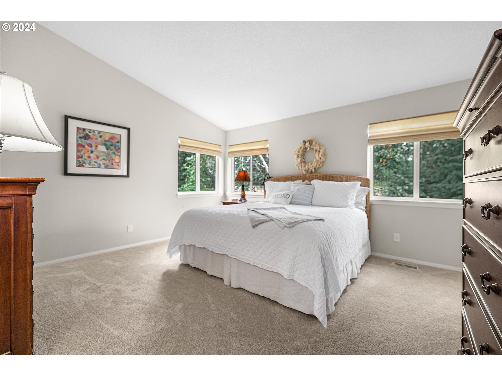 This stunning 3-bedroom, 3-bathroom home with a versatile office (potential 4th bedroom) offers a blend of elegance, comfort, and convenience. Located in a peaceful cul-de-sac surrounded by beautifully maintained homes, it exudes pride of ownership and curb appeal.Upon entering, you’re greeted by a spacious, light-filled living room with vaulted ceilings, leading seamlessly to a dining area with scenic backyard views. The updated kitchen is a true centerpiece, featuring quartzite countertops, stainless steel appliances, and Hickory hardwood floors that extend into the cozy family room with a gas fireplace. Large windows on both levels flood the home with natural light, creating a warm and welcoming atmosphere.The main level includes two open living areas, a full bath, and laundry room. Upstairs, the luxurious primary suite boasts vaulted