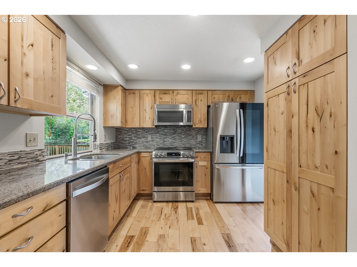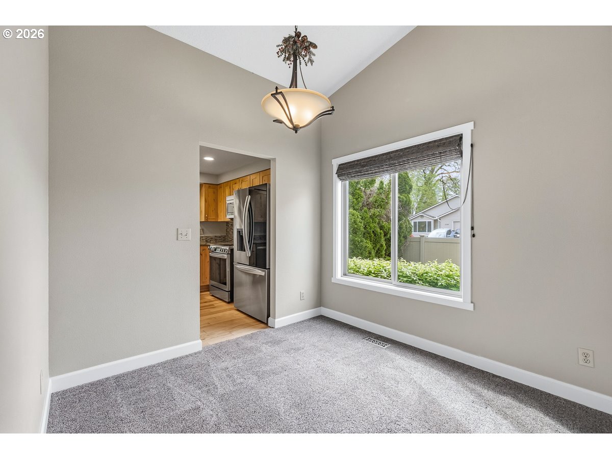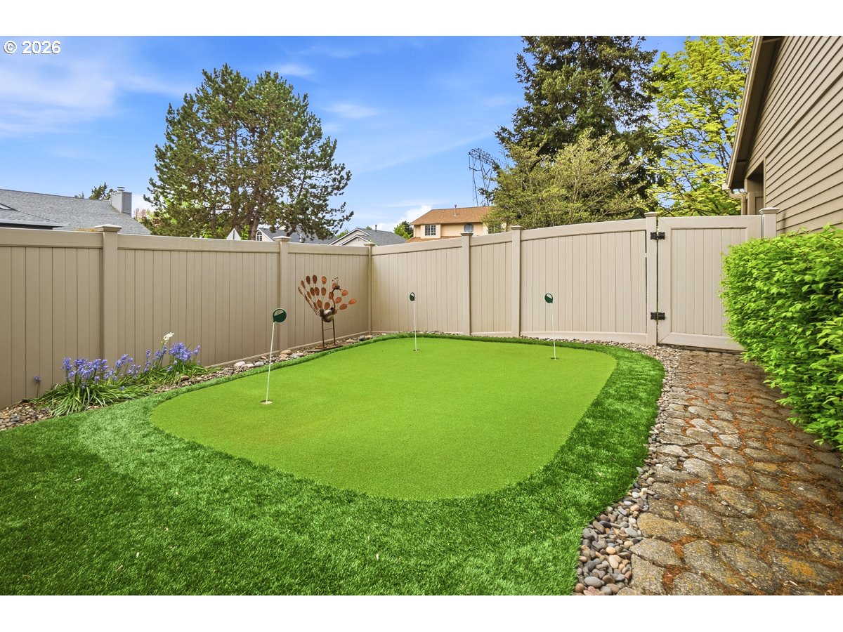 Beautiful one level home in a great Beaverton location. Home has been well-maintained and updated over the years by the original owners. Updated kitchen with knotty alder cabinets, quartz counters, and stainless appliances. Kitchen eating area with a large island and built-in bar great for entertaining. Vaulted living room with electric wall fireplace. Formal dining room. Primary bedroom with bathroom and ample closet space. Utility room with washer & dryer. Engineered hickory wood floors in kitchen and hallway. Tile entry. Vinyl windows. Attic storage above garage. Level fenced backyard with covered and open decks, artificial turf, golf putting green, dog run, and garden. RV/boat parking.