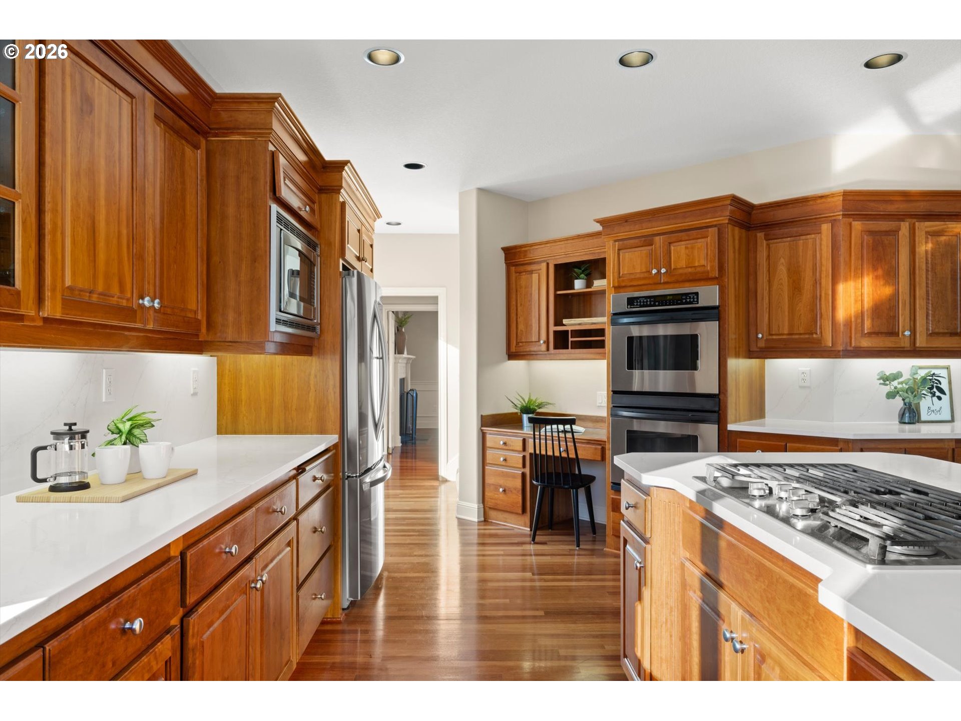 (503) 893-8874The main level welcomes you with an open entry and cherry hardwood floors throughout. A formal dining room with a fireplace provides an inviting space for entertaining or hosting dinner parties, while the office features custom built-ins ideal for work or study. The fully updated kitchen showcases new quartz countertops and backsplash and opens seamlessly to the surrounding living areas, with a convenient butler’s pantry just off the kitchen for added storage and prep space. Spacious great room with high ceilings, perfect for family or friends gathering, is paired with expansive windows that flood the home with natural light, highlighting the built-ins and fireplace that anchor the space. Upstairs, the primary suite provides a light-filled retreat with a spacious bathroom featuring a dual vanity, walk-in closet, and jacuzzi tub. Three additional bedrooms offer flexibility, including one with a Jack-and-Jill bathroom, and a generous bonus room completes the upper level, perfect for a media room, play space, or home gym. Outside, the patio and landscaped yard create a serene retreat, all just minutes from parks and major tech hubs like Intel and Nike.