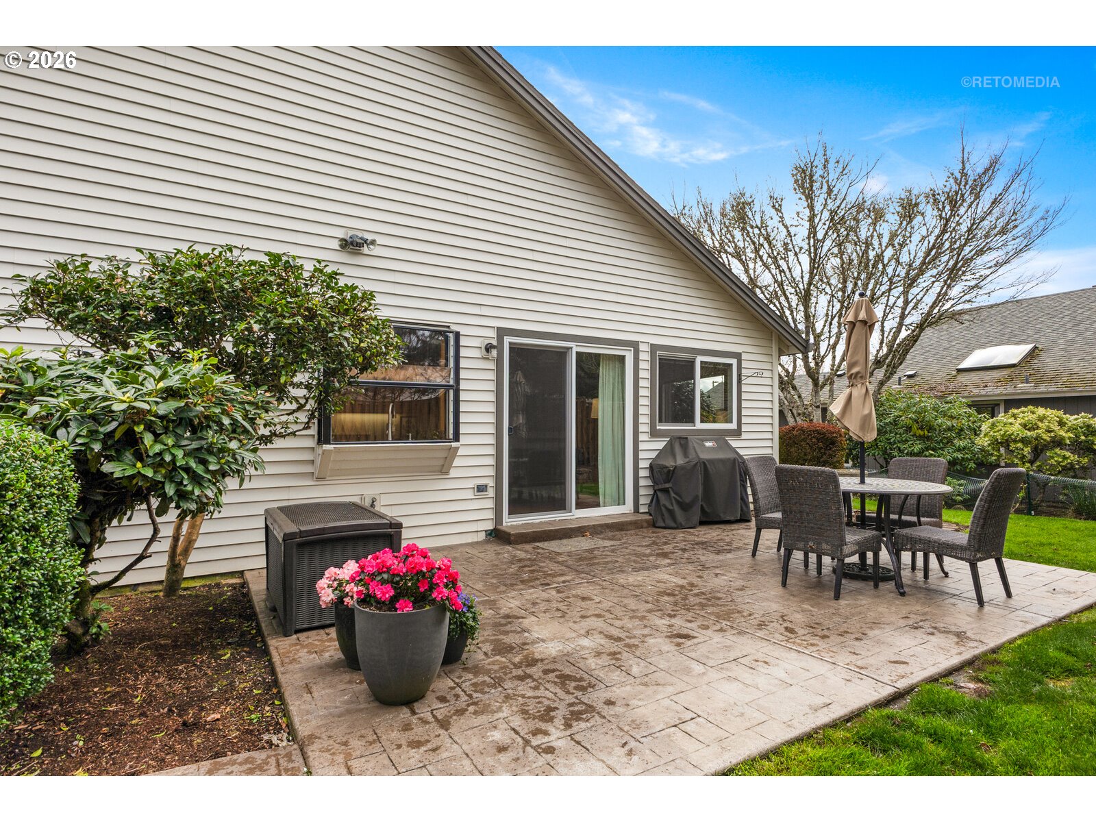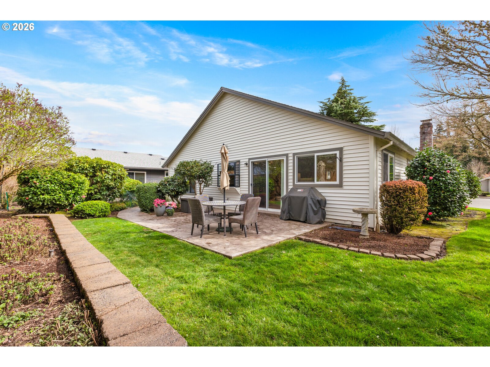 Serene Single-Level Living in a Prime Cul-de-Sac LocationDiscover the perfect blend of comfort and modern elegance in this beautifully maintained home, nestled within a premier 55+ active adult community. Located at the quiet end of a private cul-de-sac, this residence offers the peaceful lifestyle you’ve been searching for.Step inside to an inviting open floor plan that seamlessly connects your living spaces. The interior features an ideal mix of rich hardwood floors in the kitchen and family room and plush, cozy carpeting in the bedrooms and living room for ultimate comfort. Enjoy the convenience of a true single-level layout, designed for effortless flow and long-term comfort.The living extends outdoors to a beautifully landscaped backyard. Whether you're sipping your morning coffee or hosting a summer BBQ, the stamped concrete patio provides a durable and elegant space for entertaining. The yard offers just the right amount of green space to enjoy without the burden of heavy maintenance.