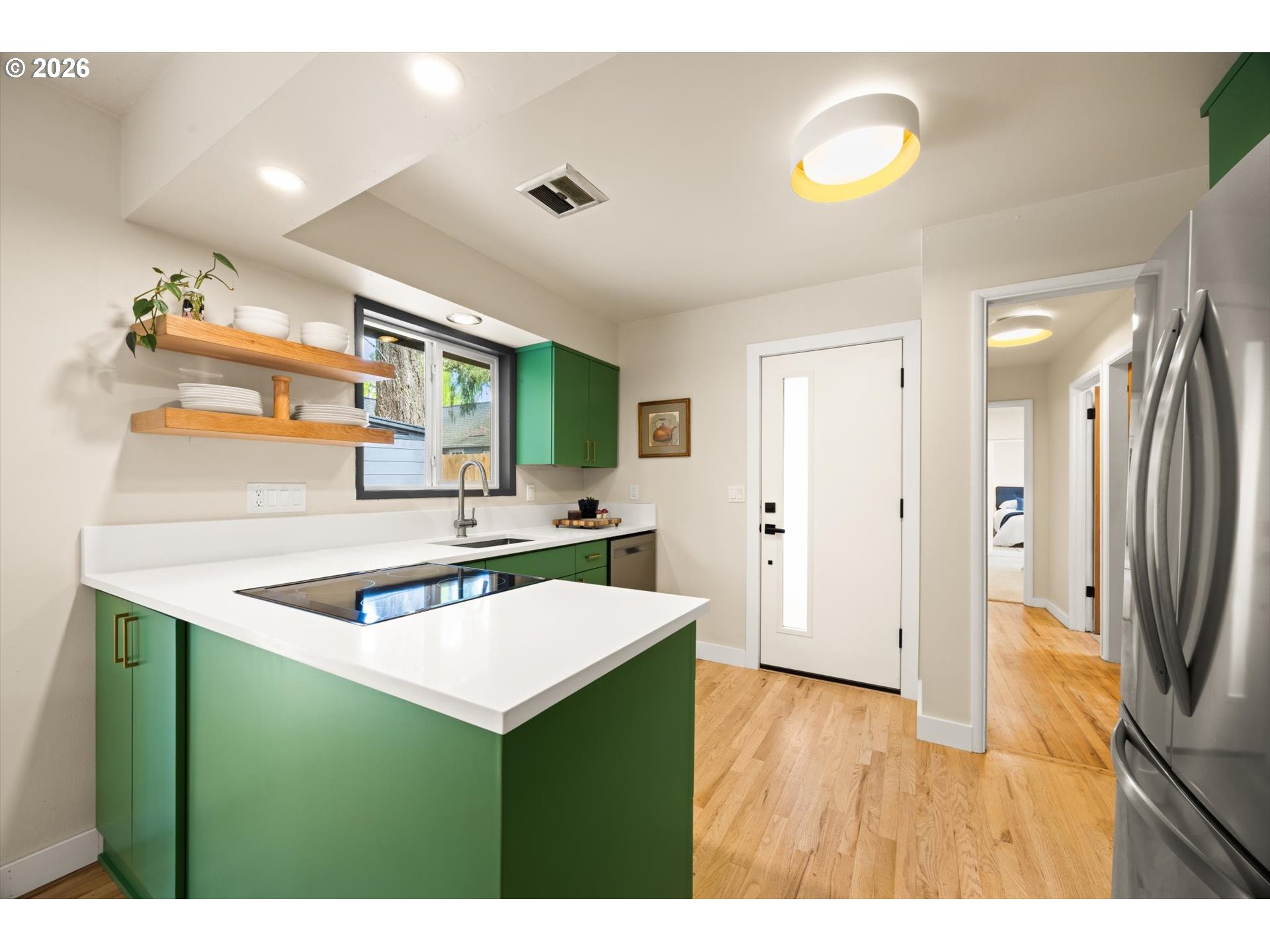 Mid-century one-level gem on a beautiful corner lot in the heart of Beaverton. Remodeled kitchen with quartz countertops, floating oak shelves, and a built-in bar. Sunny eating nook with slider to a private patio. Spacious living room with wood-burning fireplace and newly refinished hardwood floors. Spacious primary with double closet. Updated bathroom with custom tile flooring and a walk-in shower. Fully fenced backyard with patio and storage shed. Carport with storage closets. Lots of updates including new PEX plumbing, interior & exterior paint, hardwood floors,light fixtures & more. Incredible location—walk to the farmers market, library, and restaurants!
