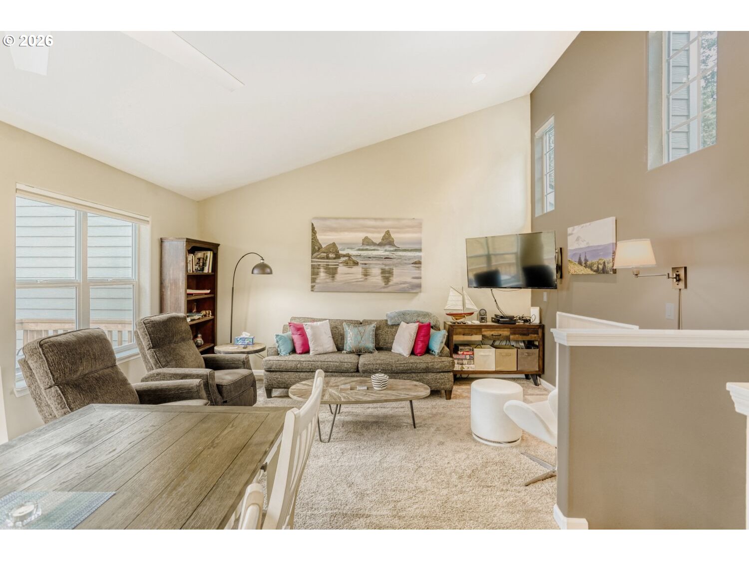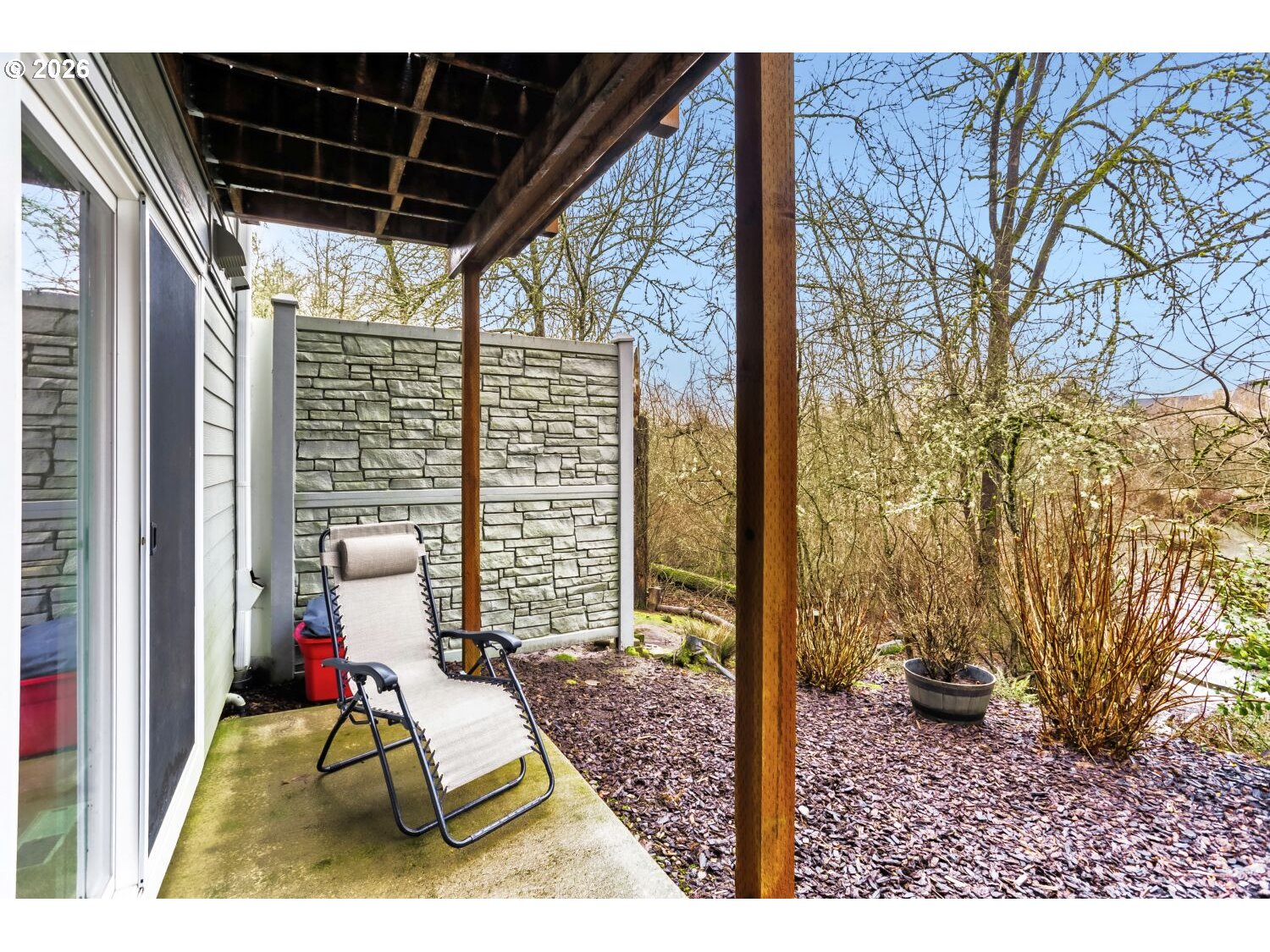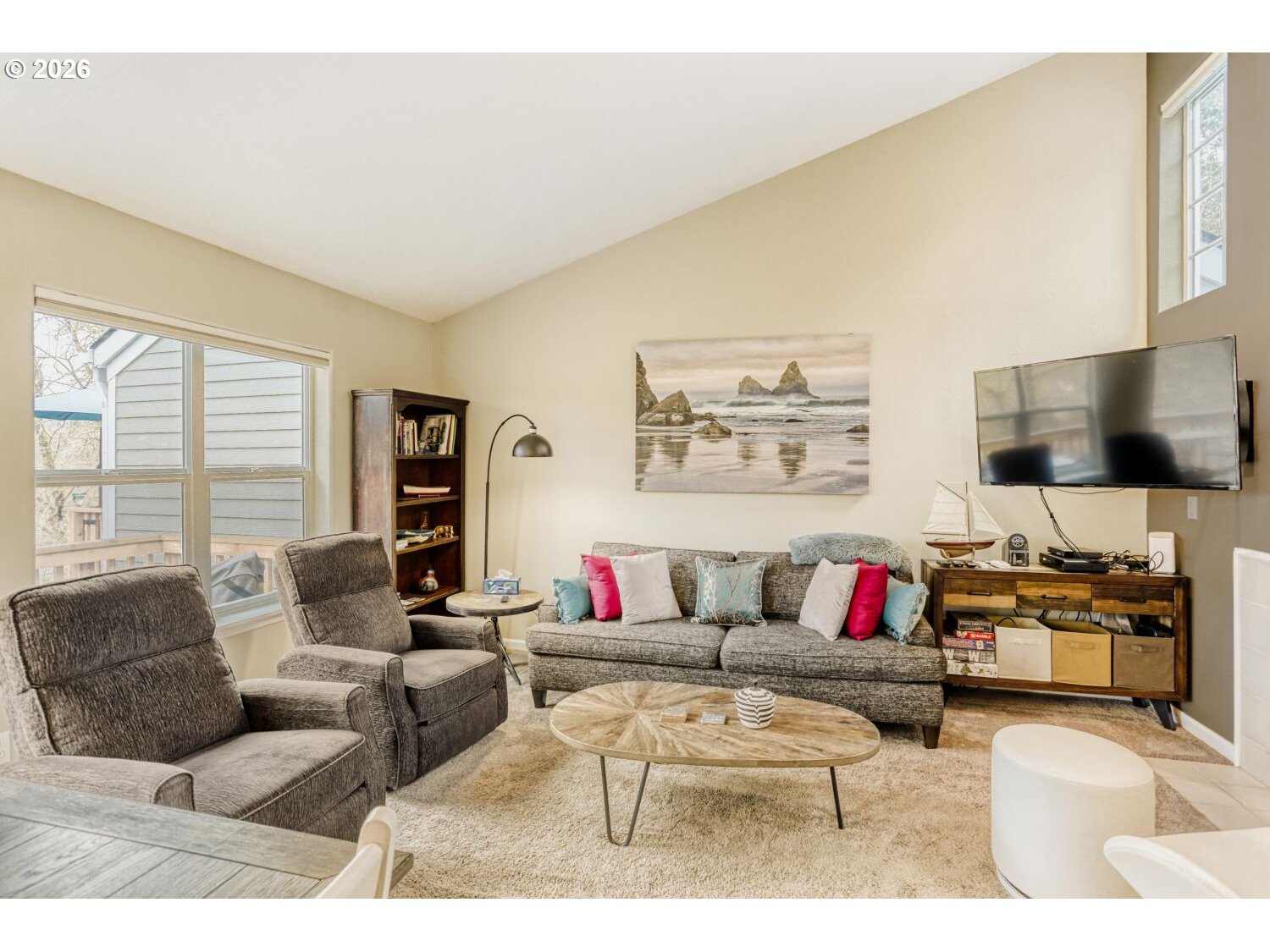 Private, light-filled townhome backing to serene wetlands near Summerlake Park. Soaring vaulted ceilings and a dramatic wall of north-facing windows flood the great room with natural light, creating an open and airy feel that seamlessly connects indoor living with the peaceful outdoor setting. The open-concept living and dining areas are anchored by a cozy fireplace and flow effortlessly to a sliding door leading to an expansive 30-foot patio and level yard—ideal for relaxing, entertaining, or simply enjoying tranquil water and tree views. The natural setting provides a rare sense of retreat while remaining close to everyday conveniences. Recent updates enhance both comfort and peace of mind, including an energy-efficient mini-split heat pump for heating and air conditioning, whole-home air scrubber system for improved air quality, and an induction cooktop. Exterior upgrades completed in 2021 include new windows, doors, roof, and decking. The crawlspace sump pump based system was redone in 2023 for enhanced moisture control. Quietly positioned yet conveniently located near parks, walking paths, shopping, and amenities, this move-in ready townhome offers the perfect blend of low-maintenance living, modern efficiency, and nature-inspired tranquility.