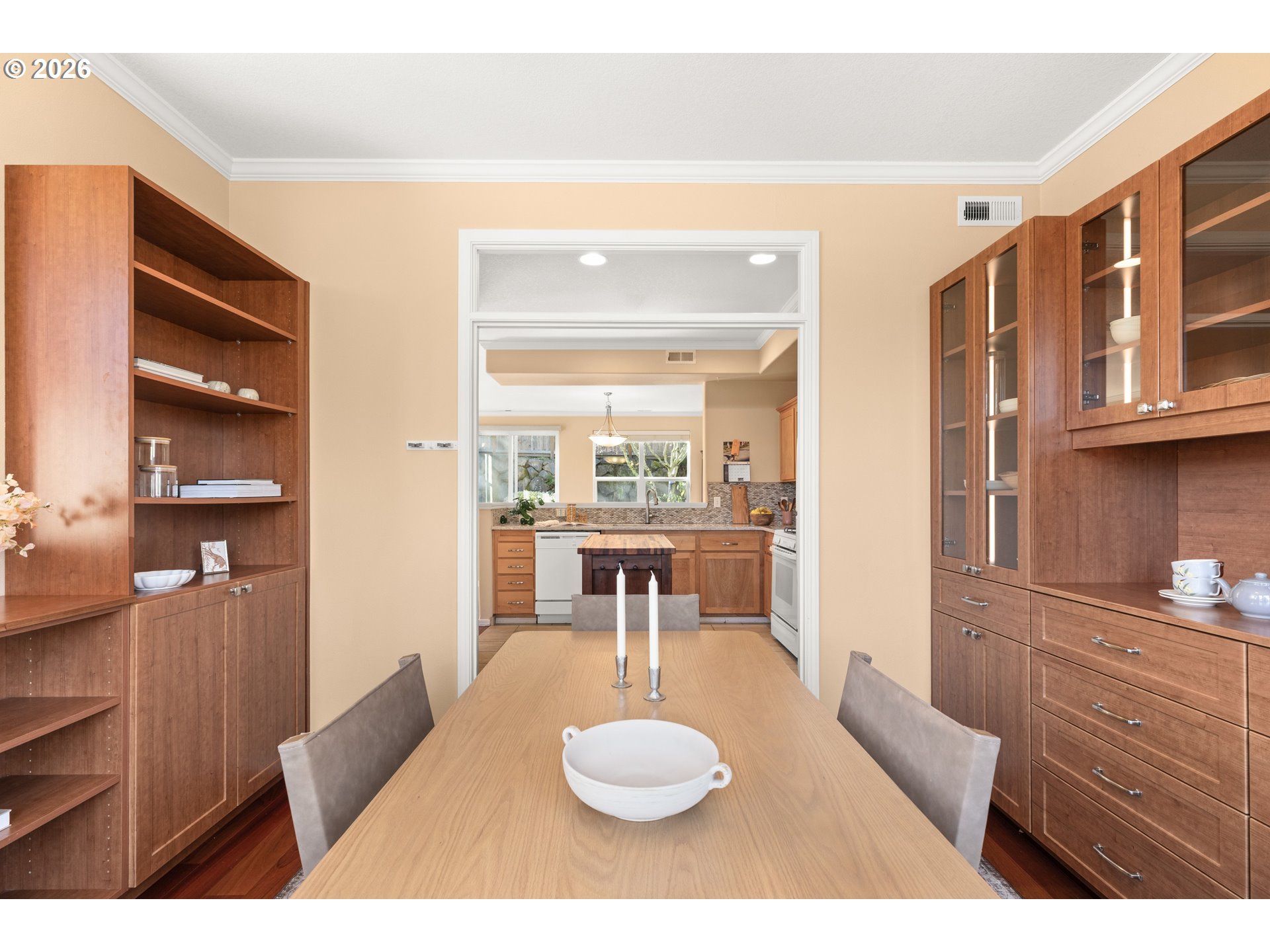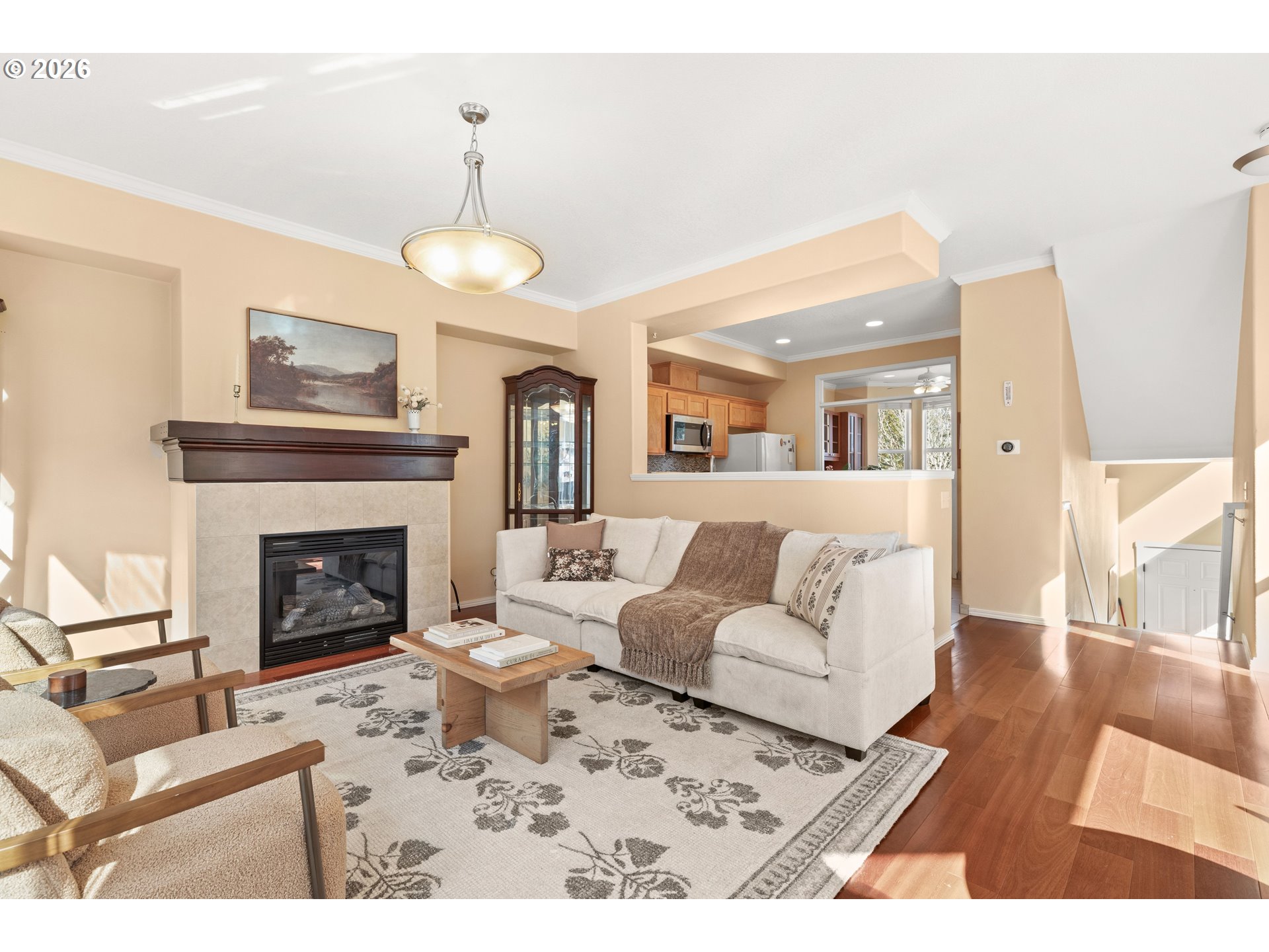 Welcome to the townhome of your dreams. Looking for a fenced yard, garage, driveway, natural light, spacious living areas, and plenty of storage? This three-story home has it all. Step into the welcoming entry and head upstairs. The living room features wood floors, high ceilings, gas fireplace, breakfast nook, and direct access to the backyard. Expansive windows throughout this space create a seamless indoor-to-outdoor feel. The open kitchen offers flexibility with a portable island and thoughtfully designed built-in pantry shelving. Just beyond, a formal dining room with gorgeous built-ins surrounding bay windows. Upstairs, find two bedrooms and two full bathrooms. The laundry area is discreetly tucked behind doors on the stairway landing, making it accessible from both bedrooms. Each bedroom features spacious walk-in closets and abundant natural light, with an additional hallway closet for linens and essentials. Downstairs, an oversized room offers incredible flexibility, complete with large closets and a convenient half bath. With additional storage under the stairs and direct access to the garage, this level goes far beyond a typical downstairs. Large windows keep the space light and inviting, making it usable as a bedroom, bonus area, office, media room, or all of the above. Outside, the fully fenced yard is a clean, private space ready to be enjoyed however you choose. As a corner unit, you will appreciate the added sense of privacy. With Washington Square, Bridgeport Village, and Progress Ridge nearby, everyday essentials, shopping, and major commuting routes are all within reach. Nearby green spaces and trails offer a lifestyle that blends comfort, convenience, and natural surroundings just minutes from home.