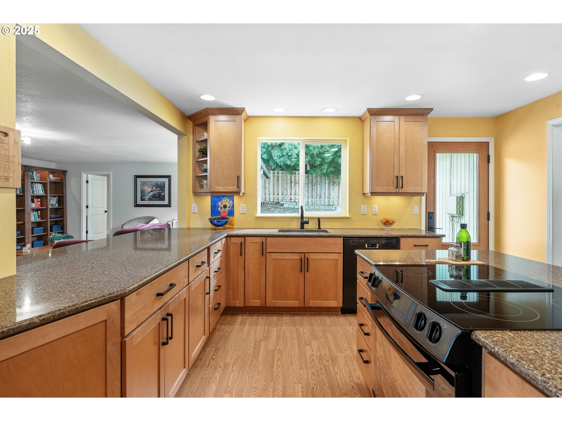 This one-level ranch in Beaverton offers four bedrooms, two bathrooms, and a functional layout designed for comfort and flexibility. The living room off the entry features a cozy fireplace, while the kitchen provides ample cabinet space, an island, and a convenient pass-through to the spacious family room. A dining area sits just off the kitchen, perfect for everyday meals or entertaining. The large family room opens to a back deck overlooking the fully fenced yard, complete with a storage shed that's been set up as a kids’ fort/playhouse. Three bedrooms are located on one side of the home, including the primary suite with an en suite bath, while a fourth bedroom off the family room is ideal for a home office or guest quarters. Additional features include a covered front entry, two-car attached garage, and a laundry room off the kitchen. With its practical layout and inviting spaces, this home is perfect for modern living in a great Beaverton location.