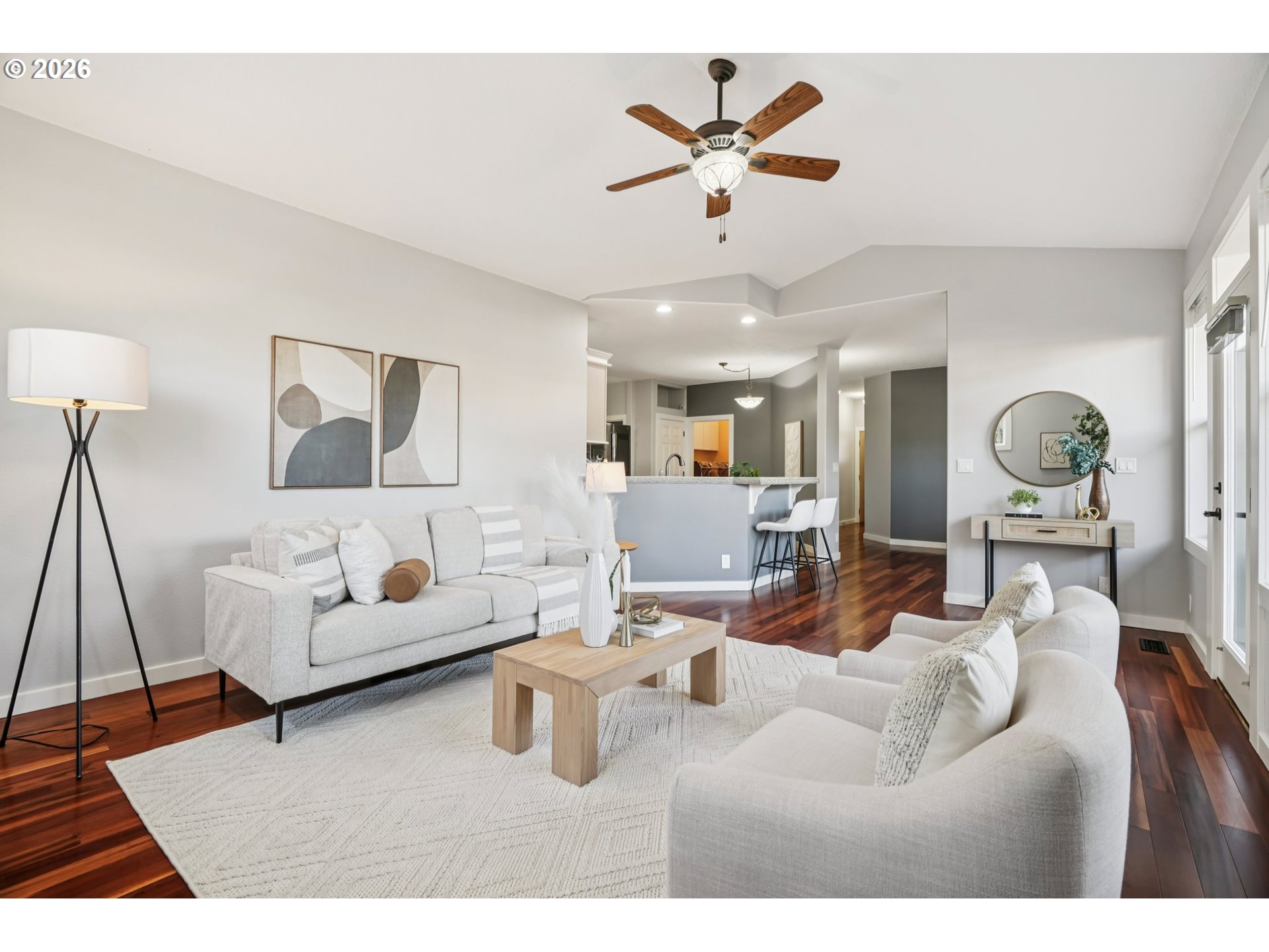 Open House Sunday 1-3! Gorgeous one-level home on a corner lot offering a bright, open floor plan designed for effortless living and entertaining. Vaulted ceilings and abundant natural light create an inviting atmosphere, anchored by a cozy gas-burning fireplace in the living room. The kitchen opens seamlessly to the living area and features stainless steel gas appliances and a convenient breakfast bar—perfect for casual meals or gathering with guests—while a formal dining area provides additional space for hosting. Step outside to a stunning, terraced backyard designed for both beauty and tranquility. Relax to the soothing sounds of the water feature or entertain on the new deck in this thoughtfully landscaped outdoor oasis. With multiple levels of usable space, the private backyard is ideal for gardening, dining, or simply unwinding. Inside, hardwood floors, ceiling fans, and quality finishes add warmth and comfort, while the two-car garage offers ample storage. Major system upgrades have already been completed, including a new roof (2020), new AC and furnace (2024), deck replacement (2024), fence replacement (2022), and crawl space insulation with vapor barrier (2022), providing peace of mind for years to come. Situated in a serene neighborhood conveniently located minutes from Tigard's shopping, parks, with easy access to the highway. A rare opportunity to enjoy one-level living with an exceptional backyard. Come see it for yourself!!