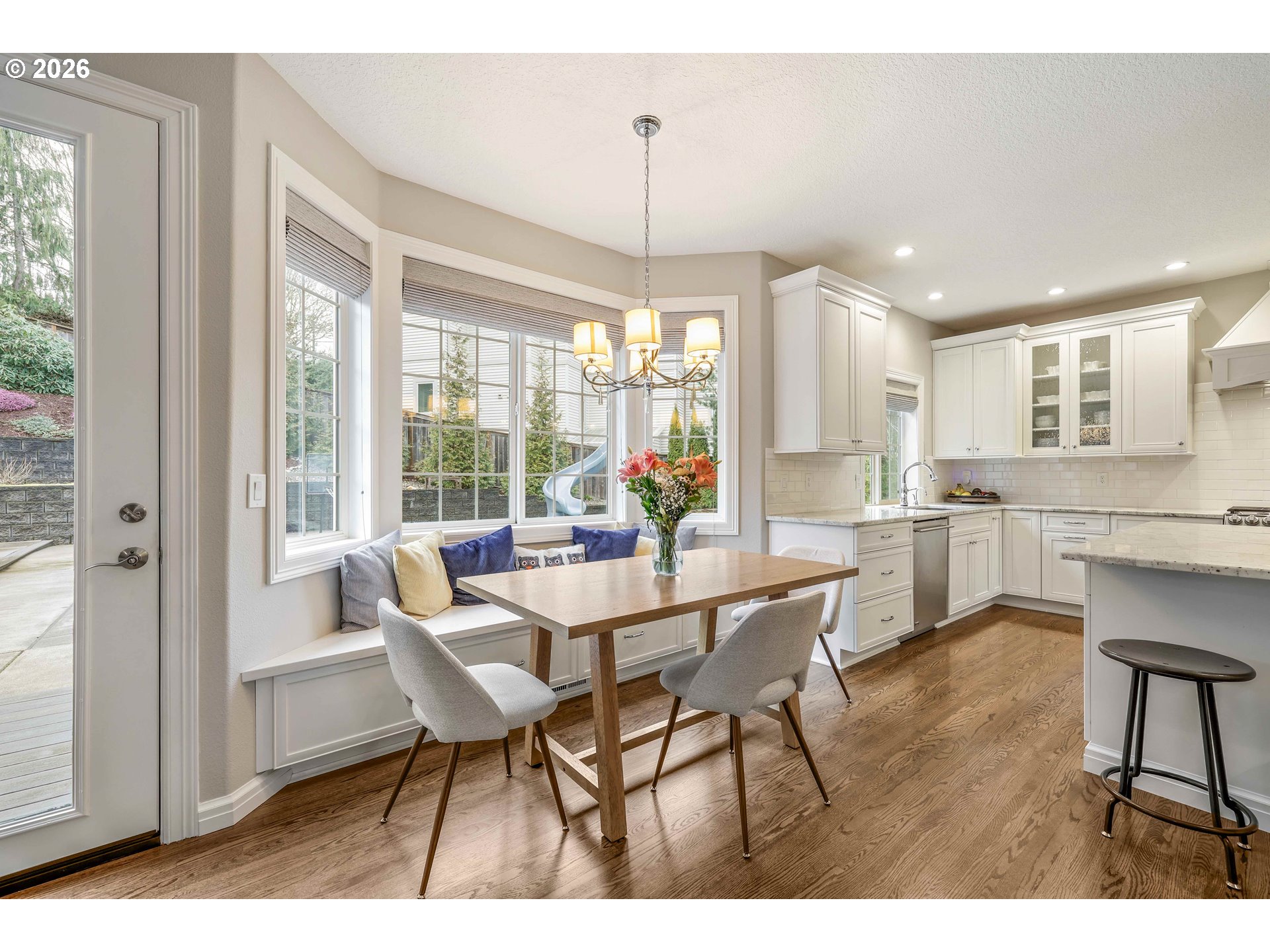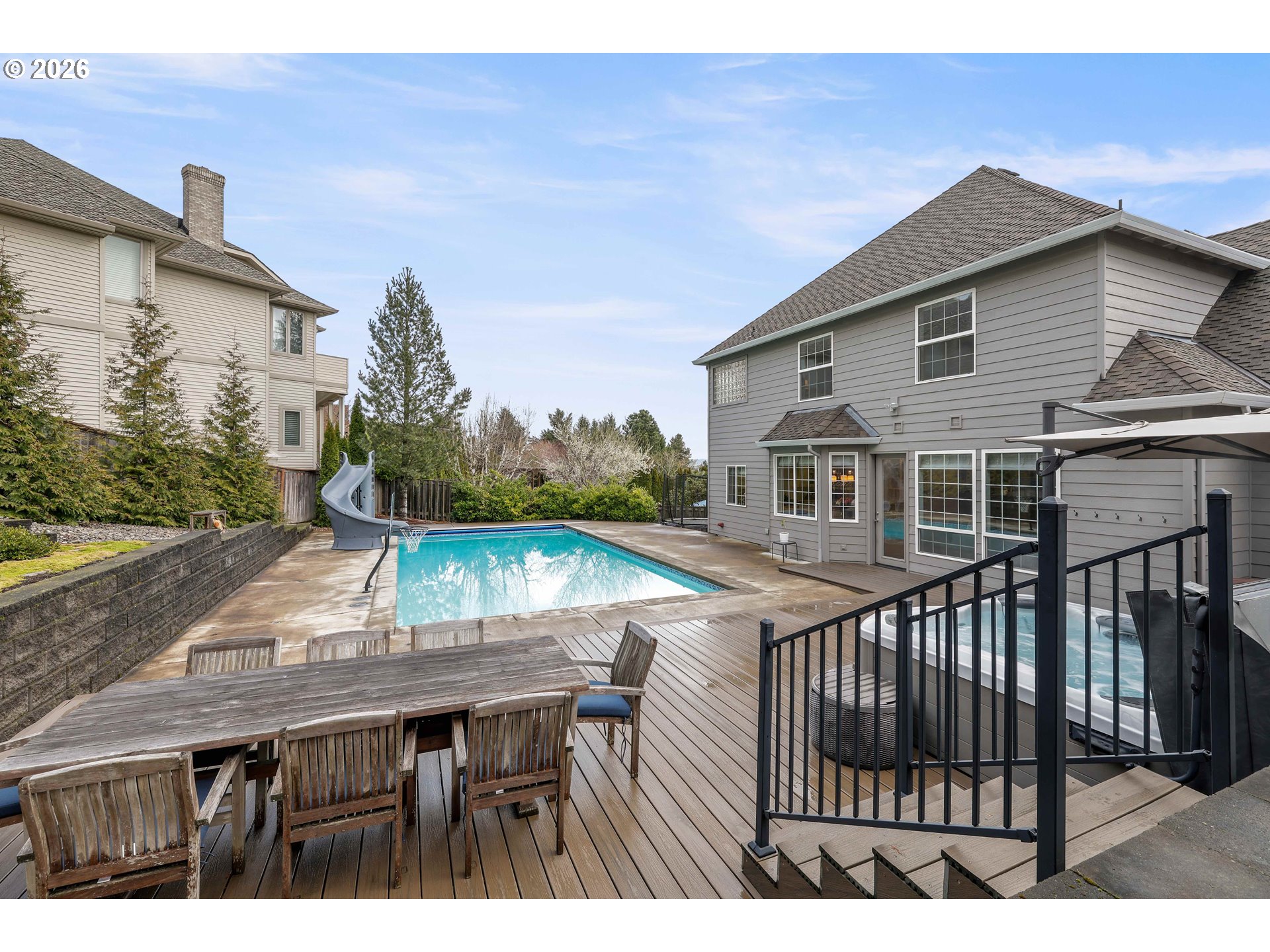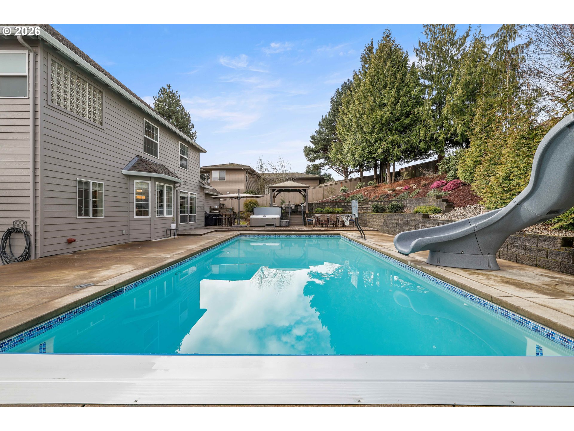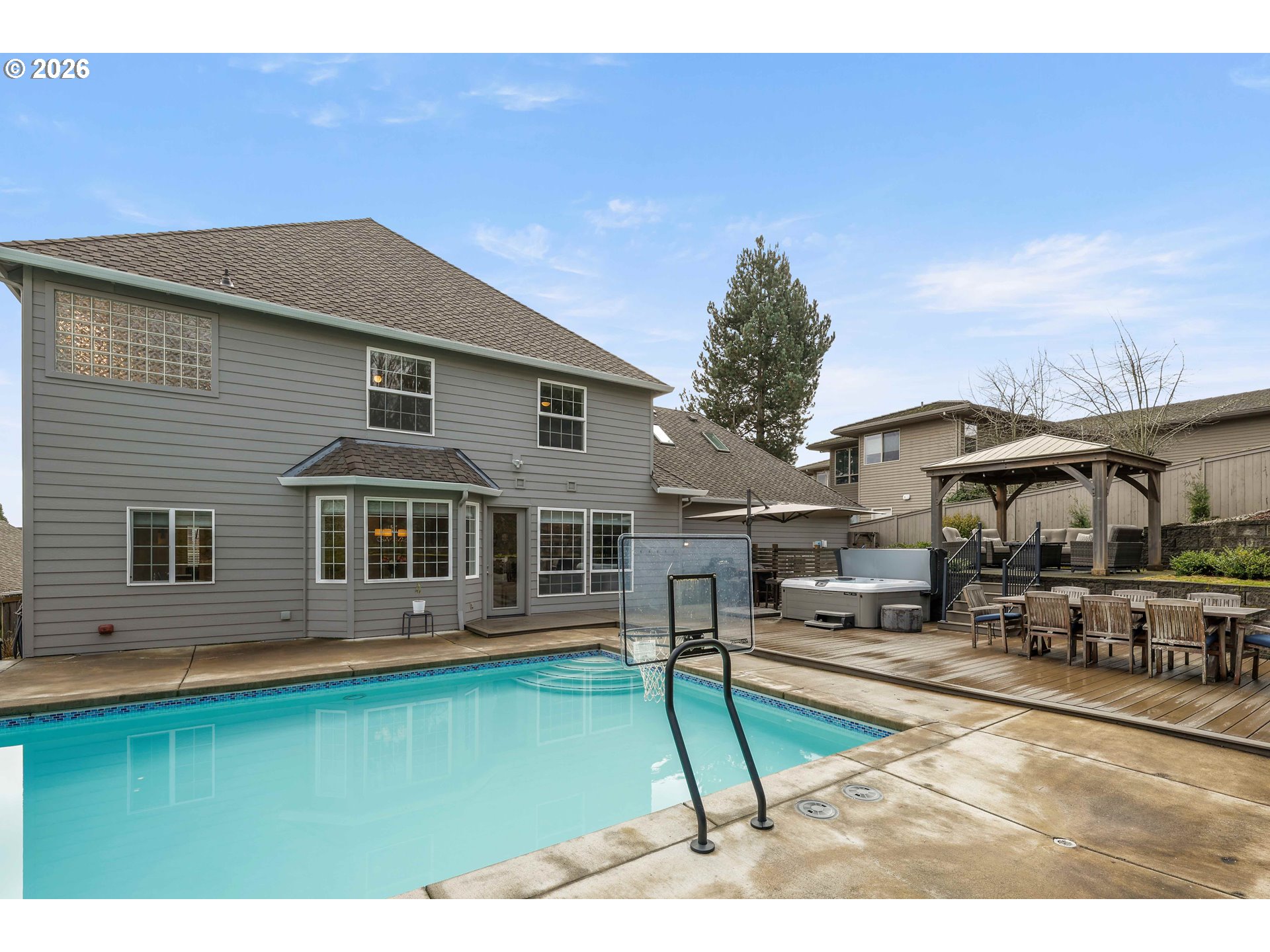 Stunning Hillshire Estates home offering over 3,000 square feet with 4 bedrooms and 2.5 baths in a beautiful setting with mountain views. This beautifully updated home features high ceilings and modern upgrades throughout, along with a thoughtfully designed floor plan perfect for everyday living and entertaining. The main level includes a den/office with French doors and built-ins, a welcoming living room with gas fireplace, formal dining room, and a spacious family room with gas fireplace and custom built-ins. The gourmet kitchen is ideal for gathering, featuring granite, an eat bar, built-in bench nook, ample counter space, and easy access to the laundry room.Upstairs you’ll find all four bedrooms along with an expansive bonus room. The oversized primary suite captures mountain views and includes a walk-in closet with organizer, dual sinks, a walk-in shower, and a jetted soaking tub.Step outside to a fully fenced, beautifully landscaped flat backyard designed for entertaining and relaxation. Enjoy the large deck and patio spaces, gazebo for covered outdoor gatherings, hot tub, and an impressive 18' x 36' in-ground pool features a walk-on automatic cover for added safety. The oversized 3-car garage offers abundant storage, a workbench, and space for a boat. This exceptional home combines space, comfort, and resort-style outdoor living in a highly desirable neighborhood.