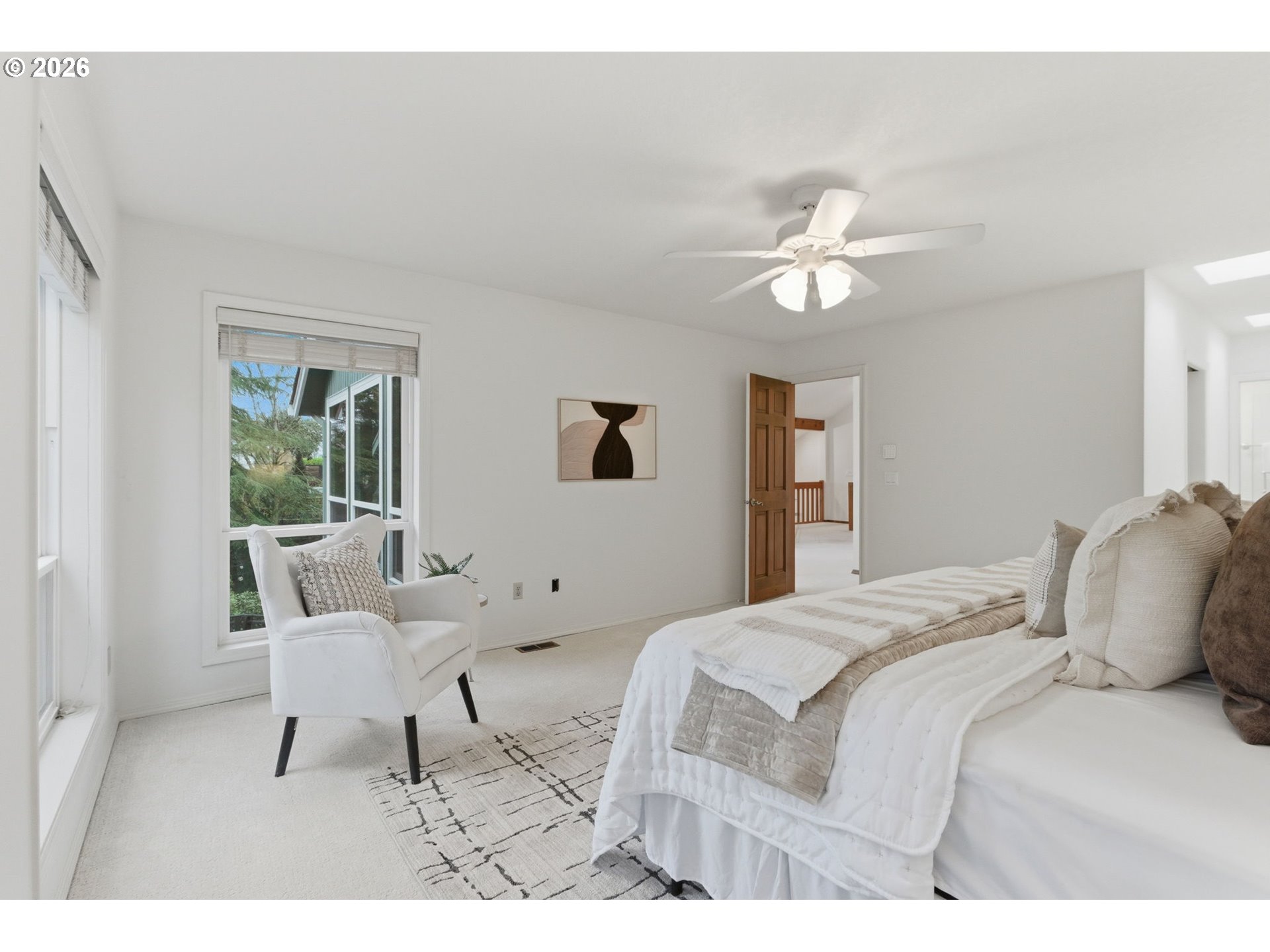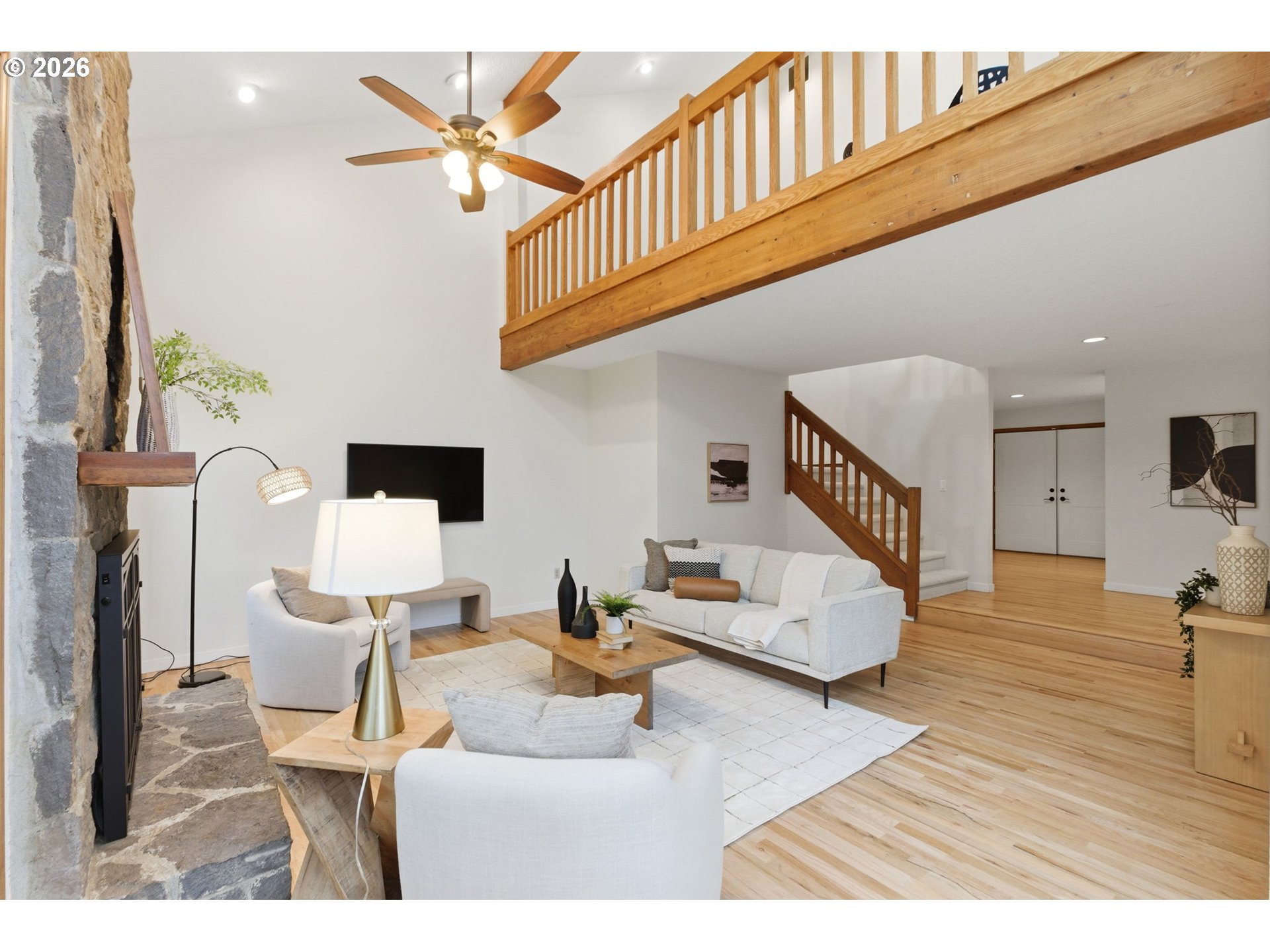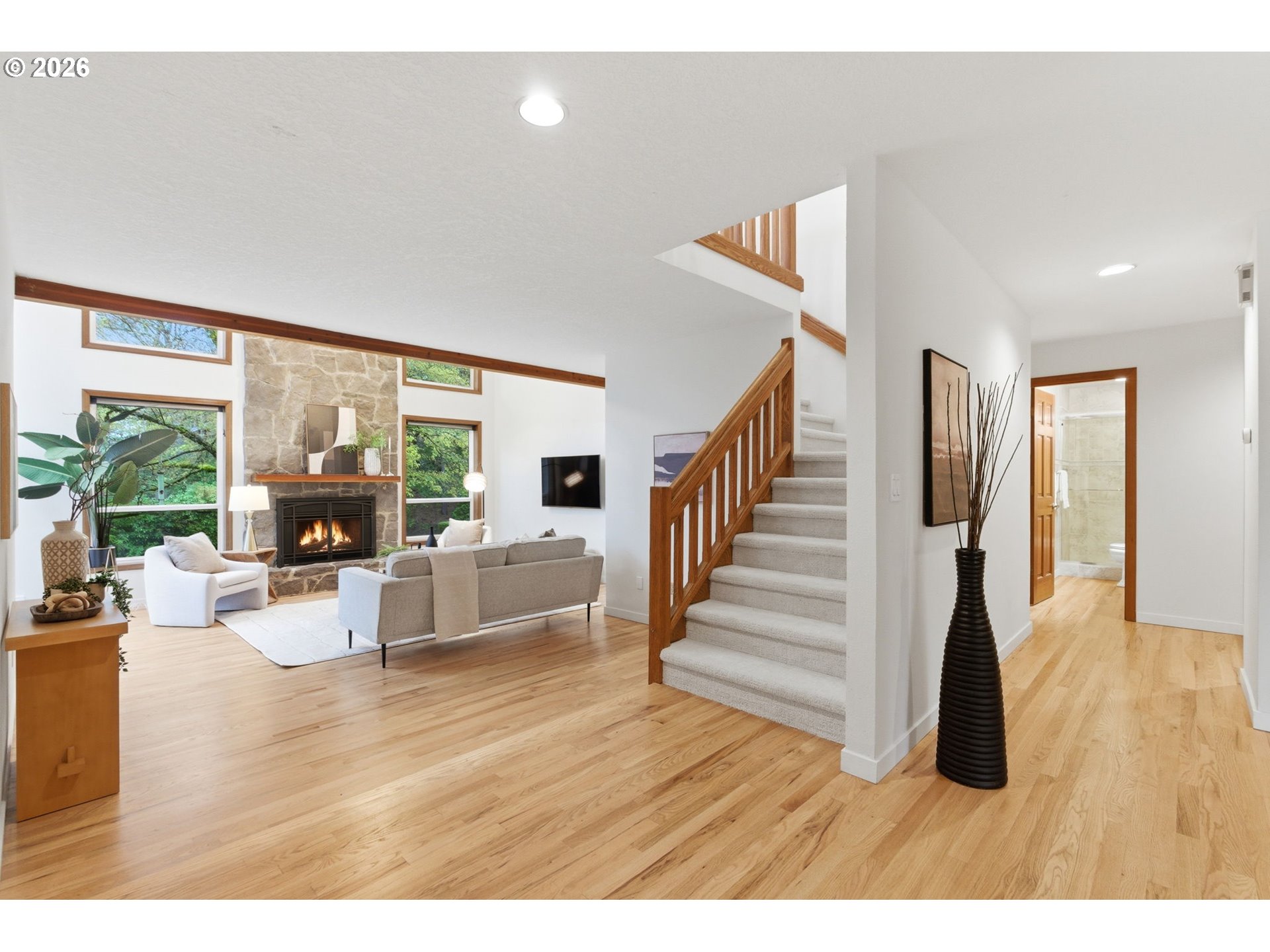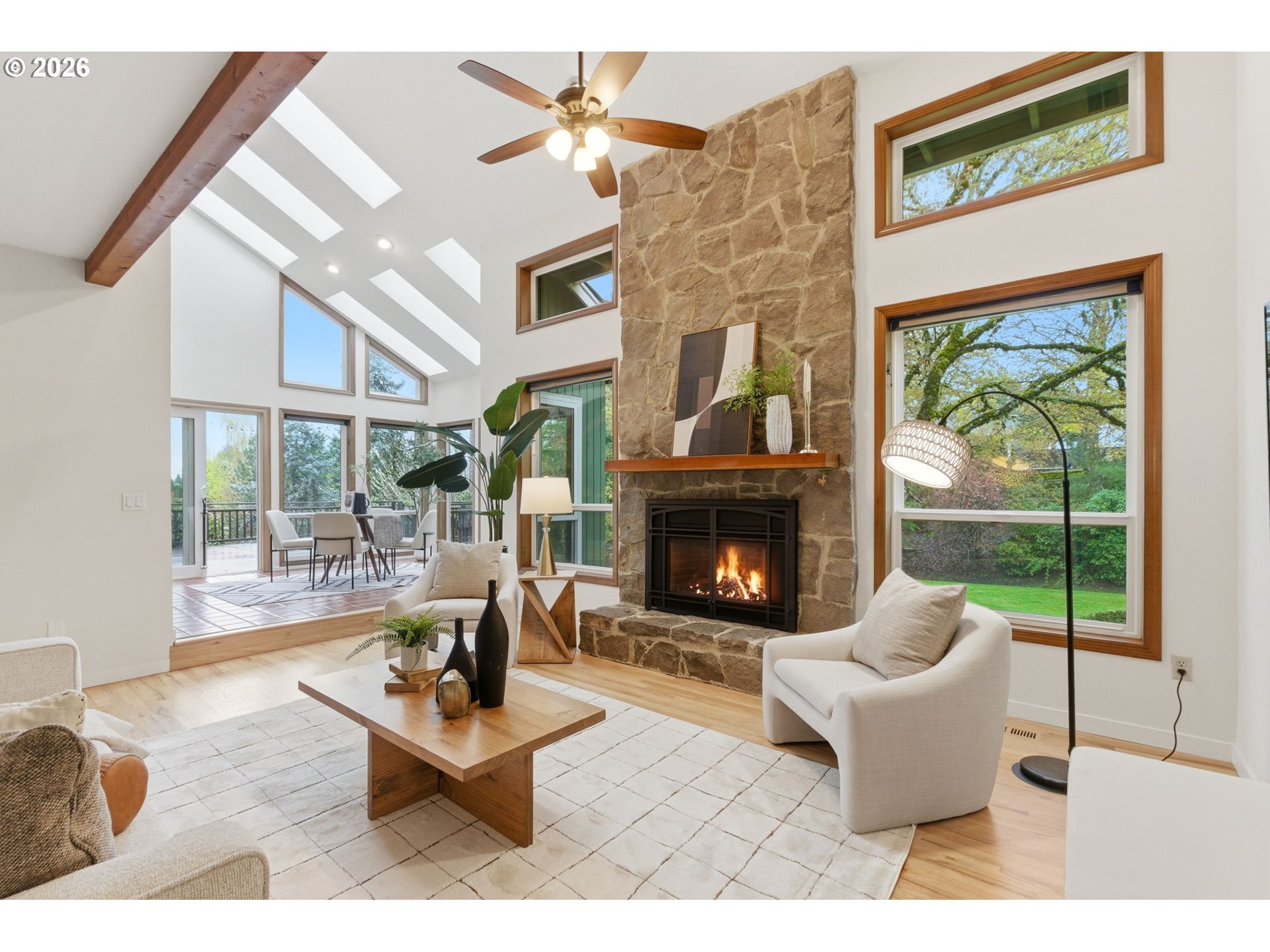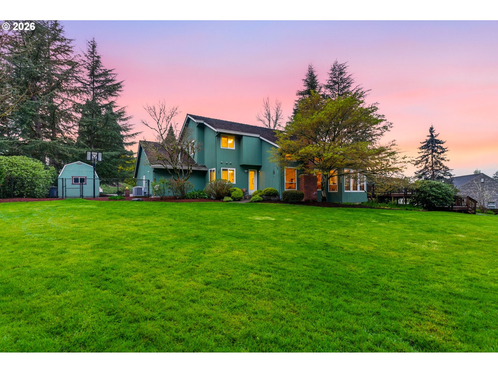 Experience Pacific Northwest Contemporary living on a rare oversized .69-acre lot tucked within a unique neighborhood of beautiful estate properties, a setting seldom found within city limits. Surrounded by large homesites and mature landscaping, this Bull Mountain property offers exceptional space, privacy, and character. The home features 4 bedrooms and 3 full bathrooms, including a main-level bedroom or office with adjacent full bath, ideal for guests or multi-generational living. A distinctive vaulted floorplan creates an open, airy feel, complemented by an upper loft/bonus area perfect for a game room, workspace, or play area. Recent updates include brand-new carpet, updated water heater, newer windows and front doors, expanded and refinished oak flooring, and a beautifully designed paver fire pit area for outdoor entertaining. Enjoy the incredible, fully fenced backyard, featuring a large deck, expansive lawn, pear, apple, and plum trees, flowers, garden beds, and a large tool shed, all offering endless possibilities for relaxation or gardening. The oversized 4-car garage includes 3 newer doors with tandem parking in one bay, providing abundant storage and flexibility. Washer, dryer, and 2 refrigerators are included. Located just minutes from great shopping, dining, freeway access, and wine country, this exceptional property combines peaceful estate-style living with everyday convenience, all with no HOA.