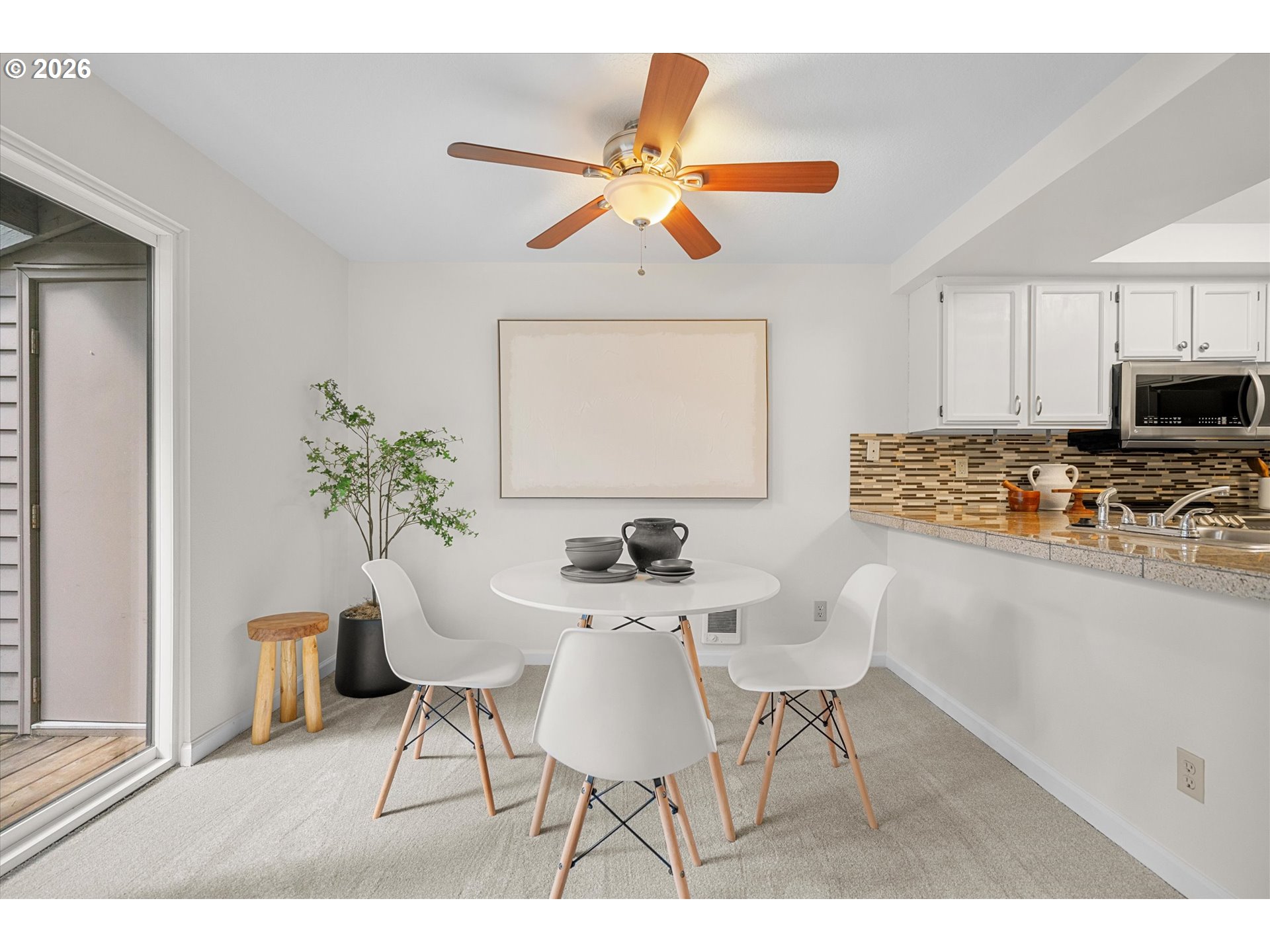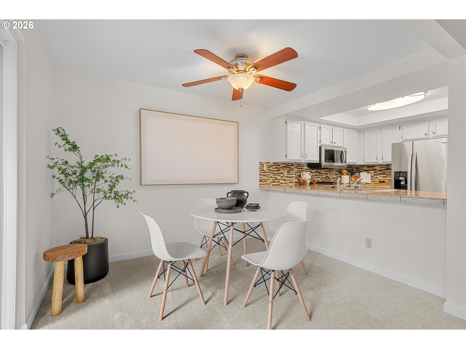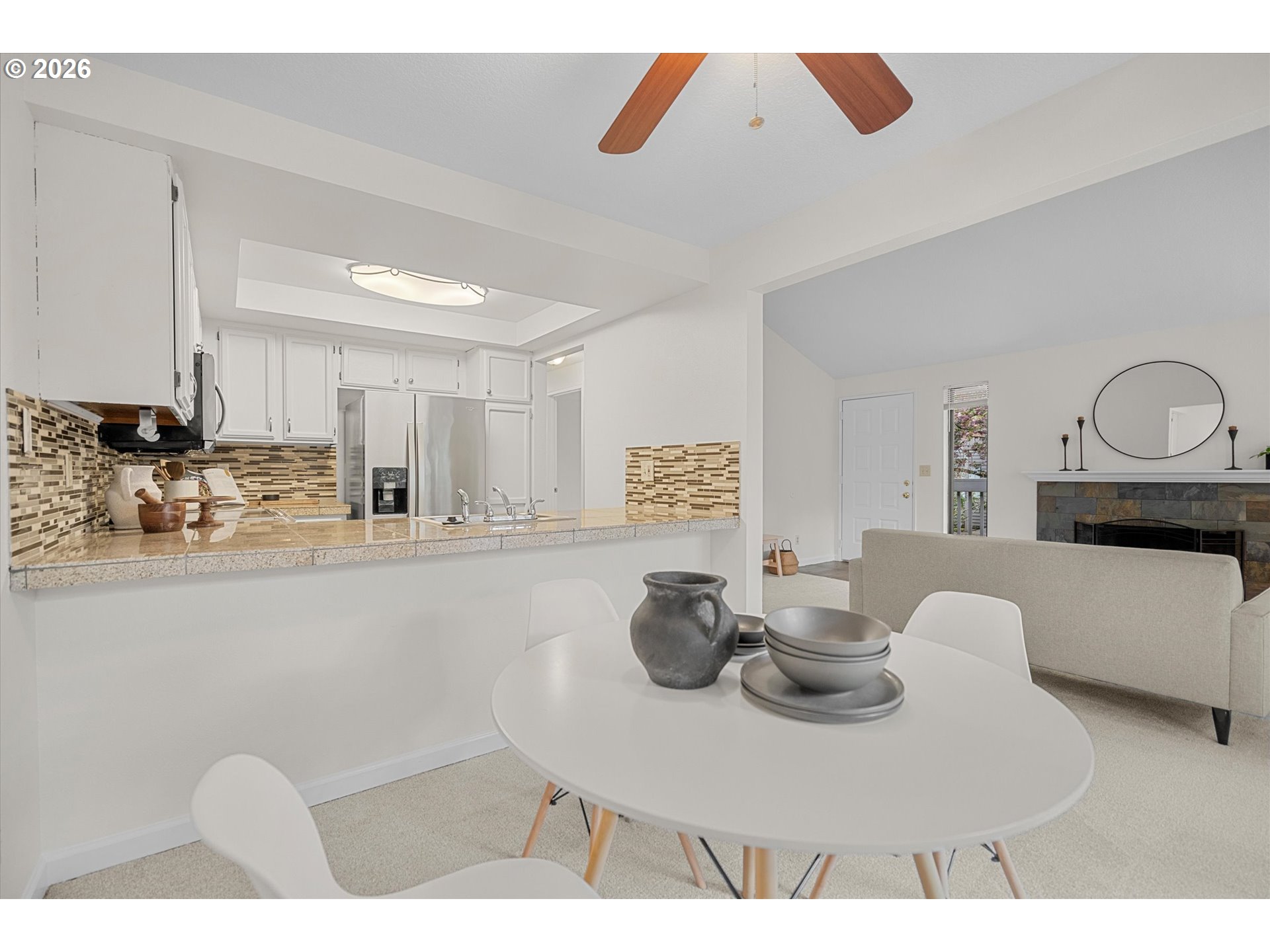 This one just feels right the moment you walk in. A super charming, updated upper-level condo in Murray Park that lives larger than you’d expect, with a smart 2 bed, 2 bath layout and an easy, natural flow.The kitchen offers plenty of counter space, stainless steel appliances, and an eat-in bar—functional and comfortable for everyday living. The primary suite has been nicely updated with a walk-in shower, tile surround, tile floors, and a refreshed vanity, while travertine finishes carry through the bathrooms.A large slider opens to a spacious, private deck overlooking trees—a great extension of the living area and a quiet place to unwind.With brand new carpet, fresh interior paint, and professionally cleaned throughout, it’s move-in ready and low-maintenance. All appliances are included, including the refrigerator and washer/dryer. All in a convenient location—just minutes to Nike, Washington Square, Cedar Hills, and everyday shopping and dining.