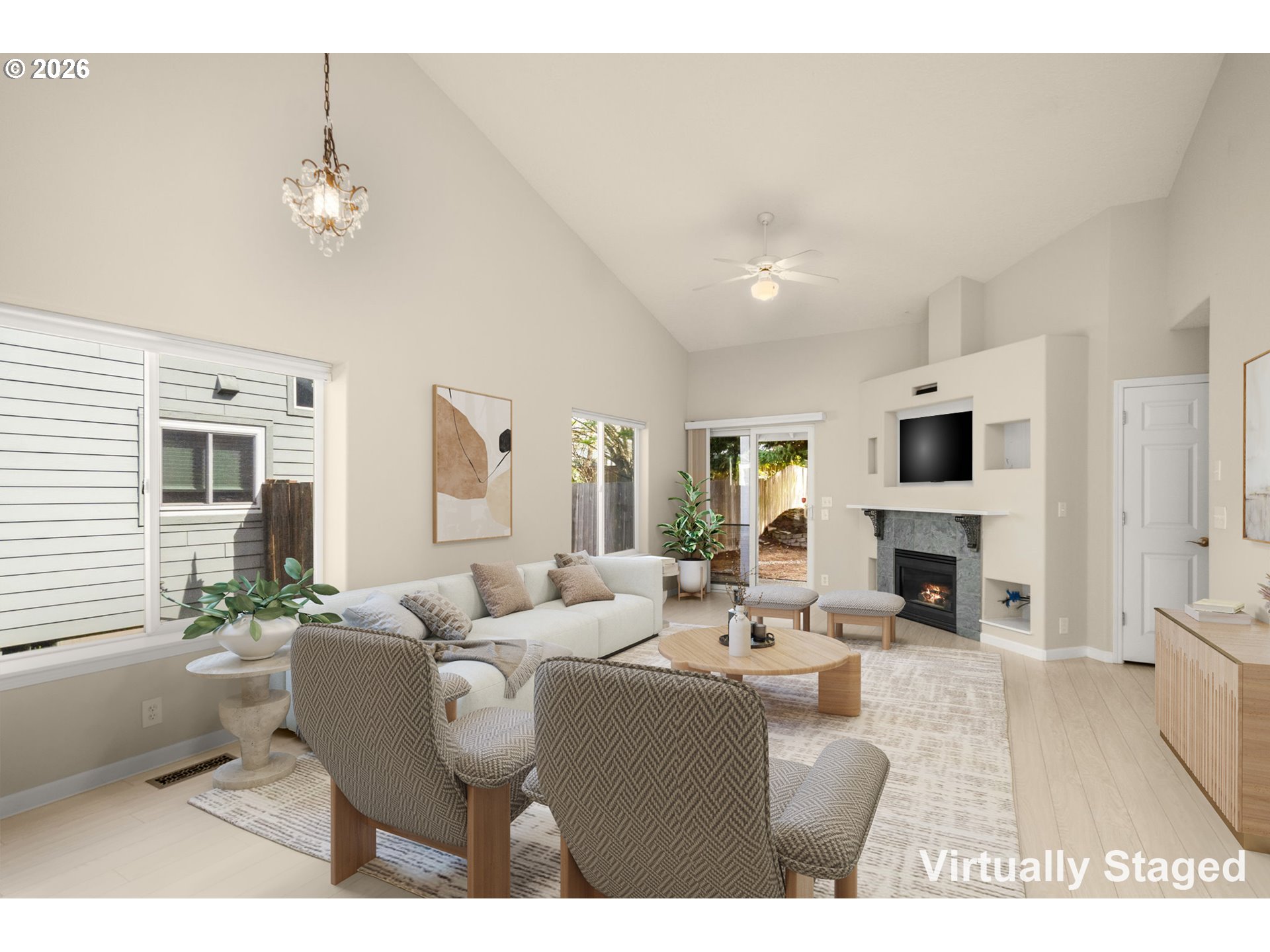 Experience effortless single-level living in this meticulously maintained 3-bedroom, 2-bath residence in Hillsboro, offering 1,519 square feet of true move-in-ready comfort. The thoughtfully designed open-concept floor plan is enhanced by durable laminate flooring that flows seamlessly throughout the home. The living area serves as the heart of the home, featuring a cozy gas fireplace—perfect for both everyday living and entertaining. Recent updates include new tile flooring in the bathrooms, along with major system improvements such as a newer HVAC system, A/C, all new ductwork entirely replaced in 2025, roof (2021), and vapor barrier (2021) —providing peace of mind for years to come. Step outside to a covered patio ideal for year-round enjoyment, whether relaxing or hosting guests. The fully fenced yard offers added privacy and functionality. Located close to tech employers, amenities, shopping, parks and the Rock Creek trails. Embrace convenient living in a prime location where all the heavy lifting is already done. A must see!