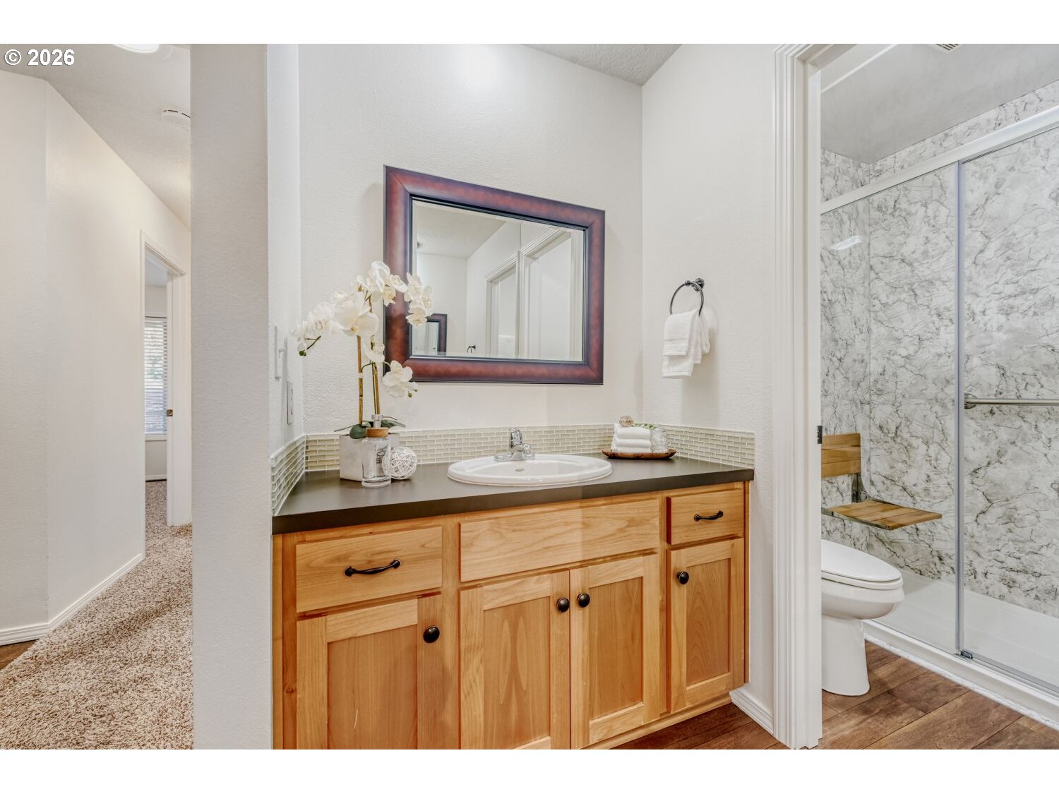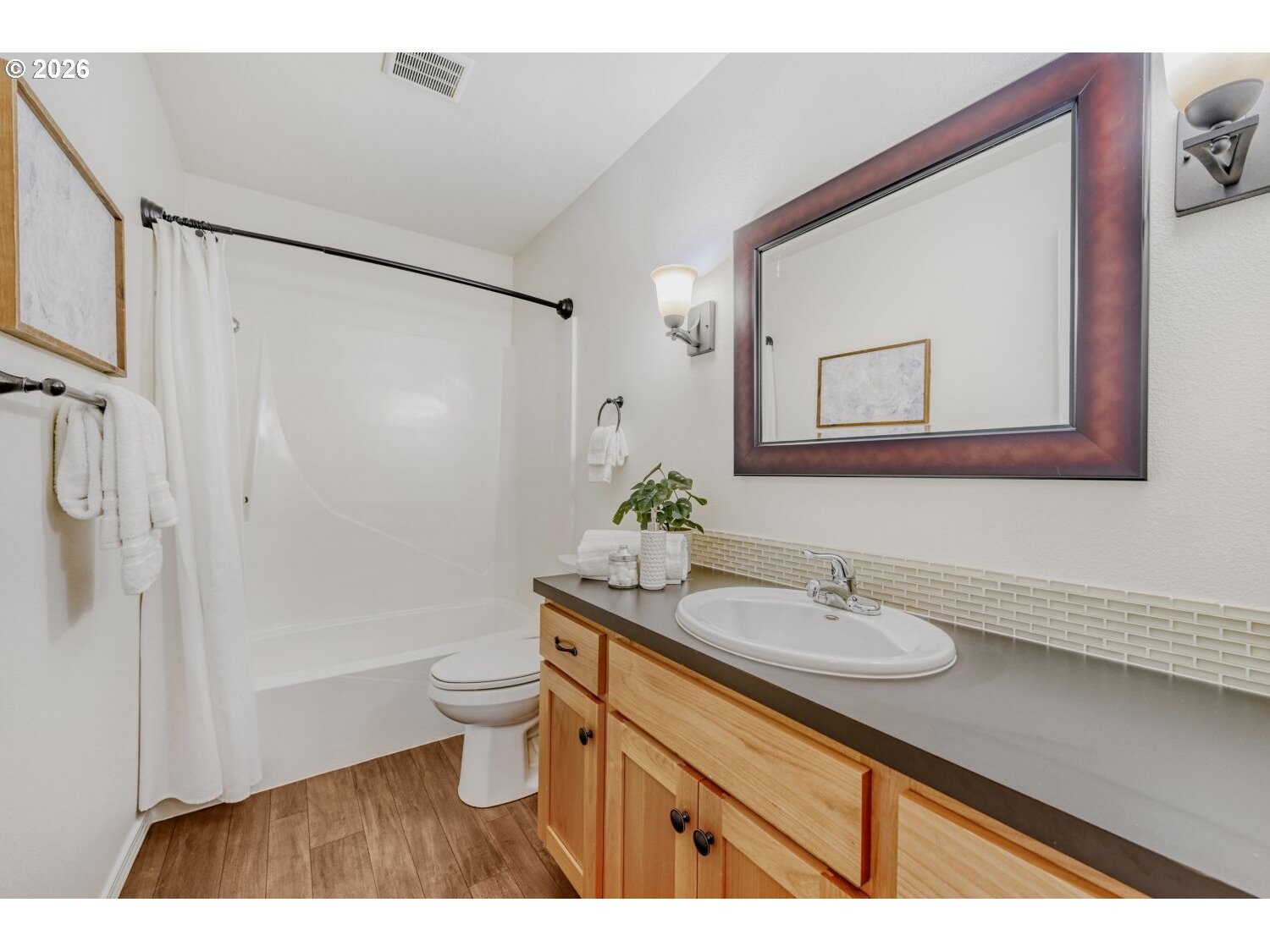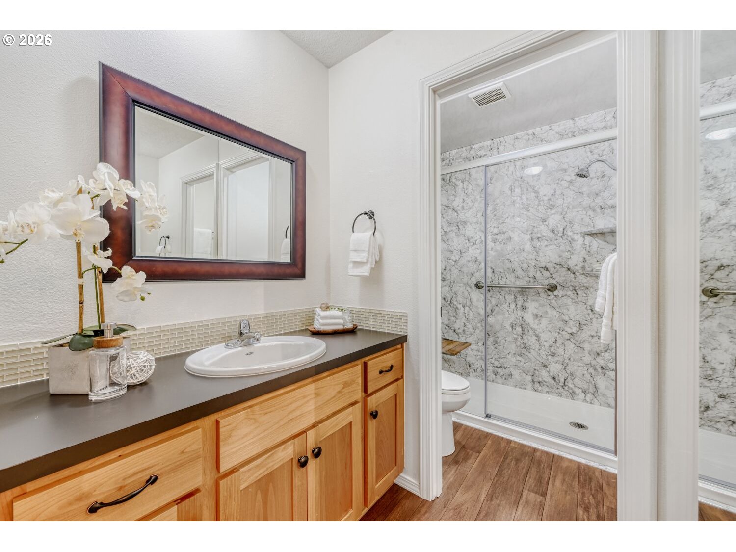 Gorgeous turnkey ranch in desirable Hartwood Hylands neighborhood! Situated on a peaceful loop street, this northwest contemporary has been immaculately maintained and fully updated. Gourmet kitchen offers shaker-style cabinets, quartz countertops, full-height tile backsplash, stainless steel appliances, and dining nook. It's open to the vaulted family room, featuring a floor-to-ceiling two-way stone fireplace and built-ins. Oversized primary suite offers double closets and an updated bathroom with new walk-in shower. High-quality construction including vaulted ceilings with exposed beams, large room sizes, and abundant window space for great natural light. Numerous updates including white doors and millwork, all-new interior paint, updated fixtures and hardware, and more! Fully fenced backyard boasts large patio, tool shed, mature landscaping, and exceptional privacy. Outstanding location, just steps from numerous THPRD parks and trails!