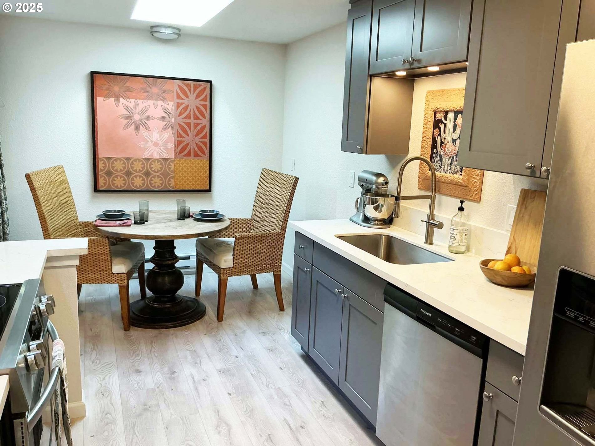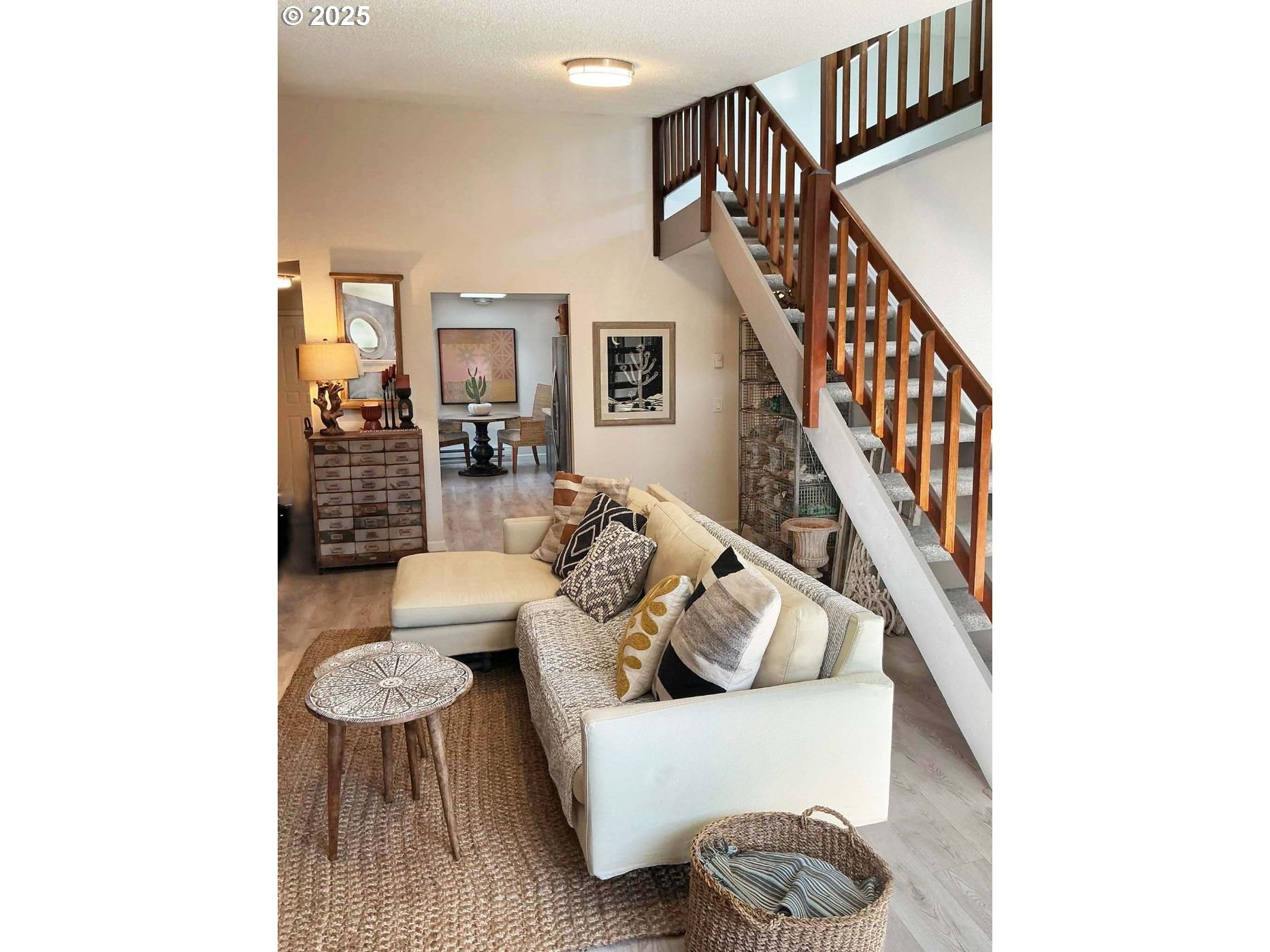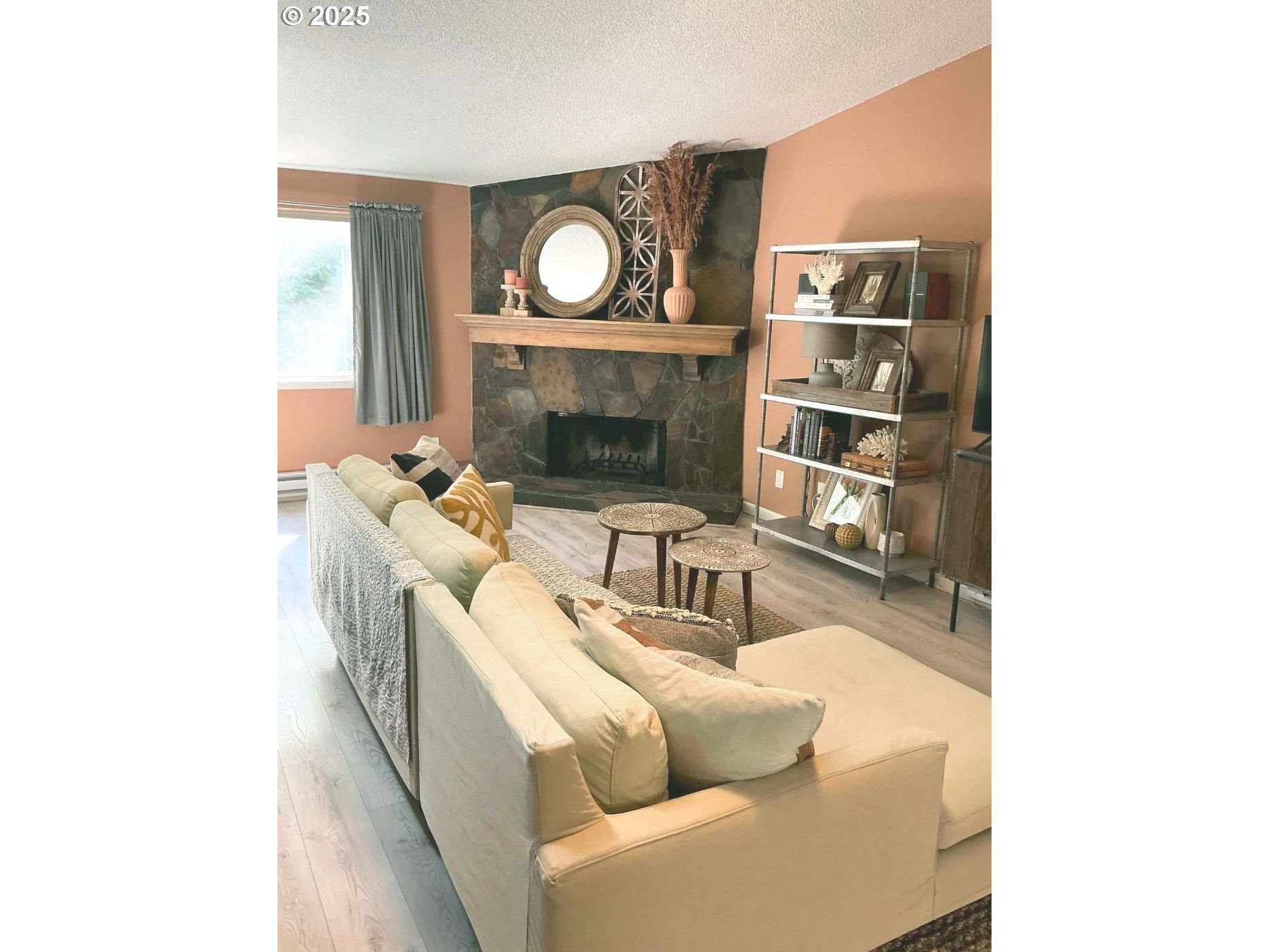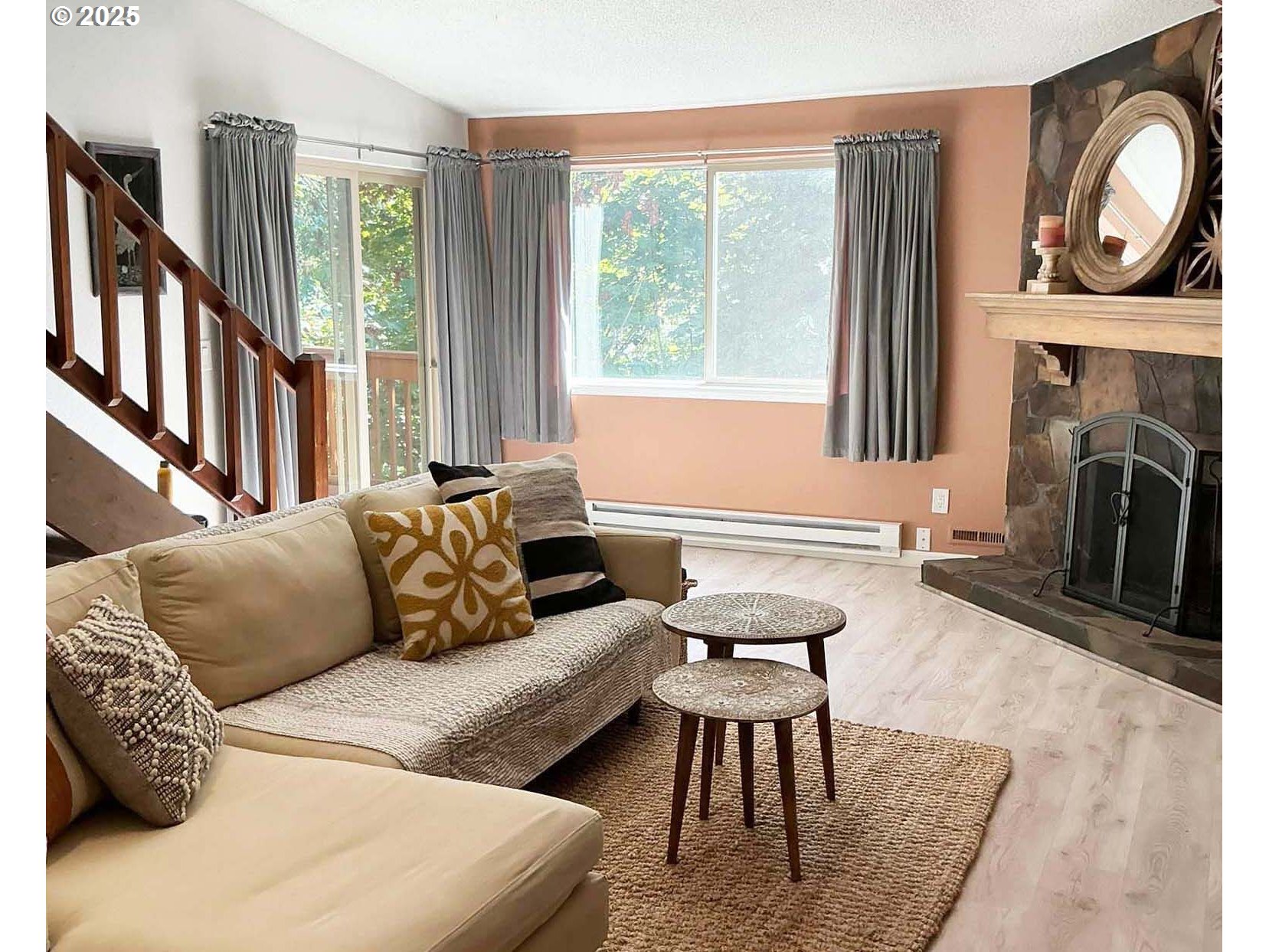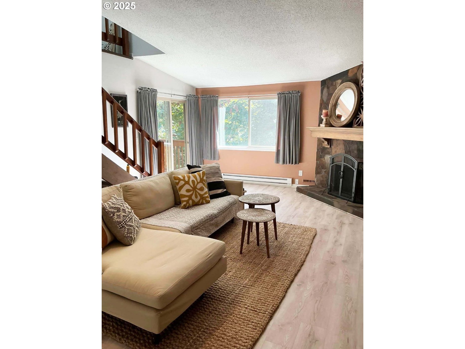 Stunning second floor remodeled condo in Tigard is beautifully updated with a modern kitchen, skylight, hanging vent, stainless steel appliances and marble countertops. Vaulted living room has original stone wood burning fireplace, light laminate wood flooring and opens up to stairs leading to a bonus loft room with a skylight and sunny window. Could serve as third bedroom or office.Enjoy a quiet covered balcony that looks out onto lush mature trees and a woodsy pathway around back of unit. Updated bathroom with tub/shower and vanity. Additional vanity with closet off master bedroom. Both bedrooms have large windows and gray carpet. Washer and dryer are included in hallway laundry room. Huge storage area with heater on lower floor of condo.One car detached garage and one off street parking spot. HOA is $547 per month and includes landscaping, leaf and snow removal, exterior maintenance, sewer, water and trash.Downtown Tigard is minutes away with great restaurants, shopping and local charm.
