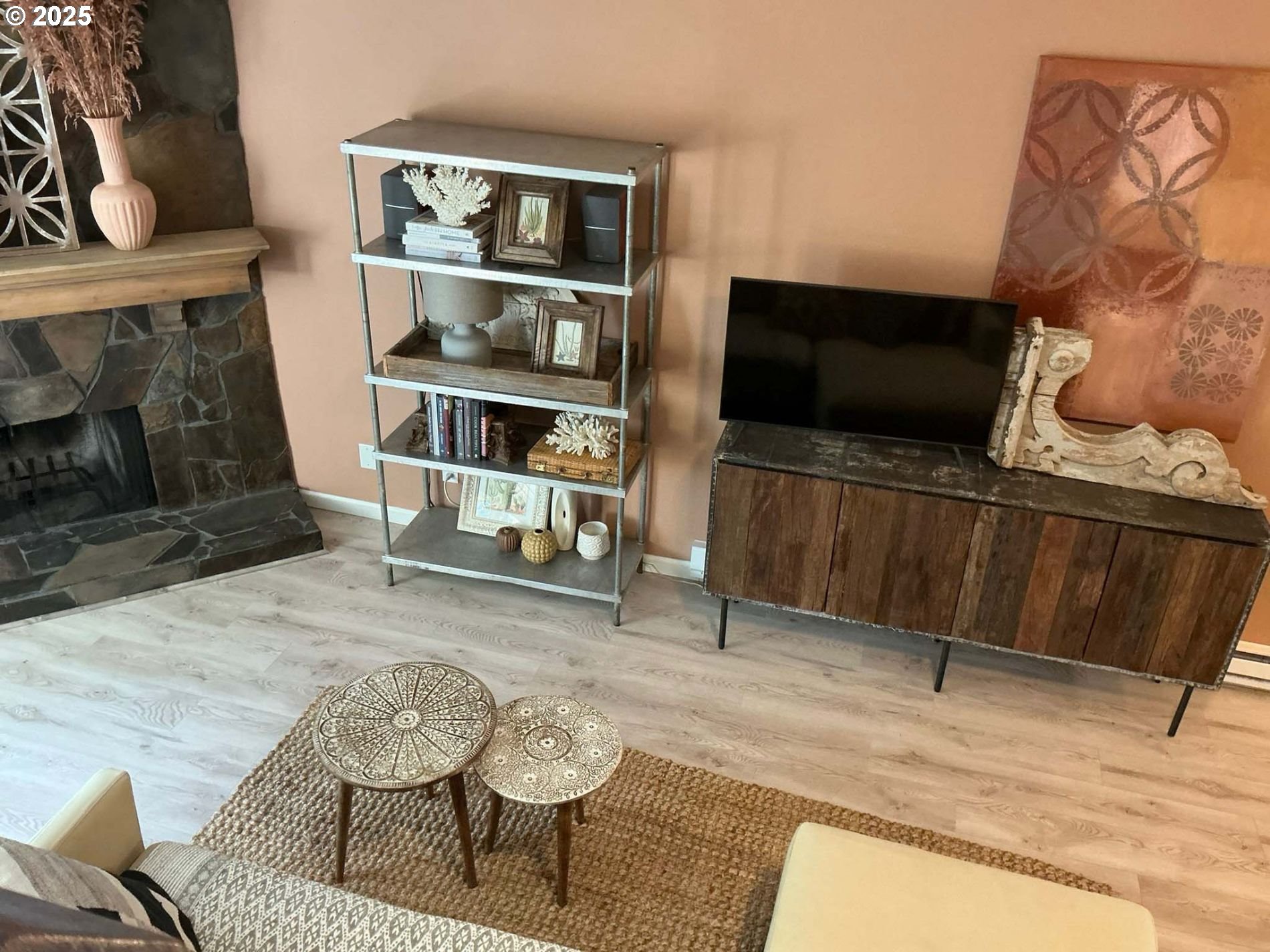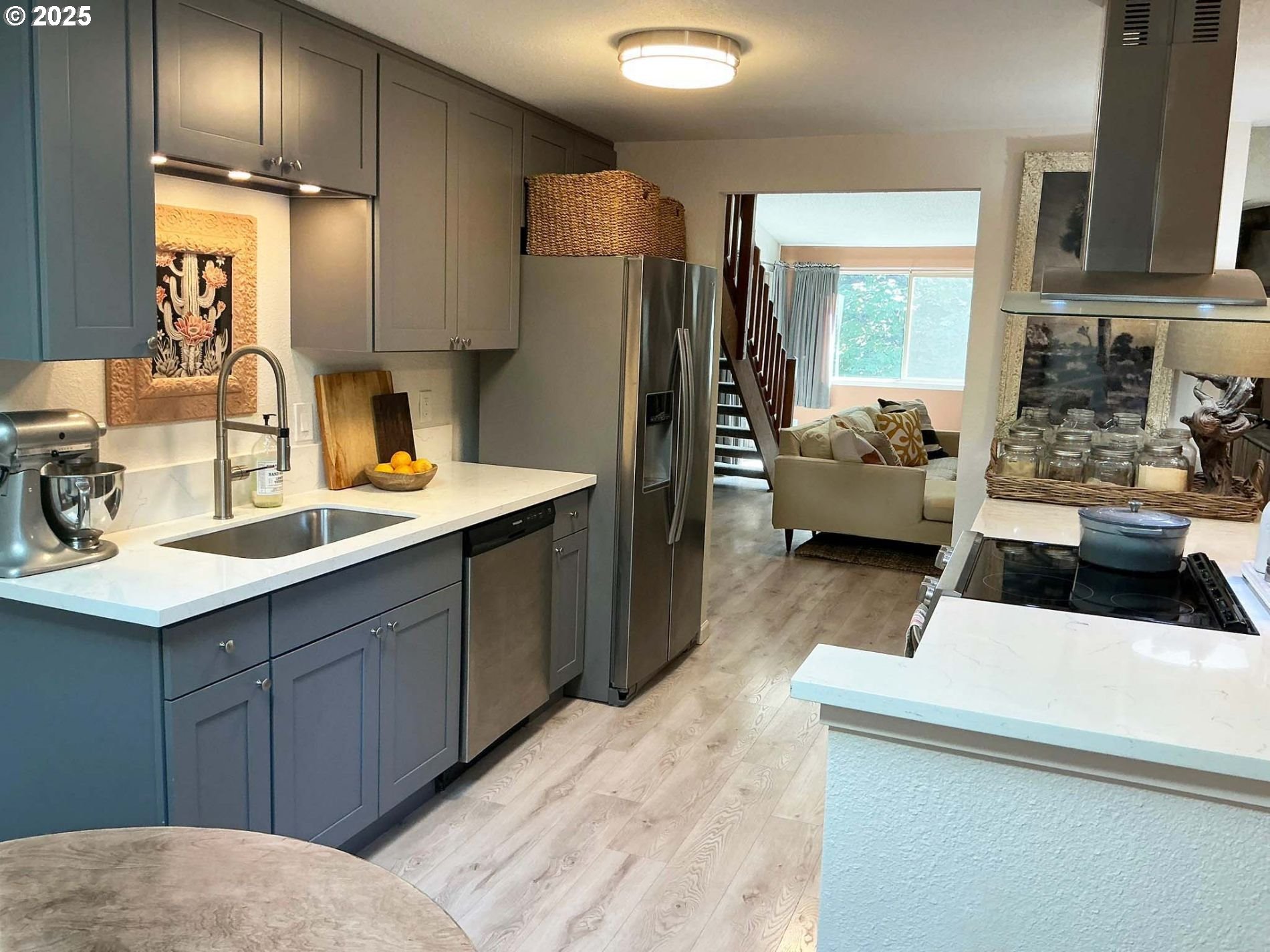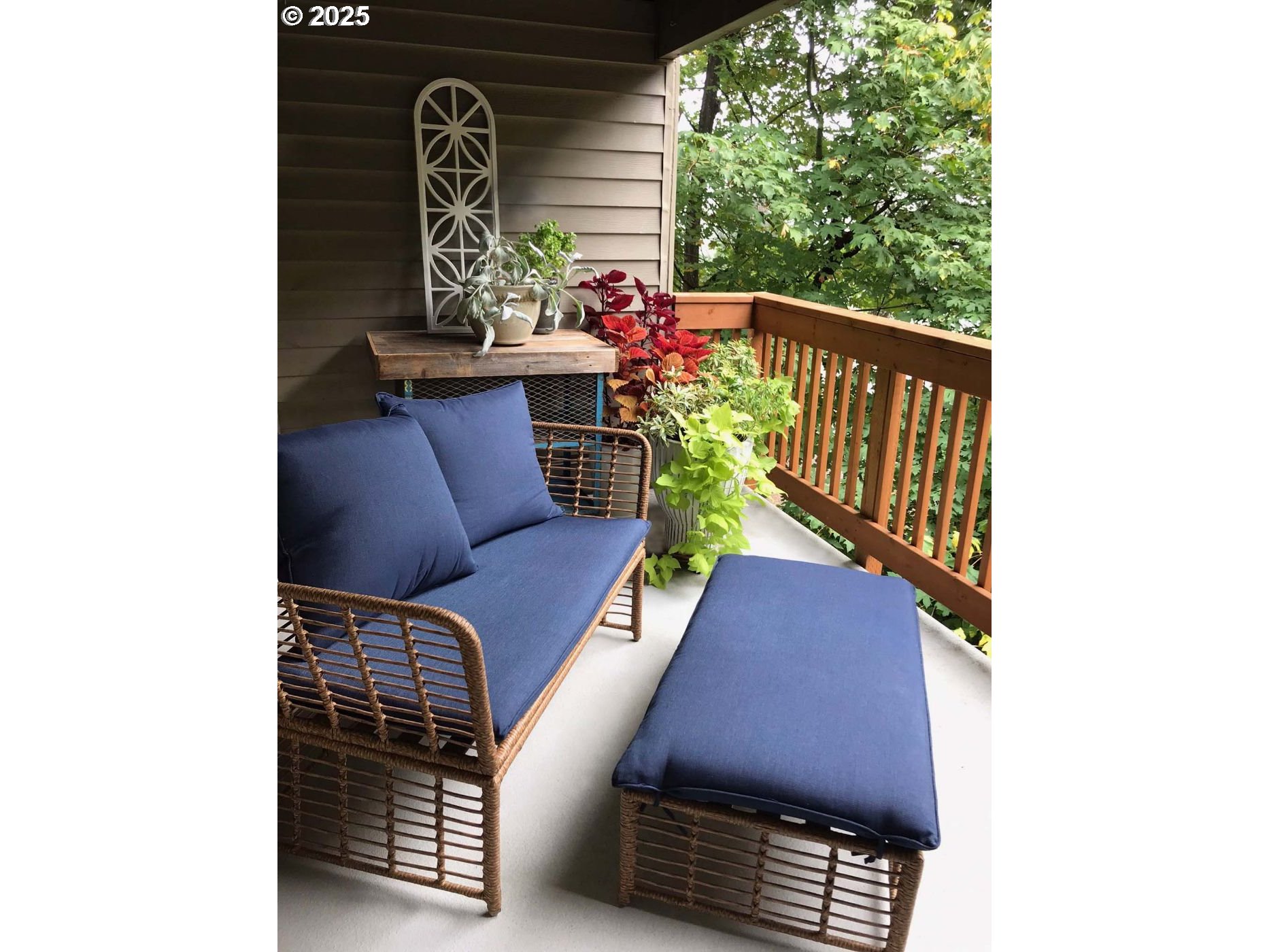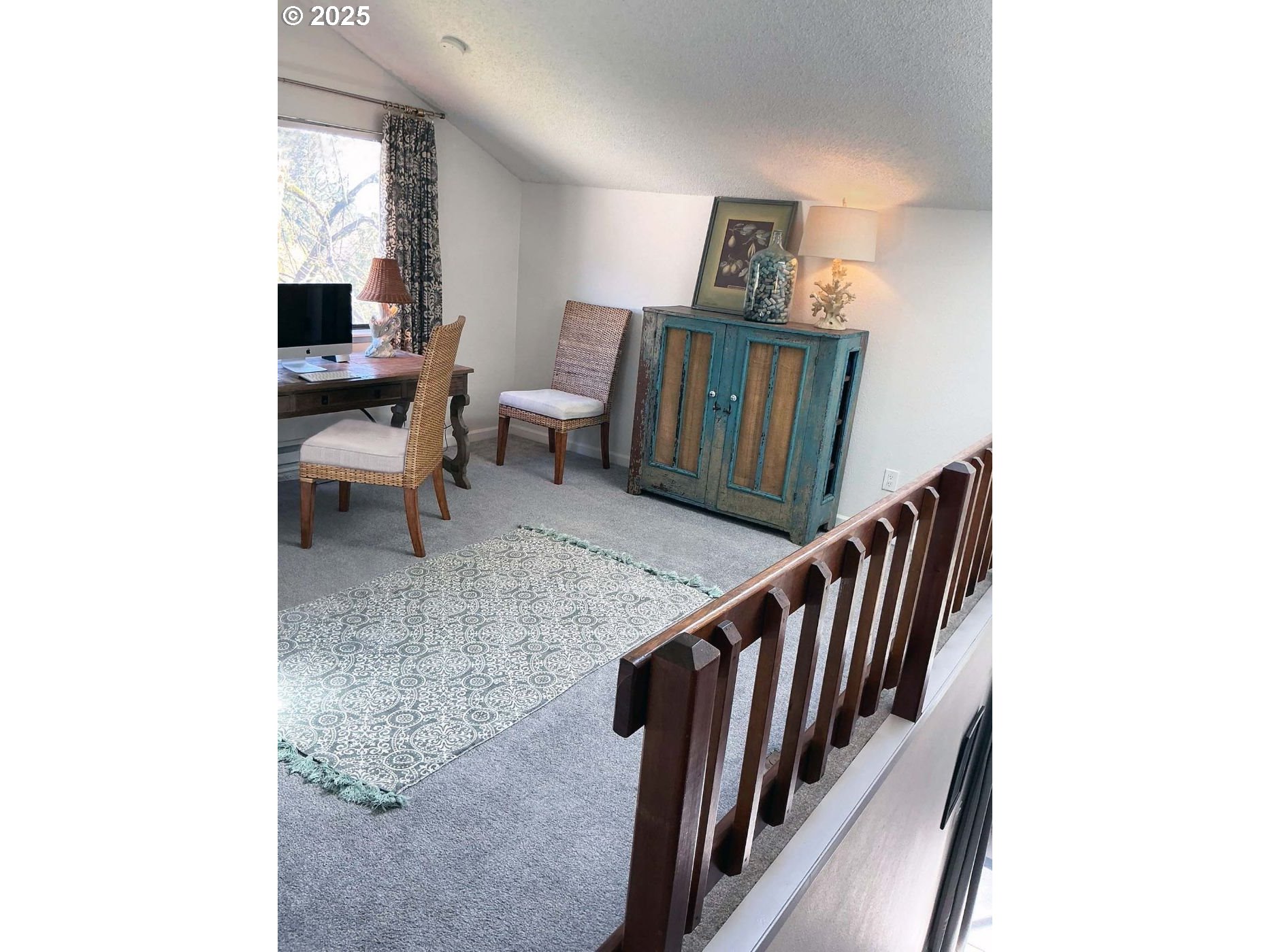 Stunning second floor remodeled condo in Tigard is beautifully updated with a modern kitchen, skylight, hanging vent, stainless steel appliances and marble countertops. Vaulted living room has original stone wood burning fireplace, light laminate wood flooring and opens up to stairs leading to a bonus loft room with a skylight and sunny window. Could serve as third bedroom or office.Enjoy a quiet covered balcony that looks out onto lush mature trees and a woodsy pathway around back of unit. Updated bathroom with tub/shower and vanity. Additional vanity with closet off master bedroom. Both bedrooms have large windows and gray carpet. Washer and dryer are included in hallway laundry room. Huge storage area with heater on lower floor of condo.One car detached garage and one off street parking spot. HOA is $547 per month and includes landscaping, leaf and snow removal, exterior maintenance, sewer, water and trash.Downtown Tigard is minutes away with great restaurants, shopping and local charm.