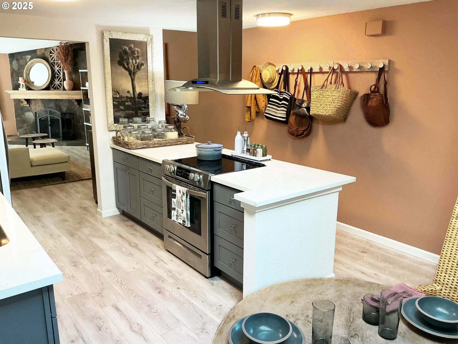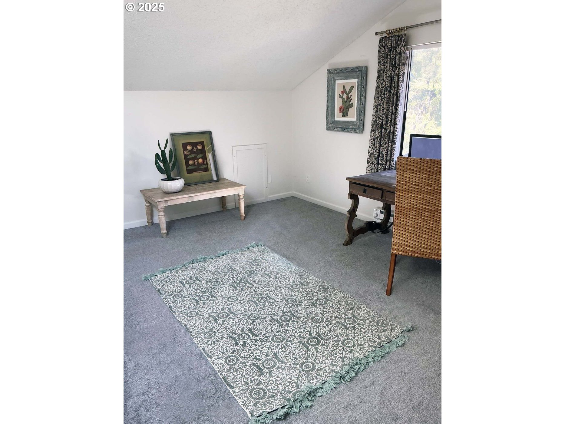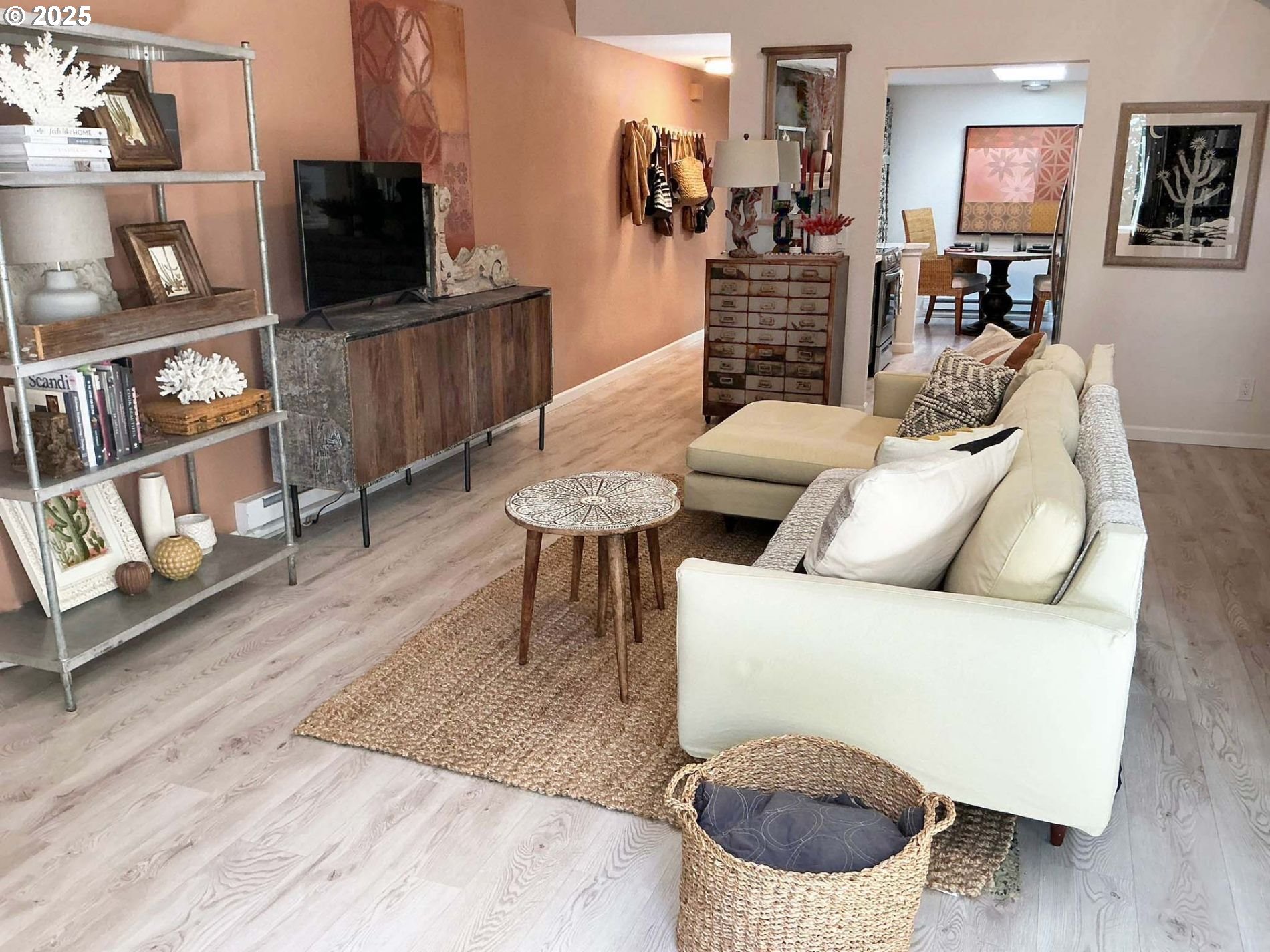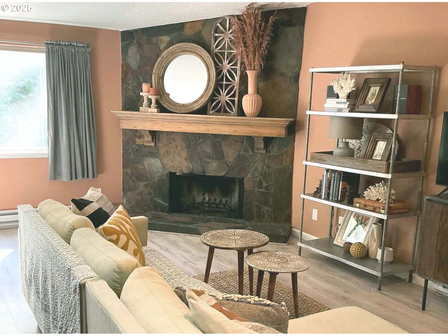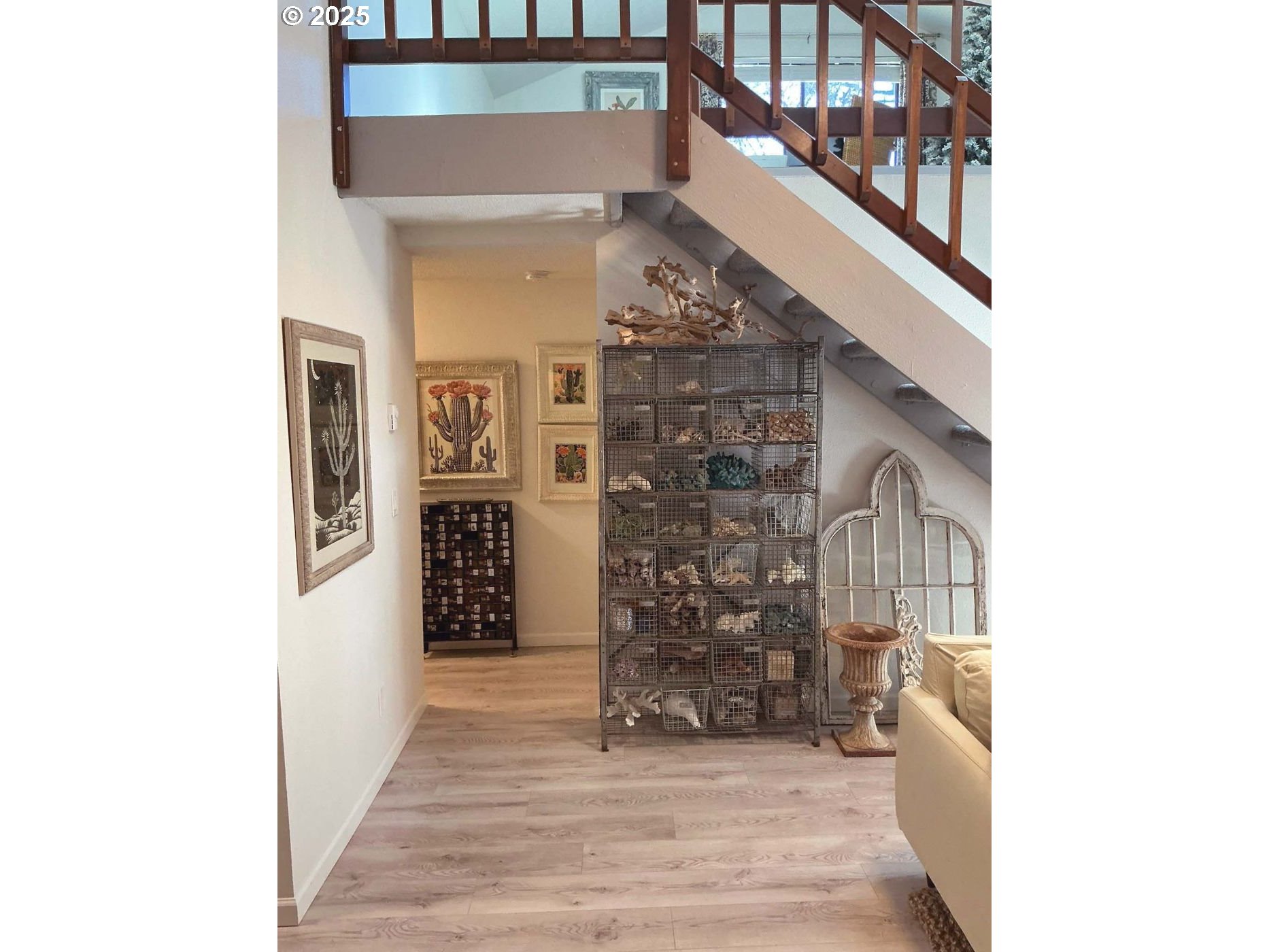 Stunning second floor remodeled condo in Tigard is beautifully updated with a modern kitchen, skylight, hanging vent, stainless steel appliances and marble countertops. Vaulted living room has original stone wood burning fireplace, light laminate wood flooring and opens up to stairs leading to a bonus loft room with a skylight and sunny window. Could serve as third bedroom or office.Enjoy a quiet covered balcony that looks out onto lush mature trees and a woodsy pathway around back of unit. Updated bathroom with tub/shower and vanity. Additional vanity with closet off master bedroom. Both bedrooms have large windows and gray carpet. Washer and dryer are included in hallway laundry room. Huge storage area with heater on lower floor of condo.One car detached garage and one off street parking spot. HOA is $547 per month and includes landscaping, leaf and snow removal, exterior maintenance, sewer, water and trash.Downtown Tigard is minutes away with great restaurants, shopping and local charm.