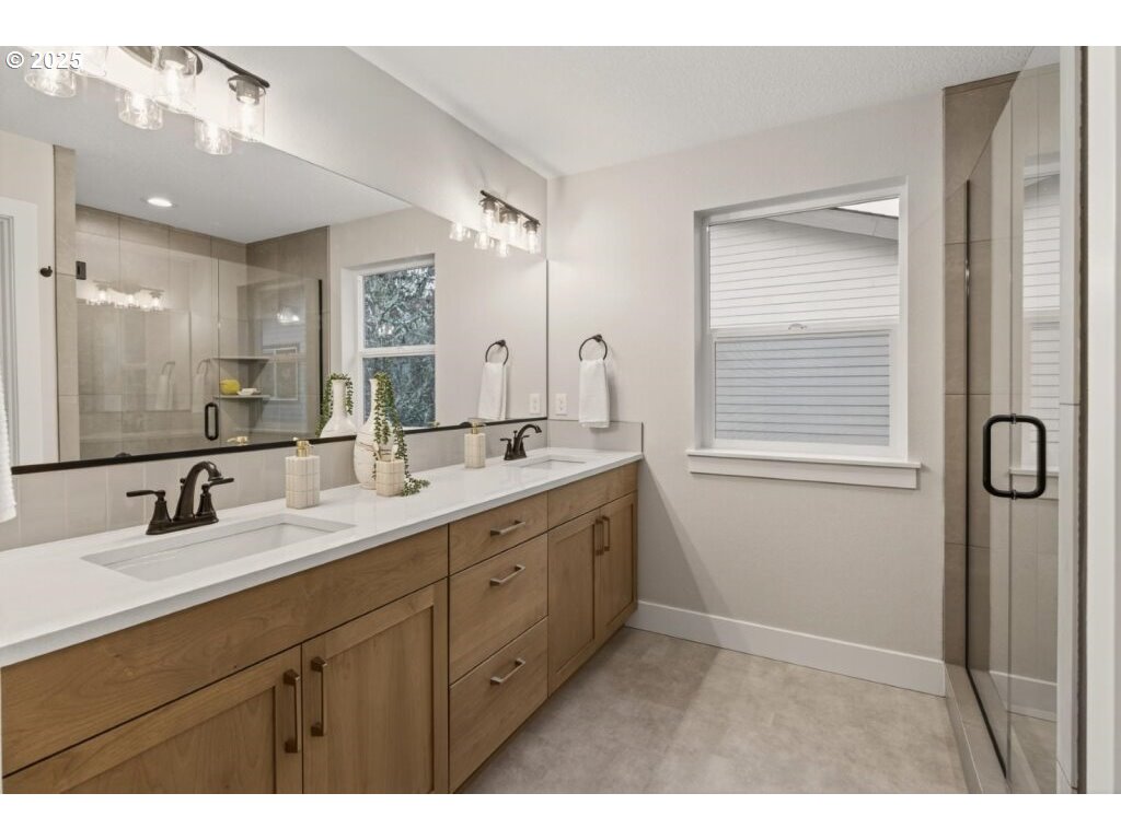 Experience refined living in this move-in ready, professionally staged masterpiece nestled in Tigard’s premier River Terrace Crossing community at Bull Mountain. Ideally situated for easy access to regional employment hubs, this neighborhood offers a sophisticated lifestyle defined by scenic trails, manicured green spaces, and local shopping. This spacious 4-bedroom, 3.5-bath residence is designed for versatility, featuring two primary suites—including a flexible main-floor option—plus an upper-level loft and a main-floor powder room.The heart of the home is an extended gourmet kitchen outfitted with 42-inch custom-stained shaker cabinets, champagne bronze hardware, slab quartz countertops, and a full suite of Frigidaire Professional Series appliances (range stove, built in microwave, and dishwasher). The adjacent great room, anchored by a shiplap-accented masonry gas fireplace, flows seamlessly to an outdoor oasis. Enjoy ultimate privacy with no rear neighbors, as your fully fenced yard and landscaped grounds back directly to lush green space. Entertaining is effortless on the enhanced Trex deck and covered patio, which features a built-in BBQ gas line for year-round grilling. Modern essentials abound, including a full laundry room with a sink, a 3-car garage with a washer/dryer rough-in (complementing the interior hookups), Smart Home technology, and Air Condition. Protected by a comprehensive builder warranty. Excellent schools and convenient location for shopping, activities and more.
