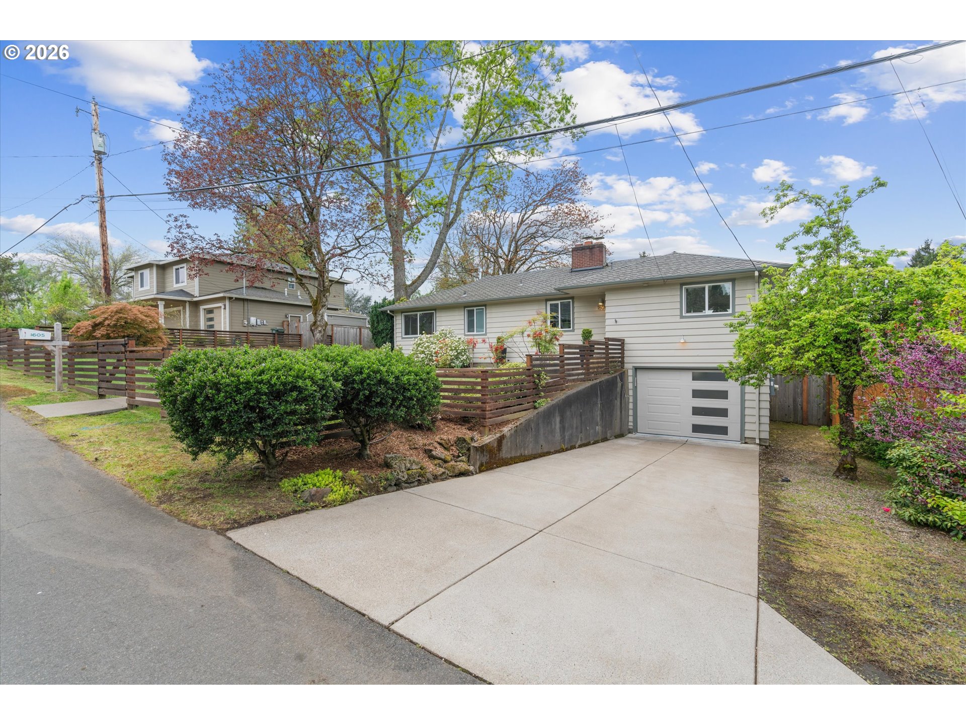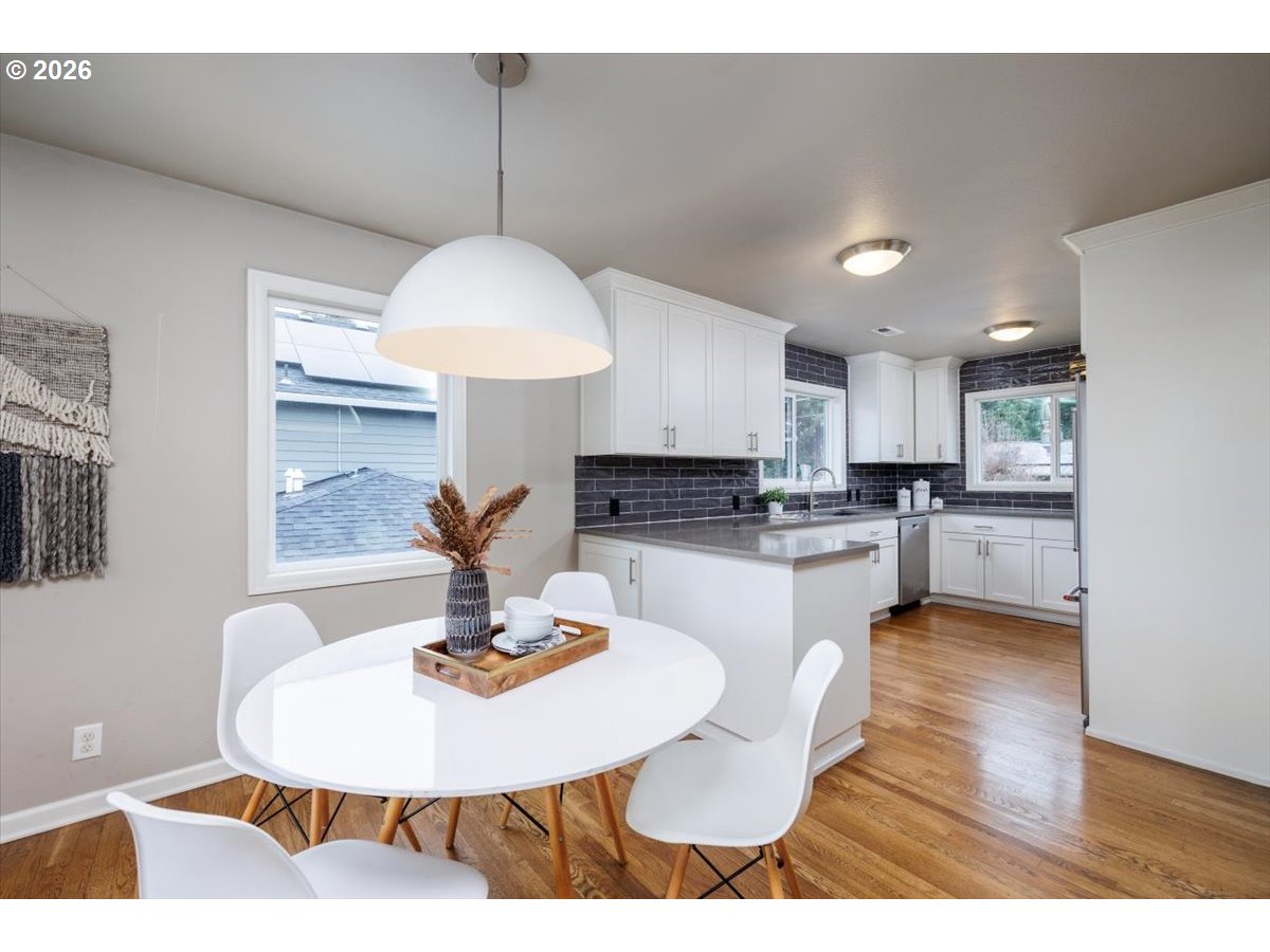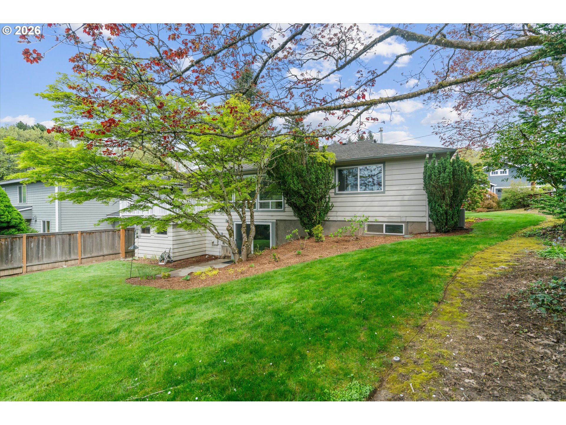 Tucked into the SW Hills with a coveted western exposure, this updated midcentury home offers a rare combination of character, comfort, and convenience. Set on a private terraced lot directly across from Catlin Gabel and steps from Cornell Farms, the location is as functional as it is desirable, with effortless access to I-5, Highway 217, and Highway 26. Inside, hardwood floors, a wood-burning fireplace framed by built-ins, and walls of west-facing windows create a warmth that feels genuinely lived-in. The modern kitchen flows into a sunny breakfast nook and opens to a great room that is bright, connected, and oriented toward the view. A spacious deck off the main living area extends everything outdoors, overlooking a fully fenced backyard with beautifully maintained landscaping. Two bedrooms and an updated full bath complete the main level. Downstairs, a flexible third bedroom or home office, a second full bath, and a family room with a second fireplace and direct backyard access offer room to breathe and spread out. A one-car garage with generous mudroom storage rounds out this exceptionally well-appointed home. Welcome home